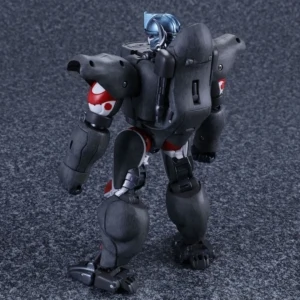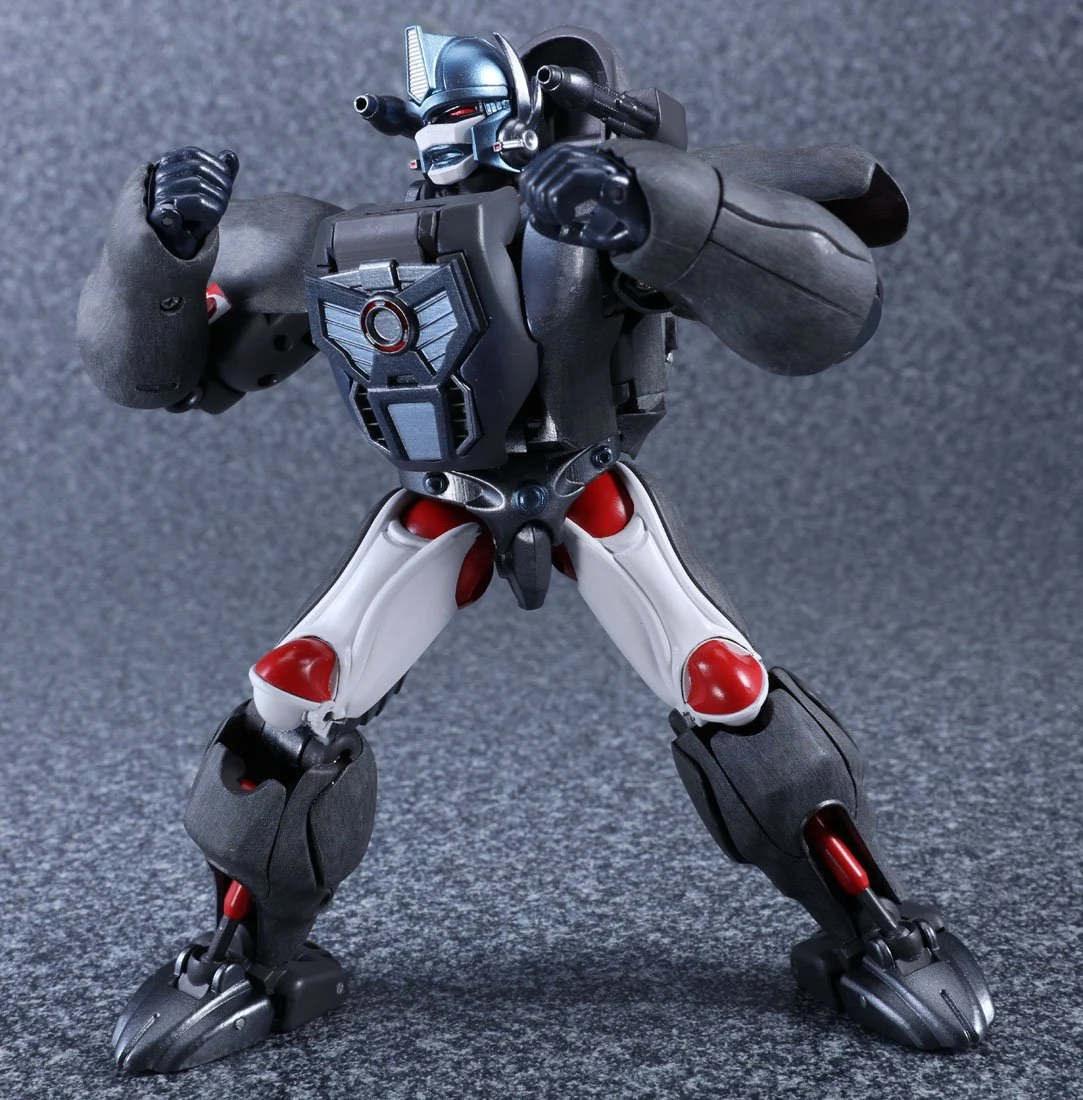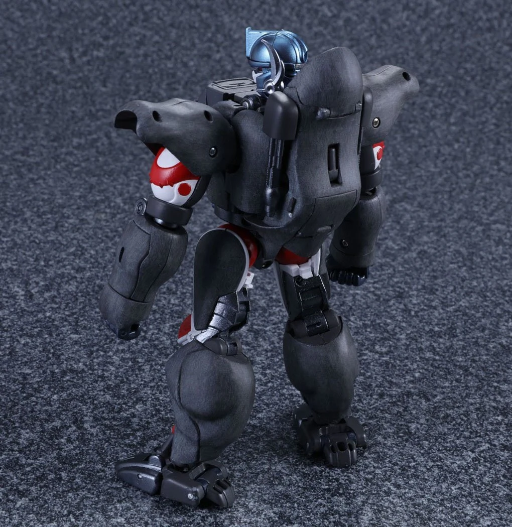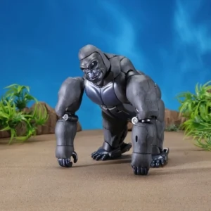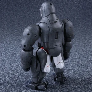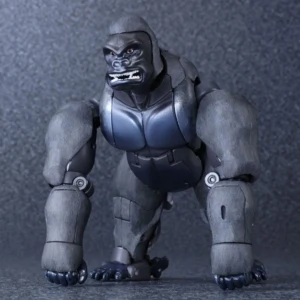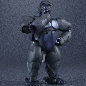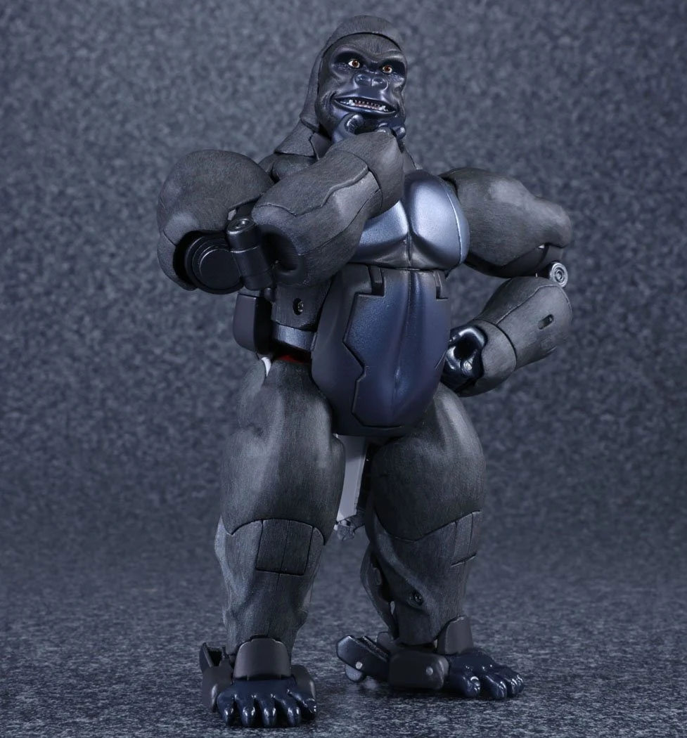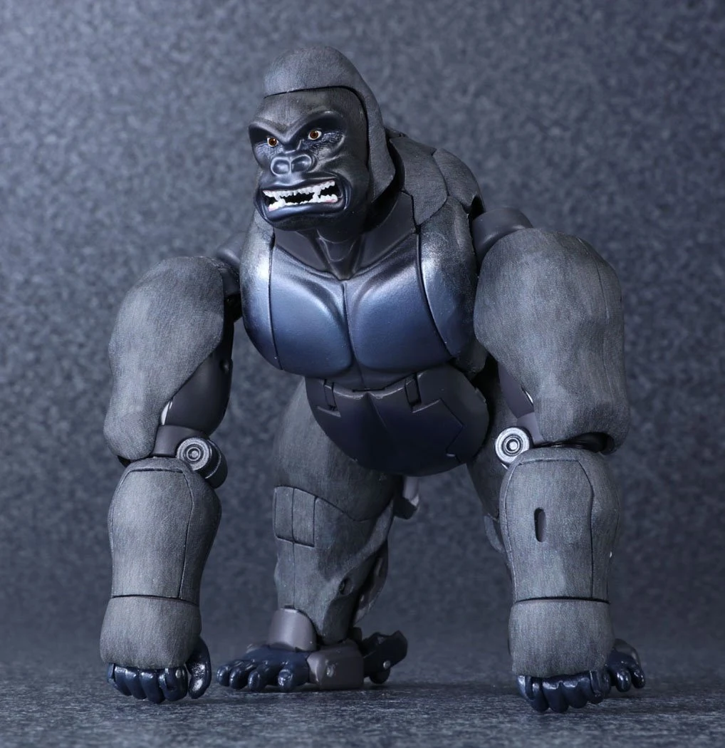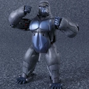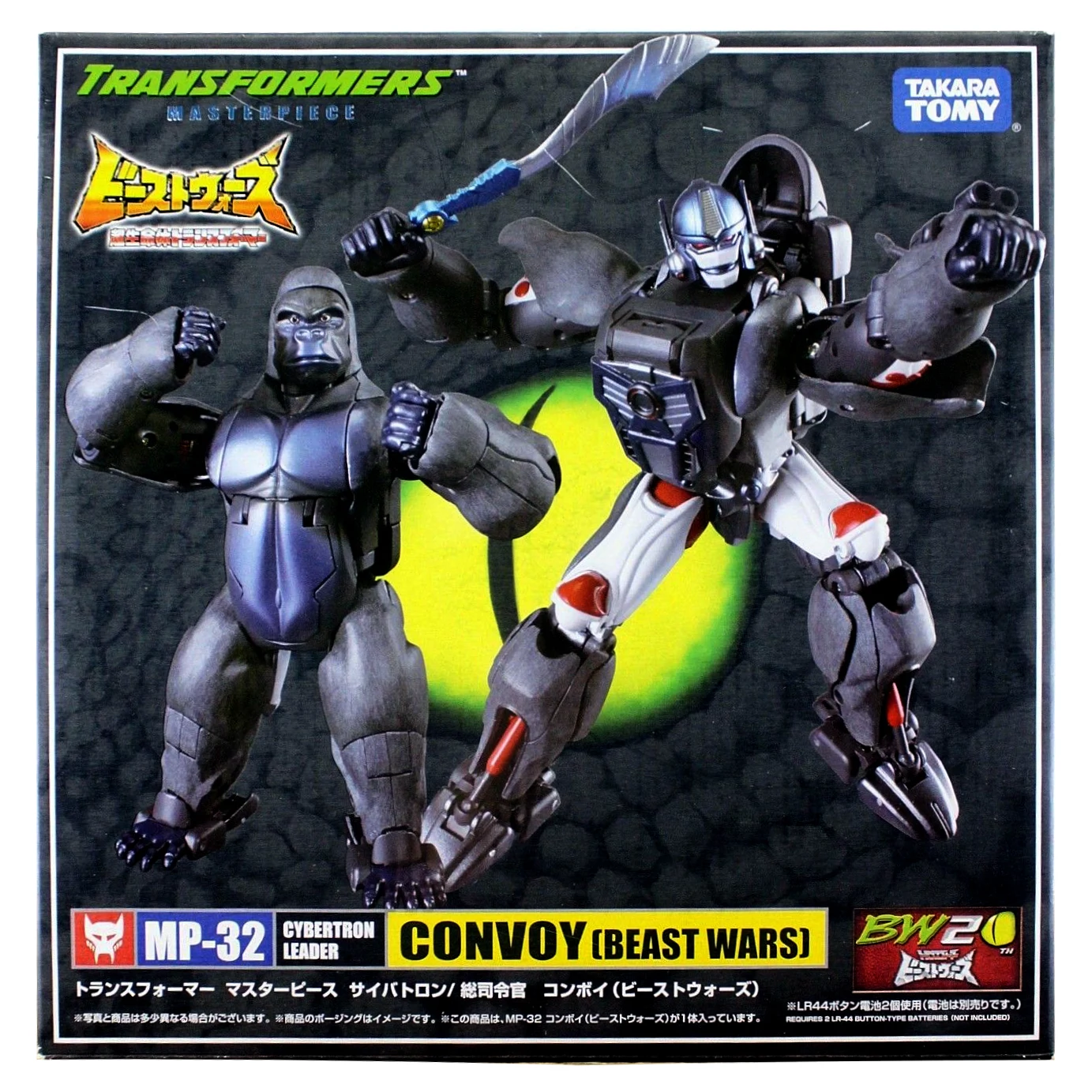 Released to celebrate Beast Wars's 20th anniversary, Masterpiece Convoy is a faithful recreation of the character as he appeared in the Mainframe animated series. Matching his original figure, Convoy has two "cyber blade" swords, which can now be stored on his back in robot mode. Each wrist has cartoon-accurate flip-out "plasma cannons", while his "mega blaster" shoulder cannons have also been recreated. In robot mode, a panel can rotate in his posterior to reveal his "convoy jet". Convoy has the new gimmick of light-up eyes. These are powered by two computer batteries stored in the beast mode head and activated by pressing down the robot mode head. They stay lit for about ten seconds. Convoy comes with three different gorilla faces: neutral; smiling and angry, and four different robot mode faces: open-mouthed; close-mouthed; smirking and original style mouthless faceplate. Masterpiece Optimus Primal is an inch or two smaller than his original Ultra Class toy, comparable to Beast Wars Neo Big Convoy. Not shown in the instructions is a peghole in the waist, designed to allow Convoy to be mounted on a flying stand. Another undocumented feature is a peg on his back, that allows Generations Rattrap to ride on his back by plugging the aforementioned peg in the hole that is normally used for weapon storage in beast mode. If bought in Asian countries outside of Japan, he also comes with a die-cast skull flail based on the one that came with the original toy. It comes packaged in a cardboard box designed to look like a crate of bananas.