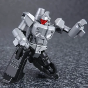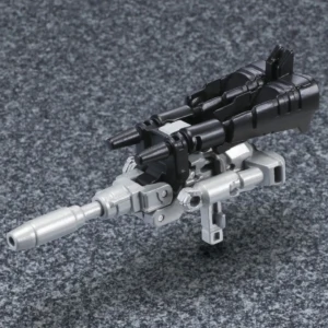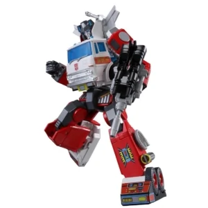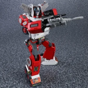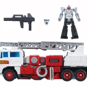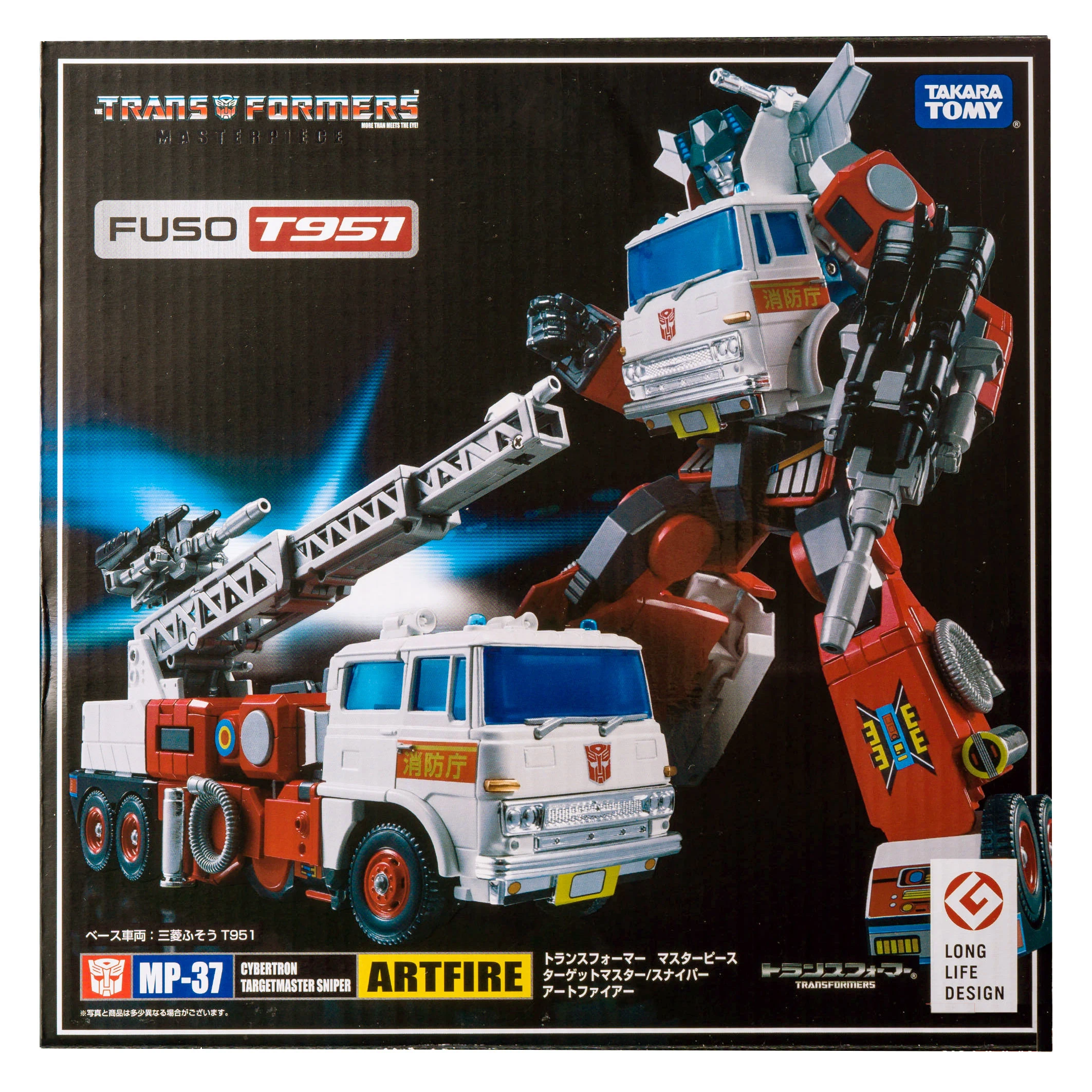 Masterpiece Artfire is a redeco of Inferno, transforming into a Mitsubishi Fuso fire engine. He comes with a few of the accessories the original mold had (the gun and the additional face), but also comes with his Targetmaster Nightstick. Nightstick can turn into a gun and can either be held as a normal gun or attach to Artfire's wrist in Headmasters "Target on!" style, as well as mount on the ladder in vehicle mode. Whereas Inferno only had a hidden wrist barrel in his right arm and Grapple only had one in his left arm, Artfire has barrels behind both arms (albeit only chrome, as opposed to the chrome/flat-colour choice you get with the other two versions of this mold). If purchased from a seller supplied by Hasbro Asia, Artfire comes with a collector coin, mounted on a folding card styled to resemble the front of his truck mode (robot mode chest).