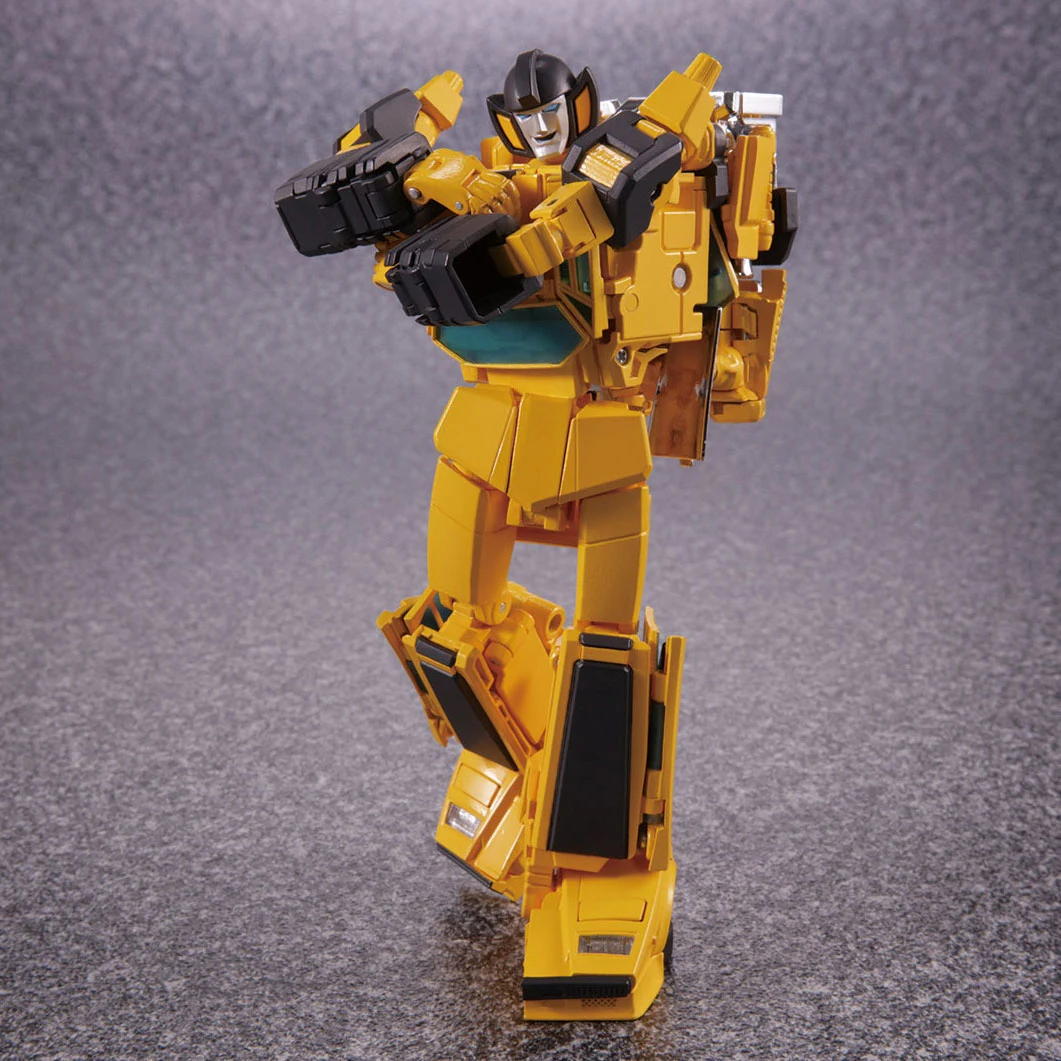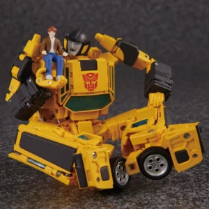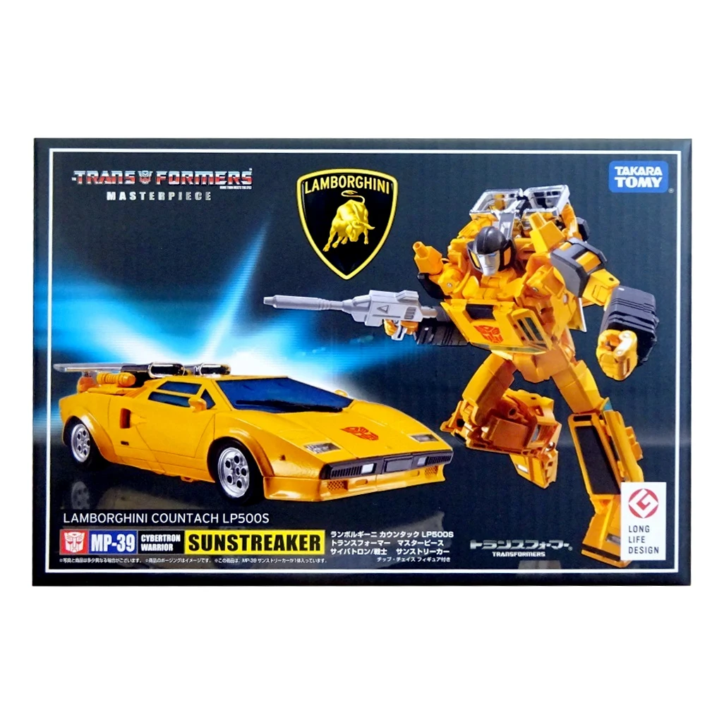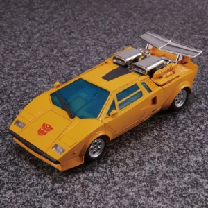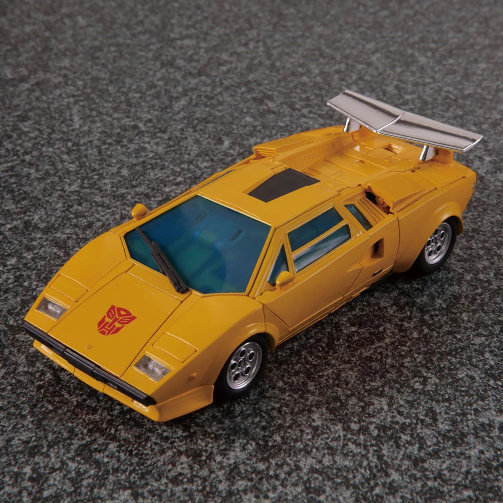 Masterpiece Sunstreaker transforms from robot to a licensed Lamborghini Countach LP500S mode, just like his brother Sideswipe, but is a completely different mold. The rear electronic propulsion engine cover can be folded into the rear of the car for a more realistic alt mode, and the rear combination tail-lights can be switched between realistic and toon modes. The doors and hood open, and the front headlights can be popped up. Early magazine adverts showed him with a yellow spoiler, but subsequent photos depicted the spoiler in a silver chrome, as found on the released figure. To preserve cartoon accuracy, the windows on the chest are "fake", however the main panel of the chest is formed by turning the roof of the car mode inside out, with the extra windows folding out from inside. For accessories, he includes his two electron pulse guns, the larger of which can be stored on his backpack, the smaller can be stored inside an opening compartment on his leg (underneath the engine bay in car mode). In addition to the standard face, he comes with an additional smiling face and shouting face, and an alien mask from the episode "Hoist Goes Hollywood"—for an additional homage to the episode he can stand on one leg too. Also included is a Chip Chase minifigure that can be removed from his wheelchair and placed on Sunstreaker's shoulders to recreate the episode "Roll for It". If purchased from a seller supplied by Hasbro Asia, Sunstreaker includes a collector coin, mounted on a folding card that resembles his robot mode chest panel.
