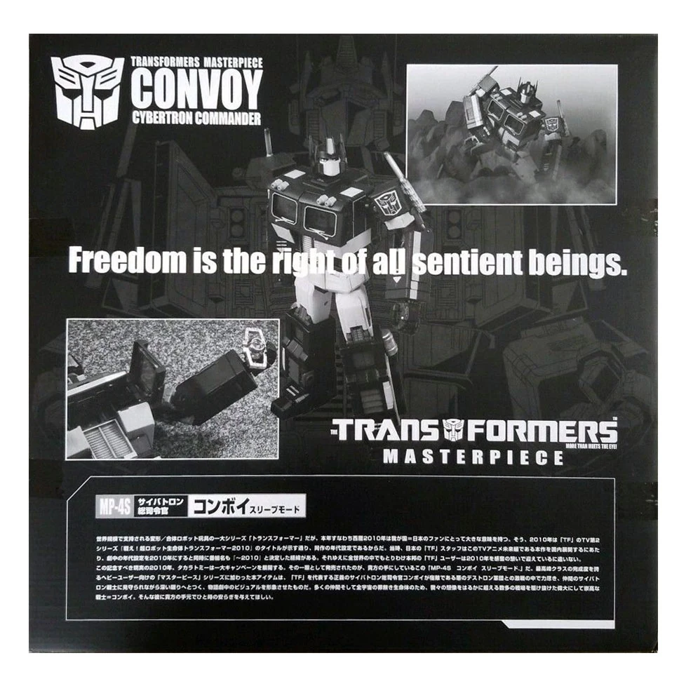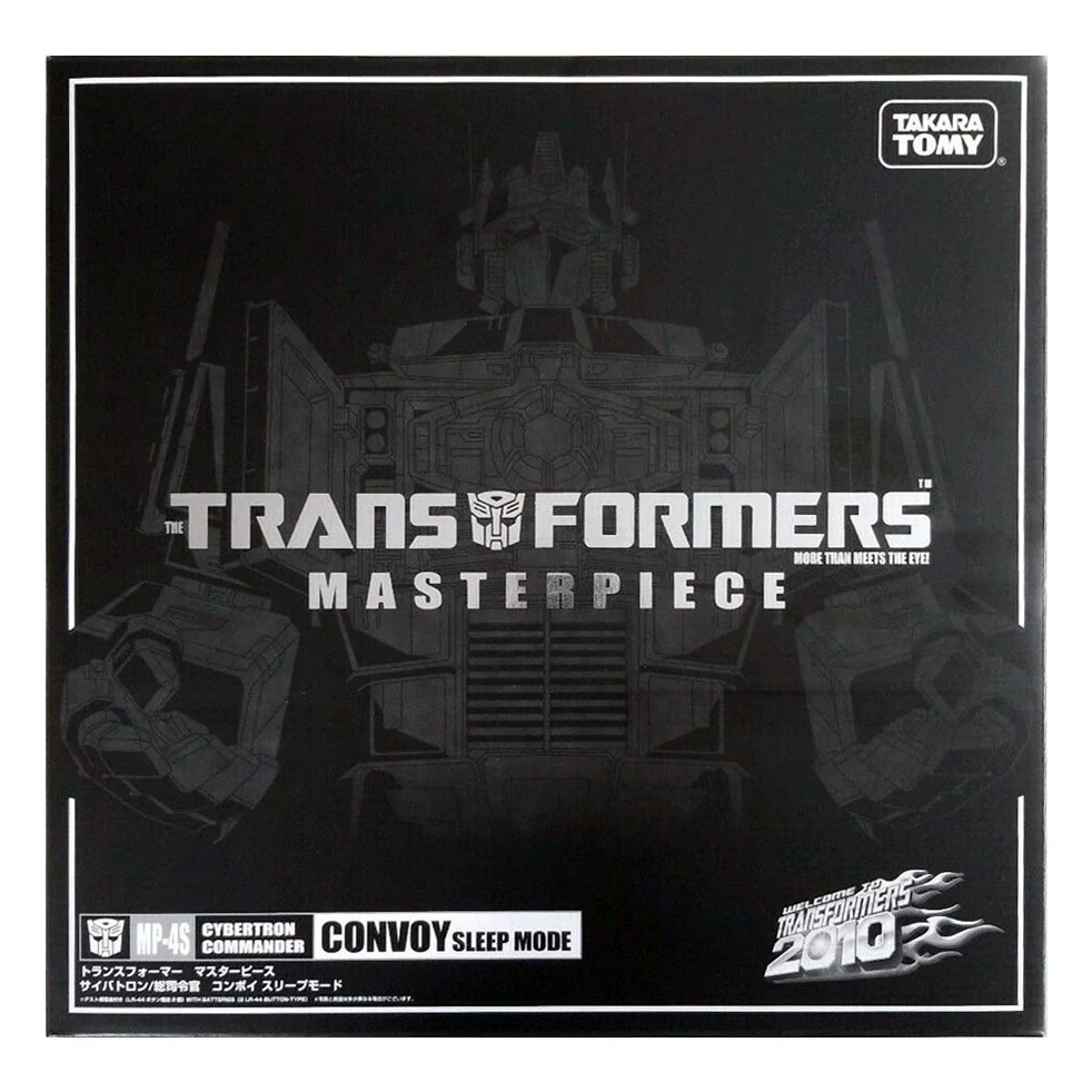 Released by TakaraTomy as part of a 2010 promotion honoring the "future era" of the original cartoon (which was set in 2010 in Japanese continuity, you see!), this exceptionally morbid re-release of the Masterpiece Convoy figure recolors the Autobot leader in blacks and greys, representing his dead body from The Transformers: The Movie—but don't worry, kids, it's actually a "sleep mode", according to the figure's name! Limited to 2010 pieces in Japan (see what they did there?), it comes with all its customary accessories, including the Perfect Edition trailer, redecoed where appropriate: the trailer itself has become translucent, its energon-axe is now transparent grey, and Megatron, in another movie homage, is rendered in translucent purple, evoking the scene depicting his transformation into Galvatron. The figure was also released in other parts of Asia as a limited edition of 2010 as well, combined with the Japanese edition for 4020 total. The Japanese version denotes "Serial Number in Japan: ####/2010" on its bio card with the number out of 2010, while the Asian version denotes "C1 - ####/2010" with the number out of 2010 on its bio card. This version of Convoy depicts Hot Rod and Ultra Magnus on its communicators.