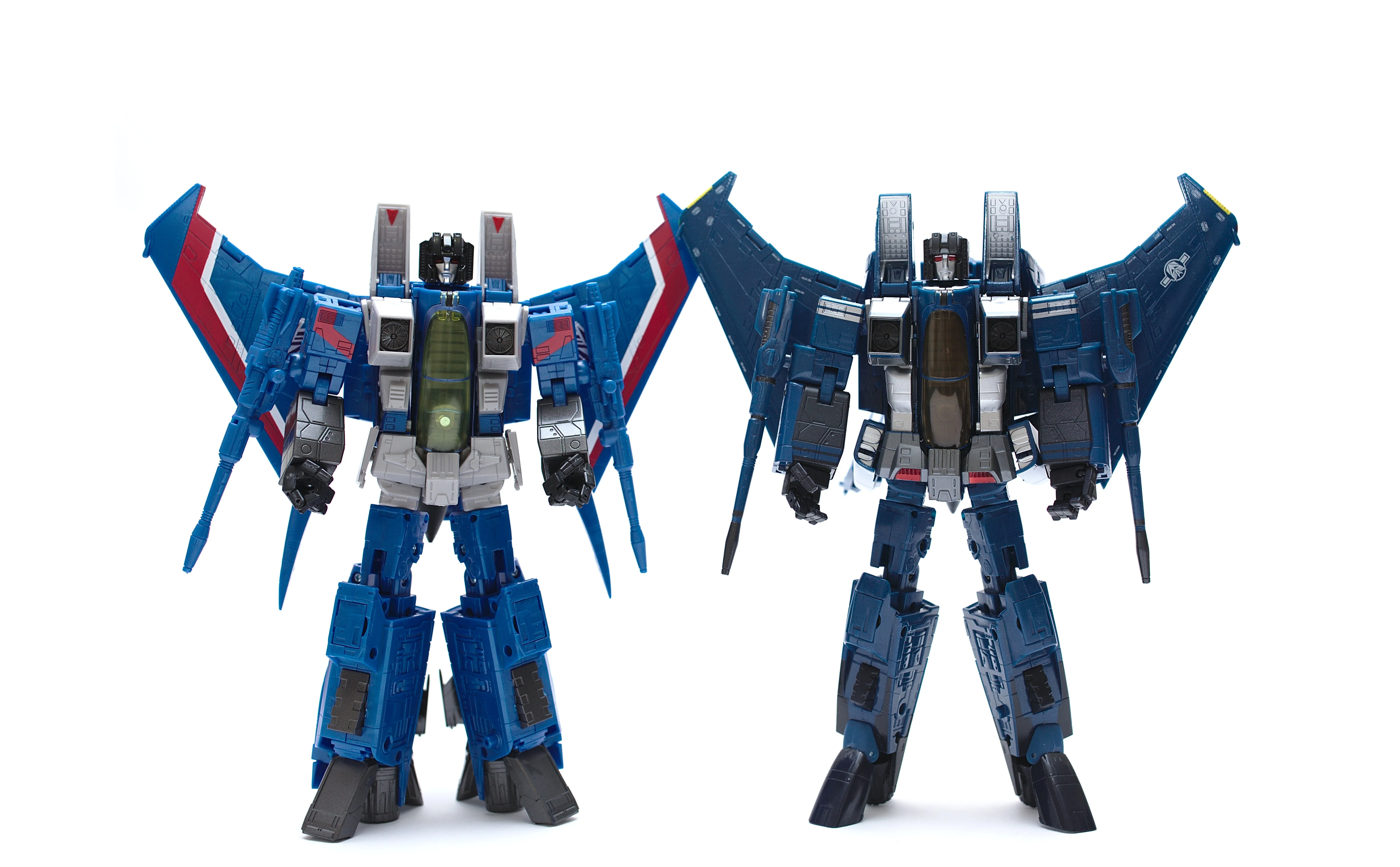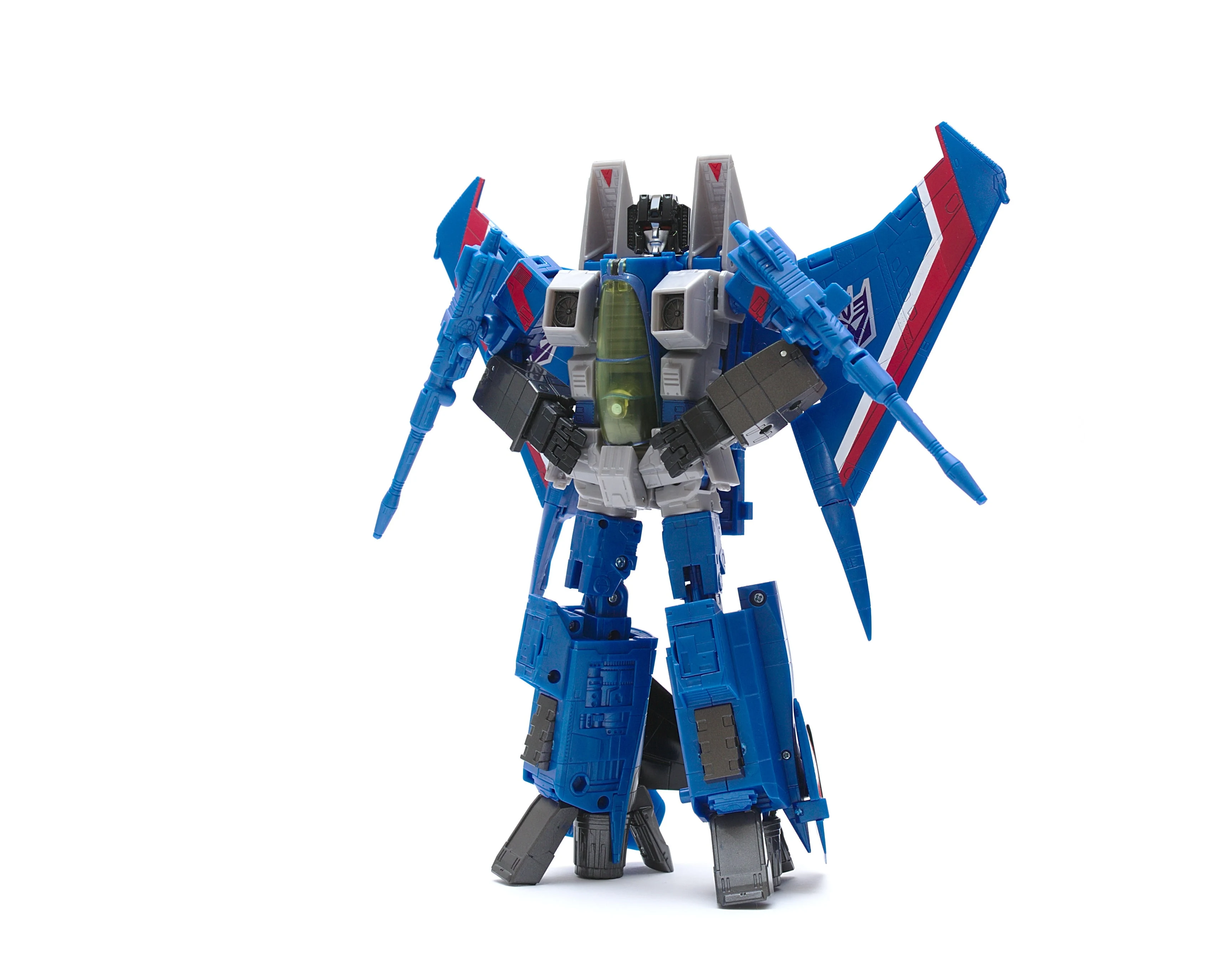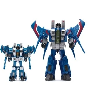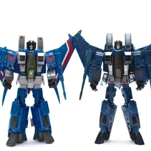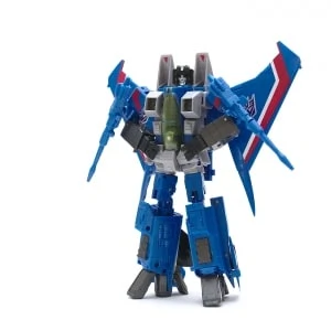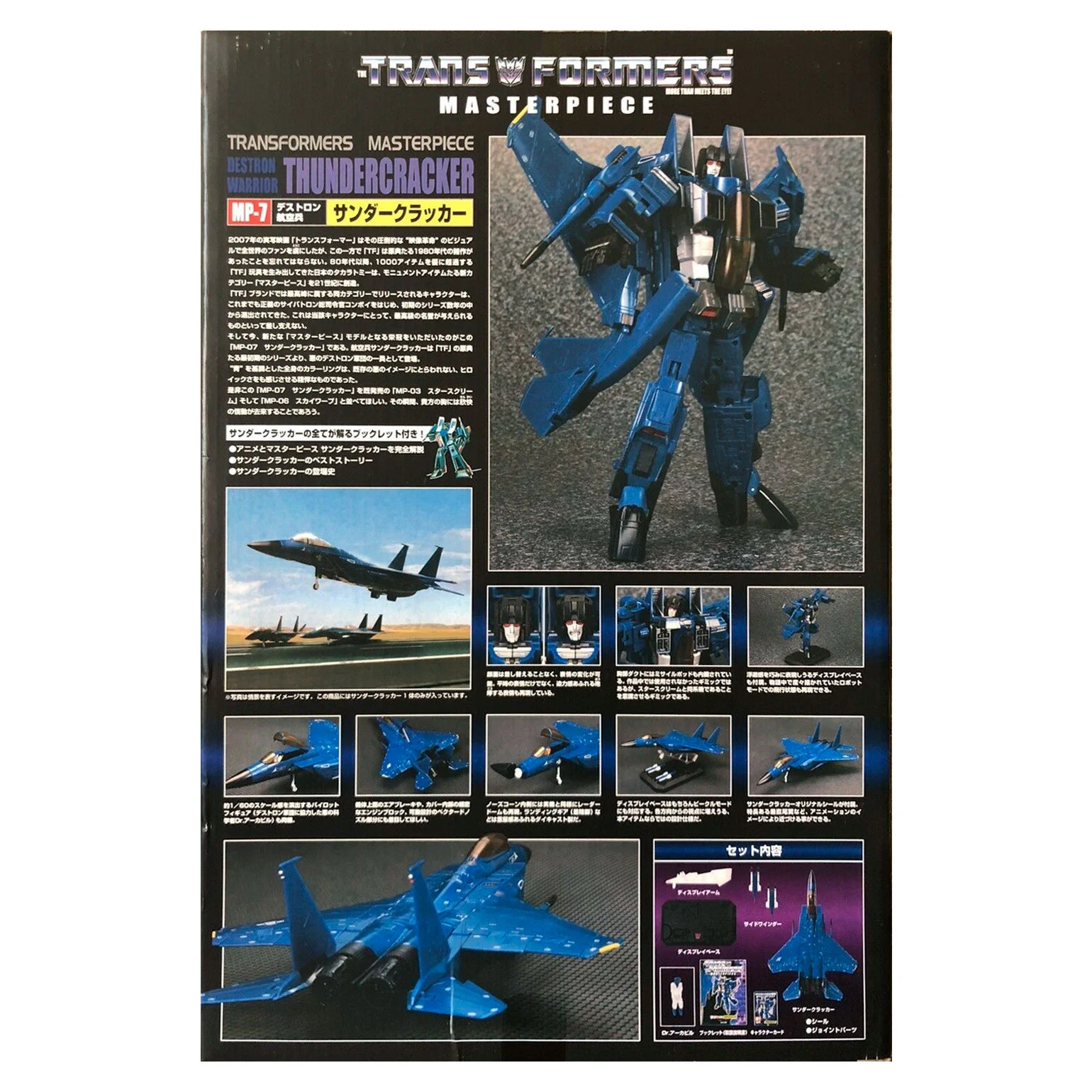 A redeco of Masterpiece Starscream, Masterpiece Thundercracker eschews the cartoon accuracy that the line normally strives for, transforms into a highly-accurate F-15 Eagle while sporting a more stylized robot mode. He comes with all the features and accessories included with the previous release of the mold: flip-up missile racks built into his pectorals, a two-piece display stand that can be configured to display the figure in mid-flight in either jet or robot mode, a miniature Doctor Arkeville figurine that fits in his cockpit (now cast in blue plastic), a clip to hold the gun mode Megatron that came with Masterpiece Optimus Prime in jet-mode, and an extensive sheet of optional stickers to allow buyers to customize him to their liking. Also like Starscream and Skywarp, Thundercracker features a rotating face with two swappable expressions; a normal, stoic gaze (retooled from Starscream's original one, despite the popular misconception that it is the same) and a new growling glare, replete with bared teeth. Some Masterpiece Thundercrackers feature an assembly error: His left and right pectorals are flipped. This misassembly does not affect transformation at all, and is most noticeable when compared to prior Masterpiece Seekers. The 2008 pressing of Masterpiece Skywarp also features this part swap. This mold was also used for the Masterpiece version of Skywarp. It was also redecoed and retooled to create the eleventh Masterpiece figure, Starscream, which was then redecoed to create Sunstorm and Acid Storm.