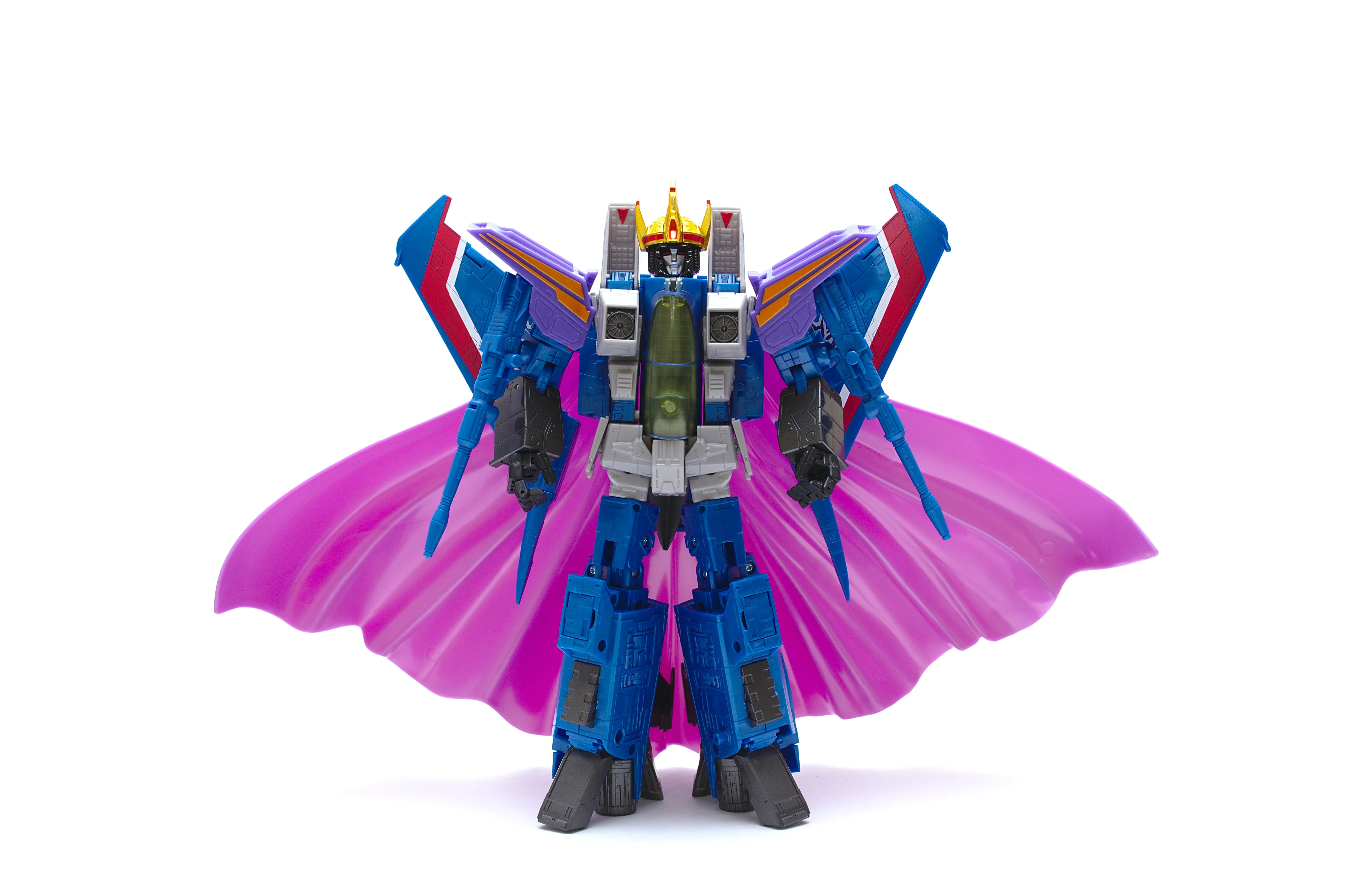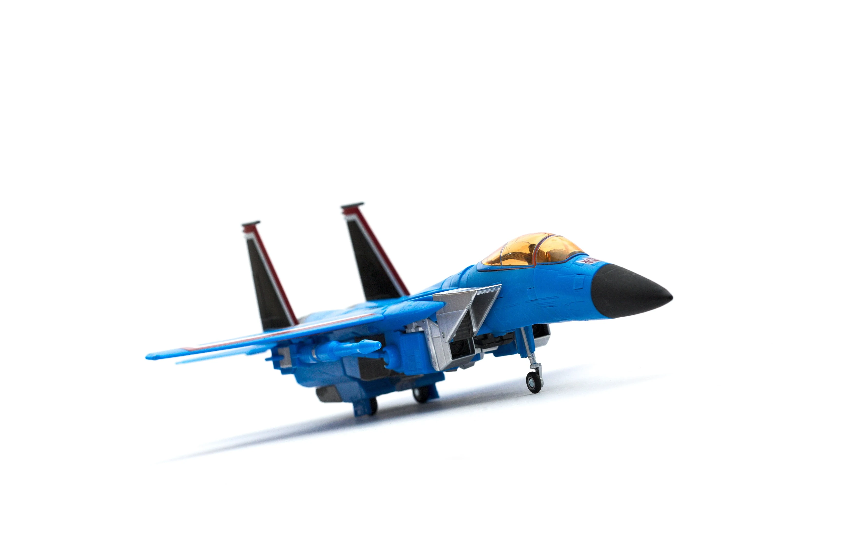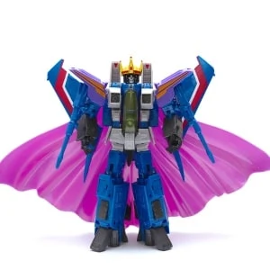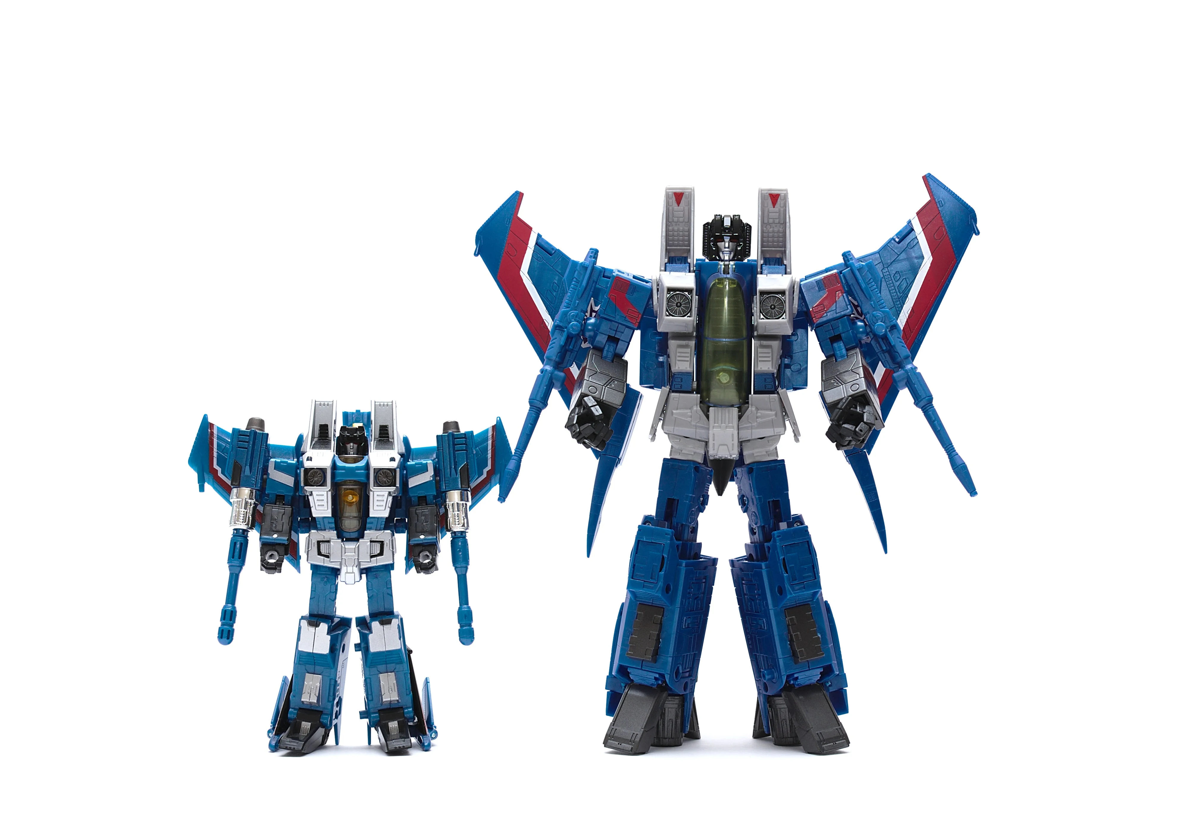 A redeco of Masterpiece Starscream, Masterpiece Thundercracker eschews the cartoon accuracy that the line normally strives for, transforms into a highly-accurate F-15 Eagle while sporting a more stylized robot mode. He comes with all the features and accessories included with the previous release of the mold: flip-up missile racks built into his pectorals, a two-piece display stand that can be configured to display the figure in mid-flight in either jet or robot mode, a miniature Doctor Arkeville figurine that fits in his cockpit (now cast in blue plastic), a clip to hold the gun mode Megatron that came with Masterpiece Optimus Prime in jet-mode, and an extensive sheet of optional stickers to allow buyers to customize him to their liking. Also like Starscream and Skywarp, Thundercracker features a rotating face with two swappable expressions; a normal, stoic gaze (retooled from Starscream's original one, despite the popular misconception that it is the same) and a new growling glare, replete with bared teeth. Some Masterpiece Thundercrackers feature an assembly error: His left and right pectorals are flipped. This misassembly does not affect transformation at all, and is most noticeable when compared to prior Masterpiece Seekers. The 2008 pressing of Masterpiece Skywarp also features this part swap. This mold was also used for the Masterpiece version of Skywarp. It was also redecoed and retooled to create the eleventh Masterpiece figure, Starscream, which was then redecoed to create Sunstorm and Acid Storm.