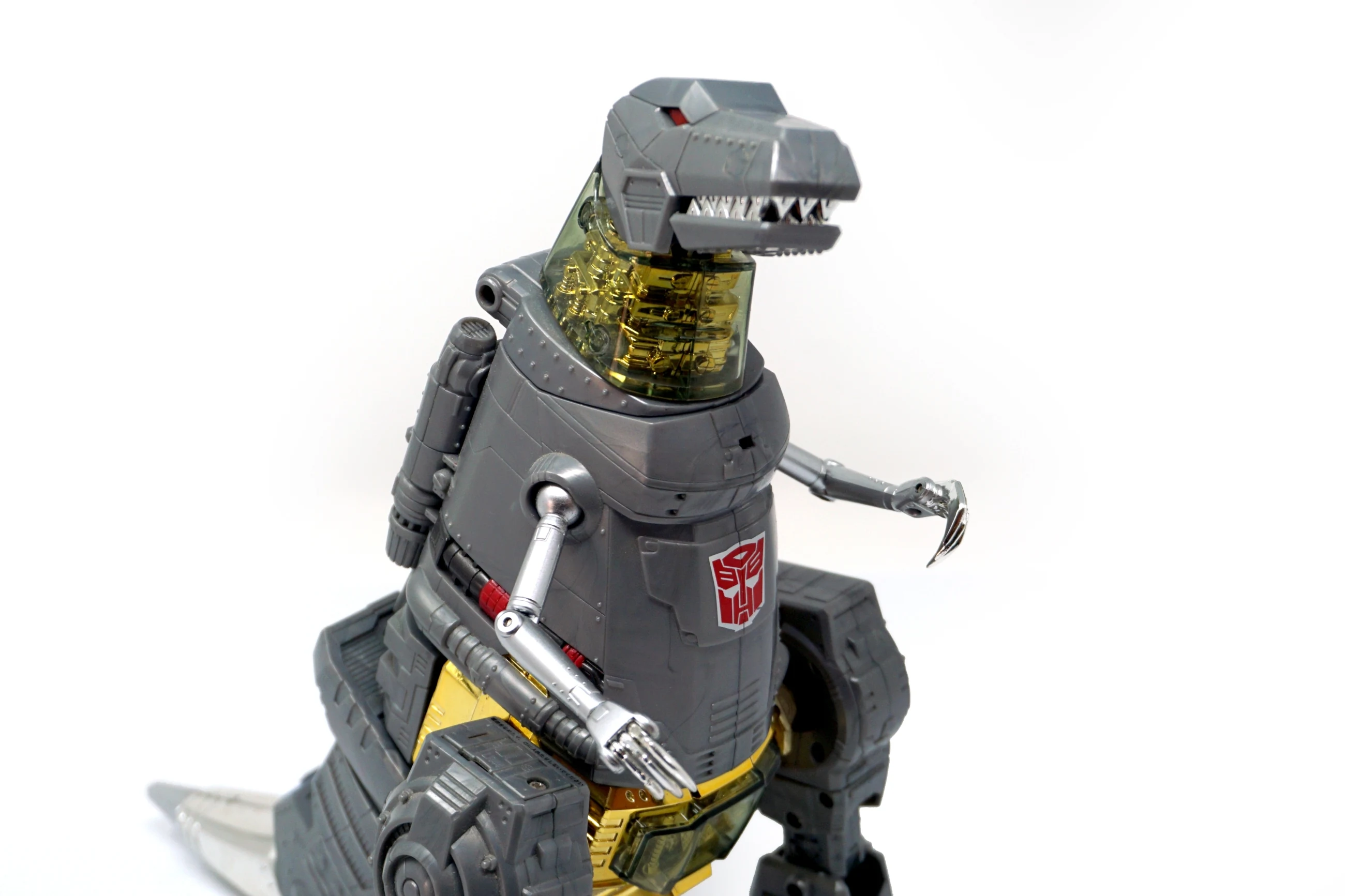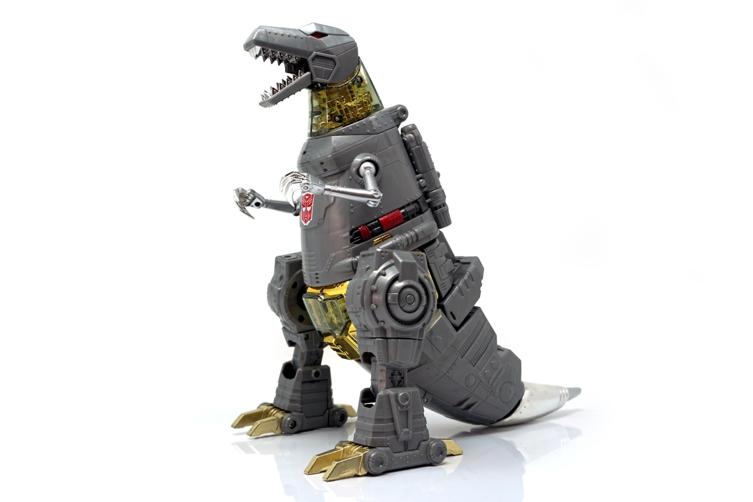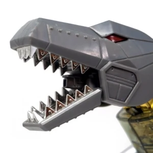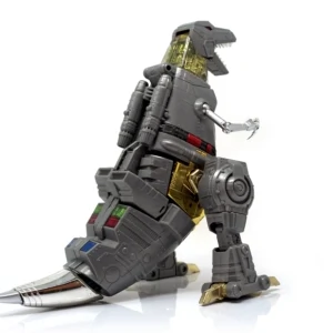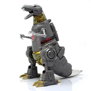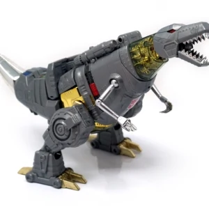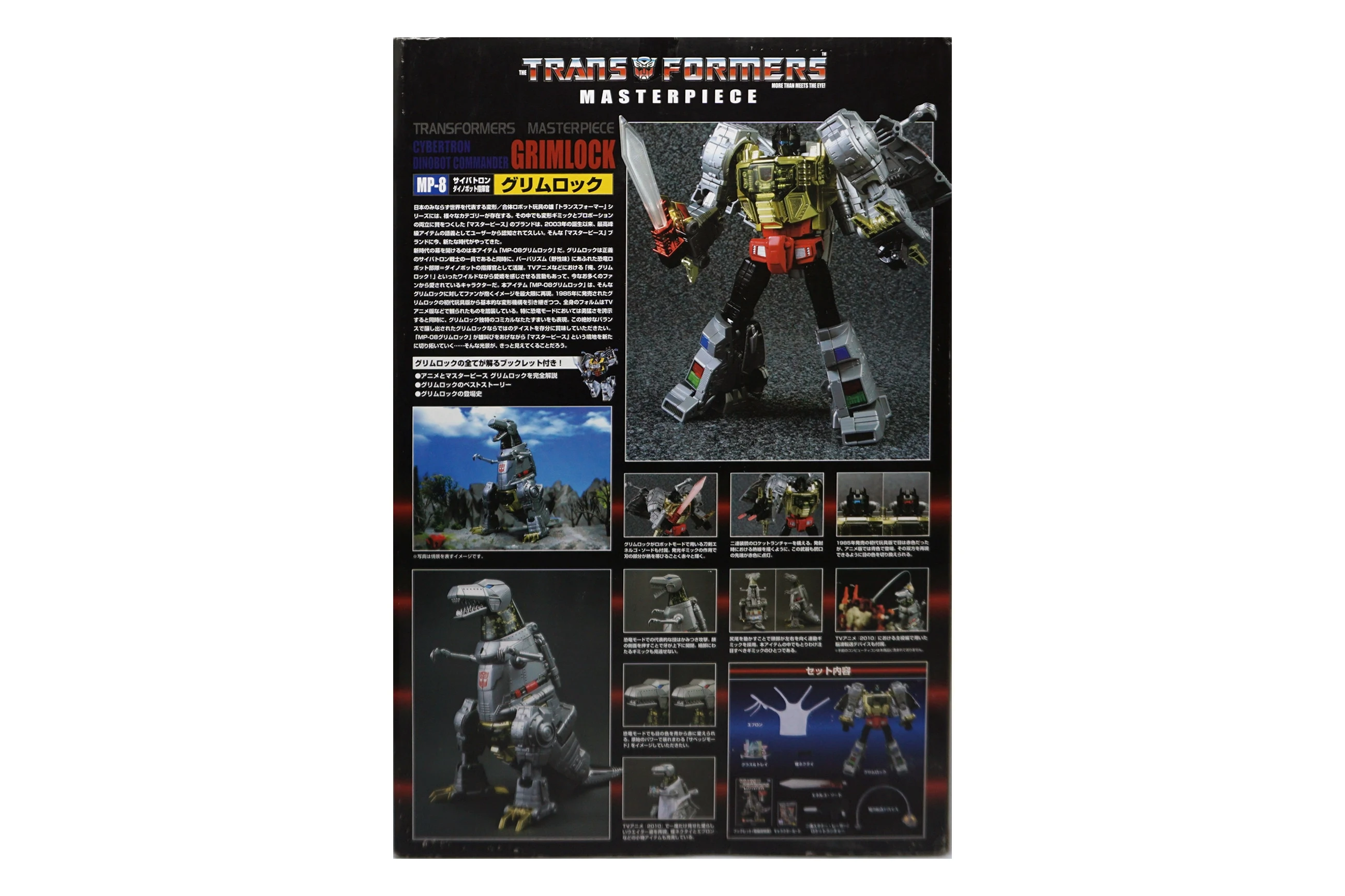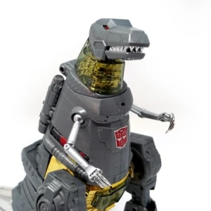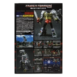 Released in March of 2009, Masterpiece Grimlock is based upon his original toy and cartoon model, transforming into an outdated view of the Tyrannosaurus rather than the more accurate depiction seen on Classics Grimlock. Of all the Masterpiece figures, Grimlock features both the least complex transformation, as well as the least deviation from his original toy's essential transformation scheme. Masterpiece Grimlock features the usage of die-cast metal for his dinosaur mode's toes and an LED mounted within his right fist which illuminates both his gun's barrels and his sword. As a result of said mechanism, the only articulated part of his right hand is the thumb. Similarly his left hand is modeled much like Masterpiece Starscream's hands with the thumb and index finger fully articulated with the remaining fingers joined together. Possibly as a show of good faith regarding the sacrificed articulation, TakaraTomy designed his alternate mode's arms to be highly poseable, featuring full articulation of the claws with the arms themselves attached to the body with ball joints. He features many gimmicks, including the ability to change his eye color in either mode from red to blue with the flip of a switch found at the back of his head in robot mode, and by opening the top of his head in dino mode and switching the eyes around. This allows the owner the choice of representing the use of blue in the cartoon (and his IDW alternate mode) or the use of red in most other media, including his original toy. His tail is connected to his head, and by wiggling and moving it, the head rotates at the base of the neck. Pushing down on his torso in dinosaur mode makes his legs move up higher into his body, and as a result his head will look up. His alt mode's head features jaws that snap shut at the press of a button hidden on his cheek; in addition, it also has a tiny sculpted flame thrower in its mouth, but for your safety, it does not actually breathe fire (boo). Besides his weapons, he also comes with a cloth apron and bow tie to go with a drinks serving tray he carried in "Madman's Paradise", as well as the device he used to transfer his super-intelligence into Computron in "Grimlock's New Brain".
