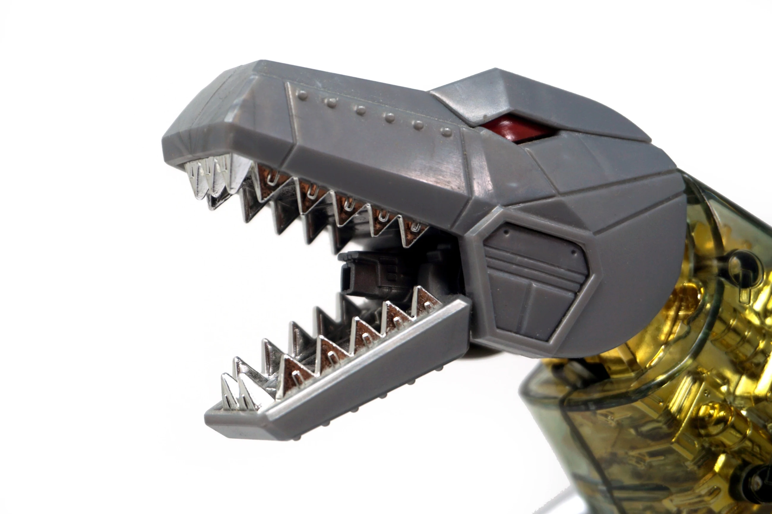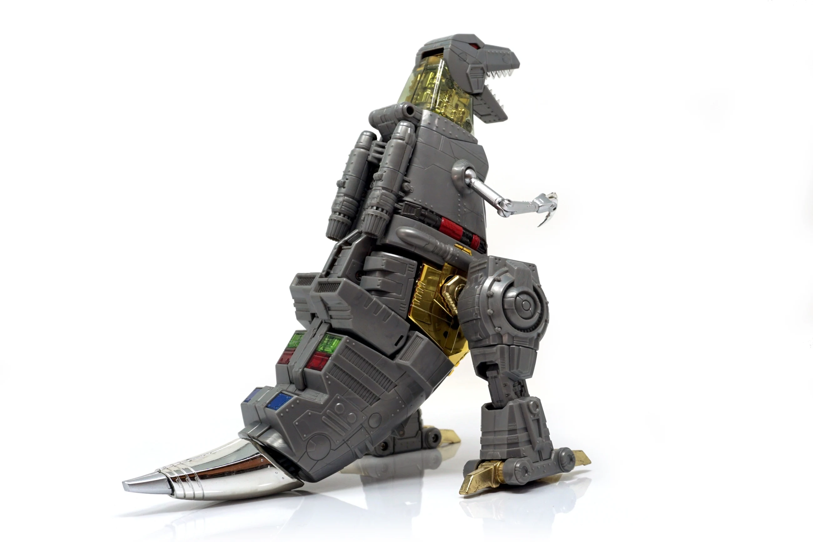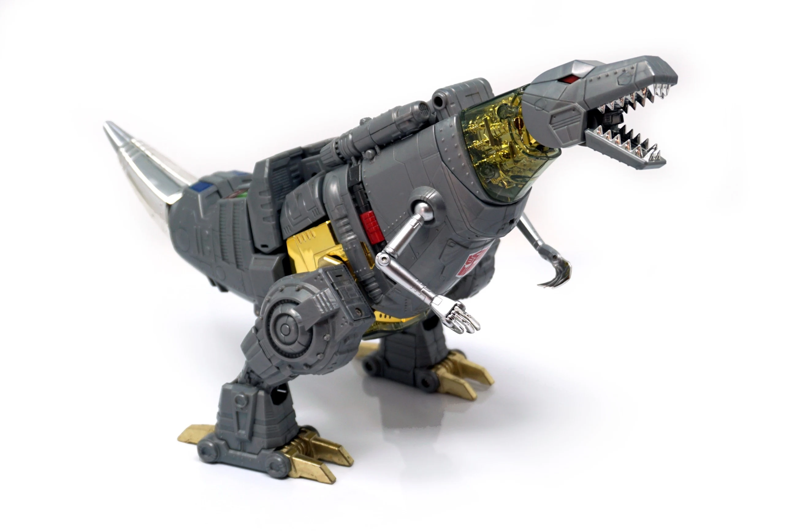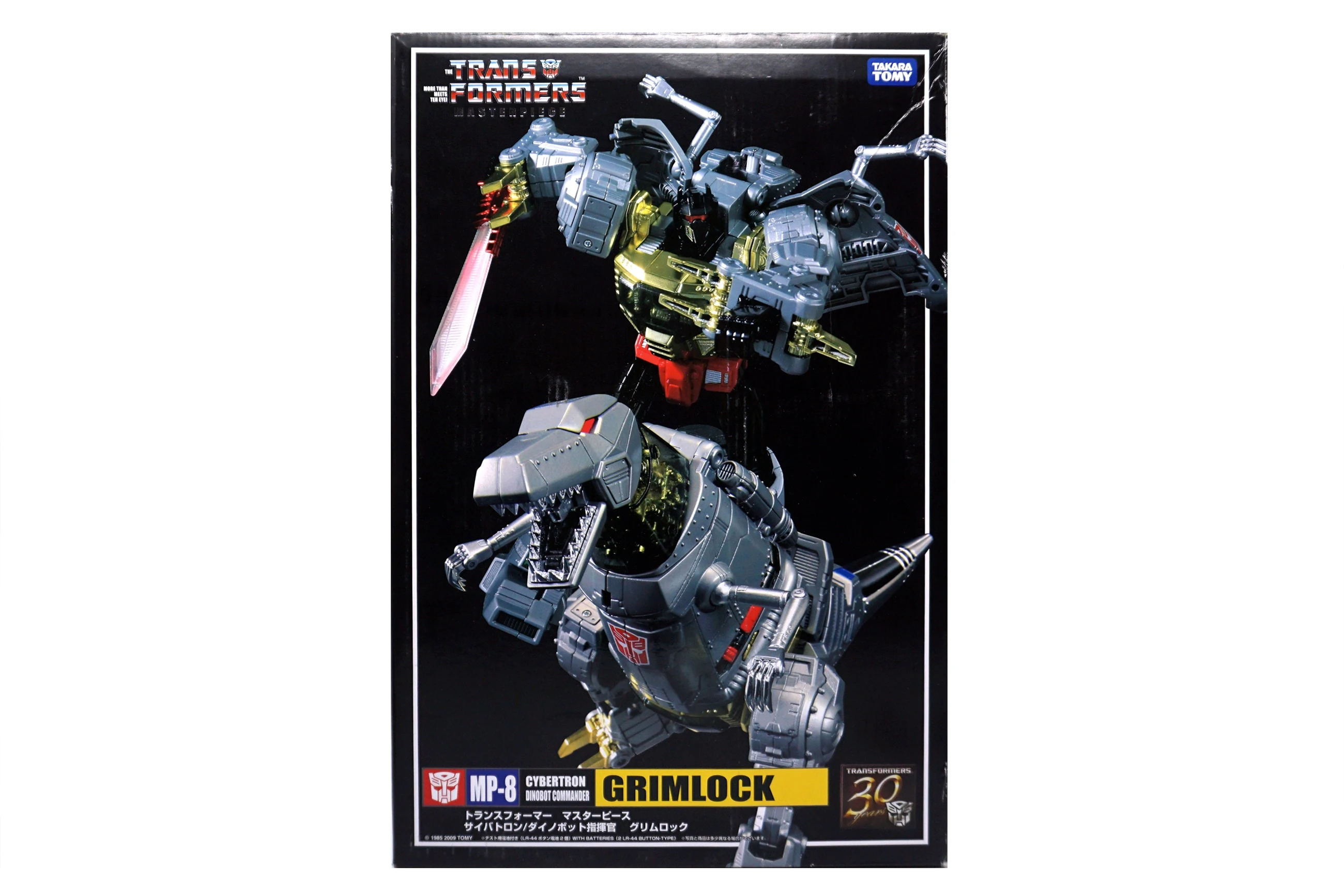Released in March of 2009, Masterpiece Grimlock is based upon his original toy and cartoon model, transforming into an outdated view of the Tyrannosaurus rather than the more accurate depiction seen on Classics Grimlock. Of all the Masterpiece figures, Grimlock features both the least complex transformation, as well as the least deviation from his original toy's essential transformation scheme. Masterpiece Grimlock features the usage of die-cast metal for his dinosaur mode's toes and an LED mounted within his right fist which illuminates both his gun's barrels and his sword. As a result of said mechanism, the only articulated part of his right hand is the thumb. Similarly his left hand is modeled much like Masterpiece Starscream's hands with the thumb and index finger fully articulated with the remaining fingers joined together. Possibly as a show of good faith regarding the sacrificed articulation, TakaraTomy designed his alternate mode's arms to be highly poseable, featuring full articulation of the claws with the arms themselves attached to the body with ball joints. He features many gimmicks, including the ability to change his eye color in either mode from red to blue with the flip of a switch found at the back of his head in robot mode, and by opening the top of his head in dino mode and switching the eyes around. This allows the owner the choice of representing the use of blue in the cartoon (and his IDW alternate mode) or the use of red in most other media, including his original toy. His tail is connected to his head, and by wiggling and moving it, the head rotates at the base of the neck. Pushing down on his torso in dinosaur mode makes his legs move up higher into his body, and as a result his head will look up. His alt mode's head features jaws that snap shut at the press of a button hidden on his cheek; in addition, it also has a tiny sculpted flame thrower in its mouth, but for your safety, it does not actually breathe fire (boo). Besides his weapons, he also comes with a cloth apron and bow tie to go with a drinks serving tray he carried in "Madman's Paradise", as well as the device he used to transfer his super-intelligence into Computron in "Grimlock's New Brain".