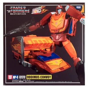 The central feature of TakaraTomy's Masterpiece incarnation of good ol' Roddy is its ability to transform from Hot Rod to Rodimus Prime in both robot and vehicle modes. Extensions in the figure's hips give Rodimus some slight extra height over Hot Rod, while a spring-loaded pop-out second face, revealed when the figure's helmet is tilted back, gives him his older, lined features; this face is somewhat narrower than Hot Rod's, combining with a slight elevation of the back-mounted spoiler to further create the illusion of a larger figure. Contrary to expectations, creating Rodimus Prime's vehicle mode does not simply involve slotting Hot Rod's car mode into the larger trailer section; in fact, Hot Rod fits into the trailer backwards, and an entirely new vehicle-front—featuring Rodimus's shorter hood and smaller canopy and lacking an exposed engine block—fips out from beneath the trailer and wraps around his rear end. Both vehicles feature opening canopies, though only Hot Rod has any sculpted interior detail of note. As with most Masterpiece figures, the toy attempts to reproduce Hot Rod's cartoon appearance as faithfully as possible; consequently, this is the first toy to actually render Hot Rod in his cartoon-accurate magenta coloration. Of course, there was no way to make the figure switch to burgundy for Rodimus mode, but in compensation, the front of the cab features the two tone coloration Rodimus Prime featured in the animation.
