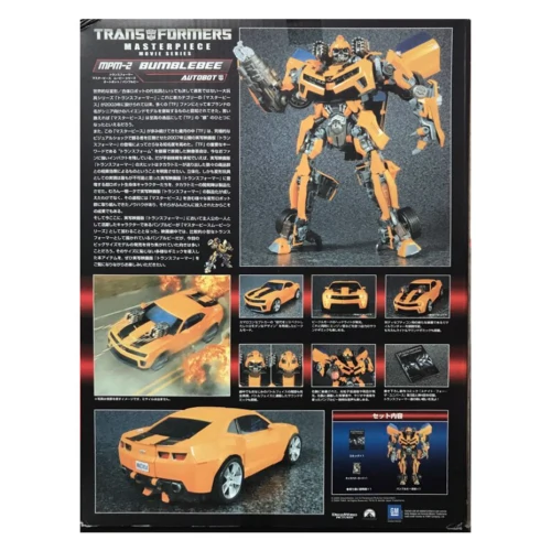 Masterpiece: Movie Series Bumblebee is a redeco of Battle Ops Bumblebee. Unlike the Hasbro version, he features a very extensive paint job, including chromed rims, and features no yellow plastic despite his appearance. Instead, all of his yellow parts are painted over gray plastic to make it as show-accurate as possible. Among other notable plastic color changes, the TakaraTomy version features a clear colorless right hand (instead of translucent blue). The Hong Kong release of the toy features a shiny metallic gold finish instead. The box flap features the quote "Angels will rain down like visitors from heaven!" from the first movie.