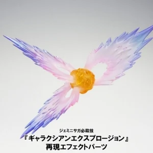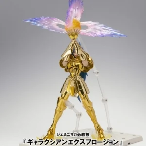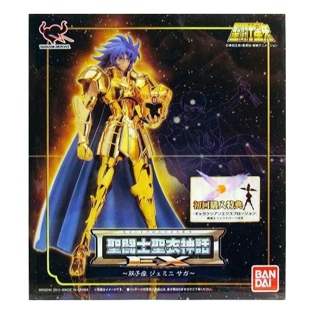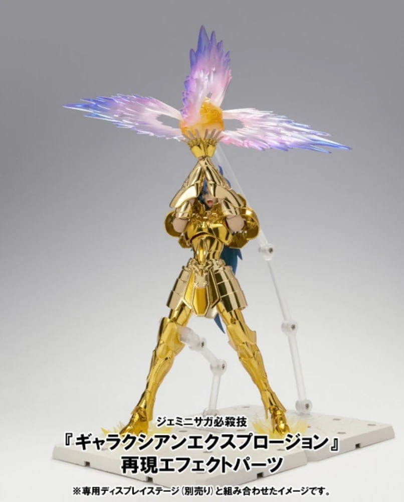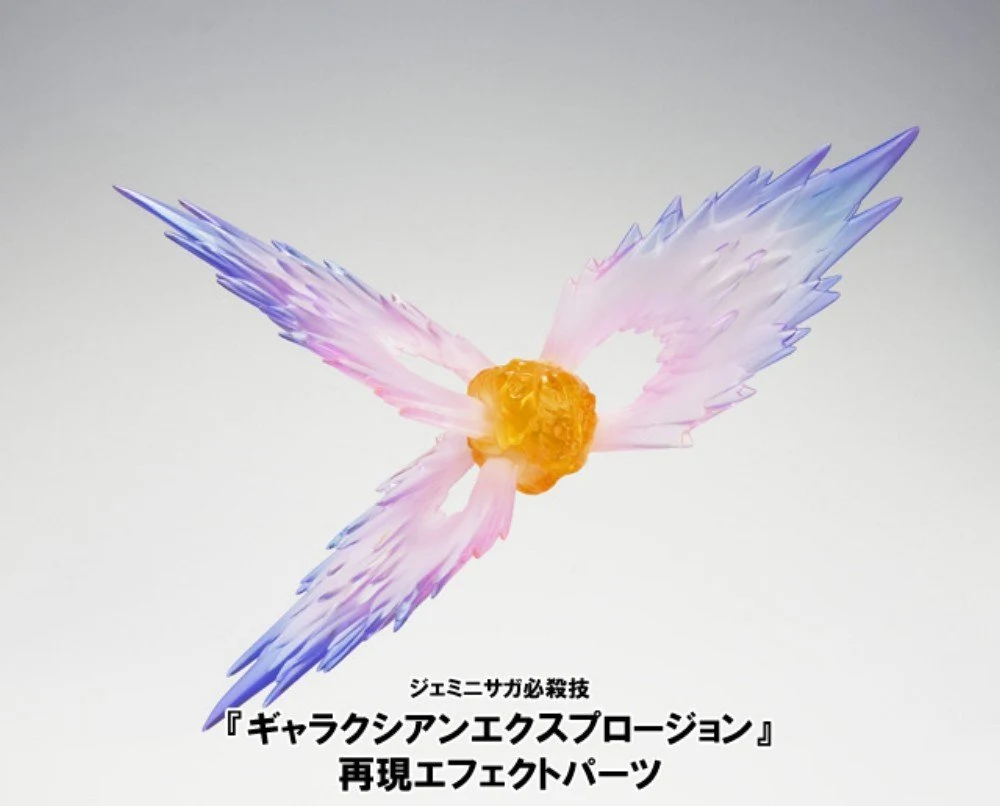 Saint Cloth Myth EX represents a complete renovation of the existing Saint Cloth Myth series and strives for superior articulation with cloth (armor) parts attached. Each part features entirely new constructs enabling for a wide range of articulation even when figure is wearing cloth (armor) parts! A complete remodeling of the action figure creating a perfect, seamless fit with the cloth (armor) parts. The cape, which up until now has been portrayed with cloth, is now meticulously rendered with resin and features three wing articulation for a flow effect and enhanced posing expression. An exquisite, streamlined, and stylish proportion has been realized to create a figure that looked like it walked right out of the anime. In response to fan requests, multiple facial expression parts have been included. Gemini Saga will include a total of five interchangeable face parts as well as a total of nine interchangeable (5 right, 4 left) hand parts. *The first release of Gemini Saga will include limited first production bonus parts replicating Gemini Saga's signature move, "Galaxian Explosion!"