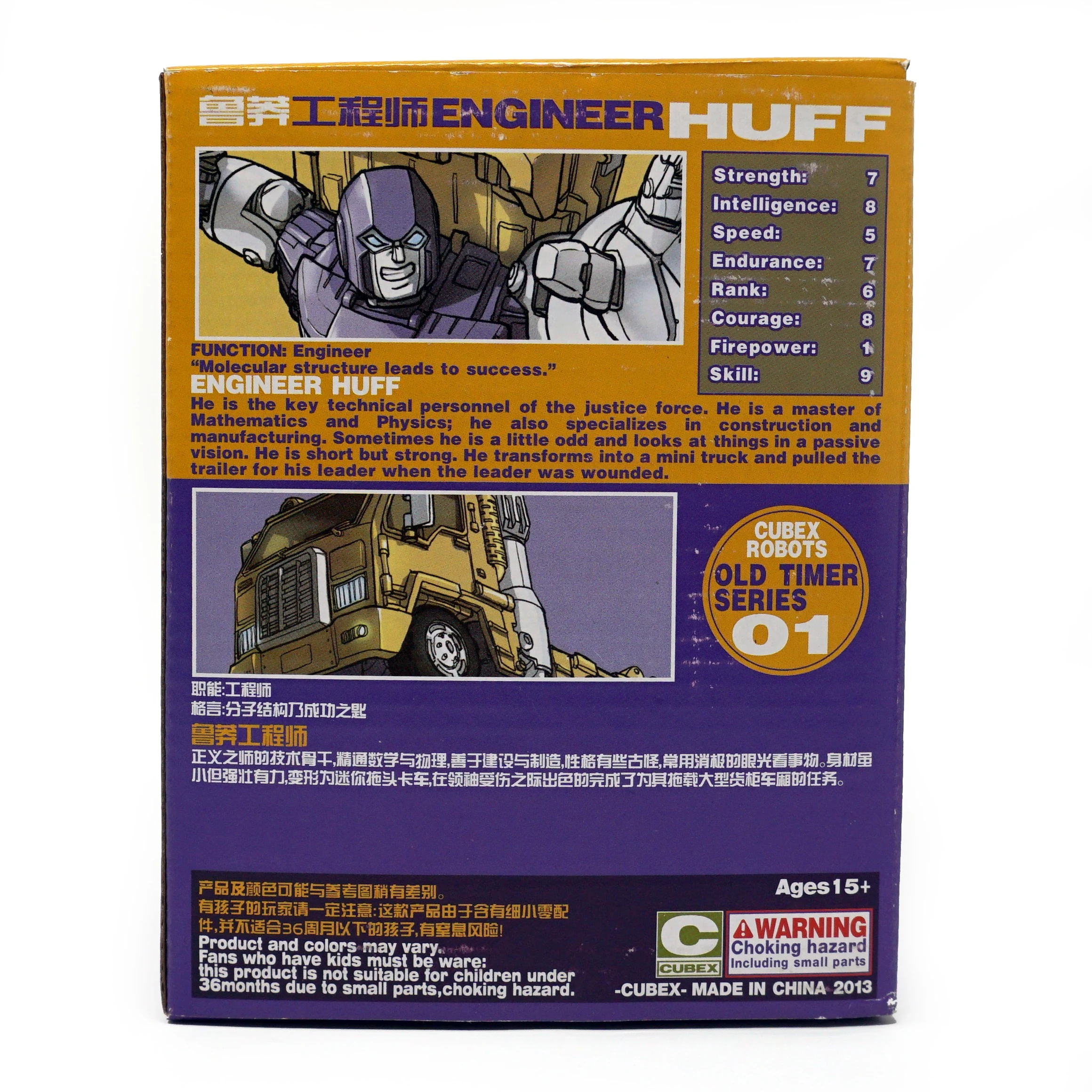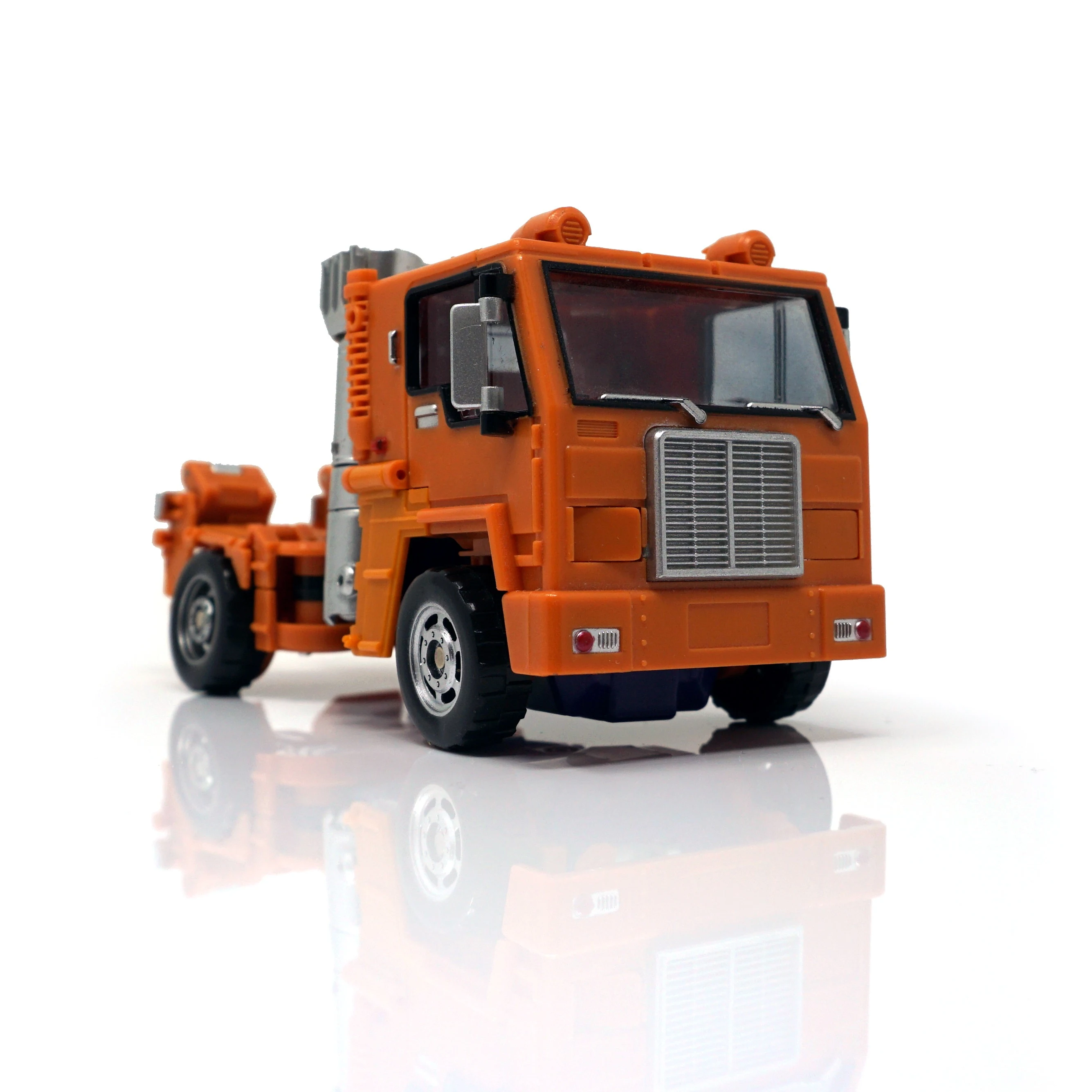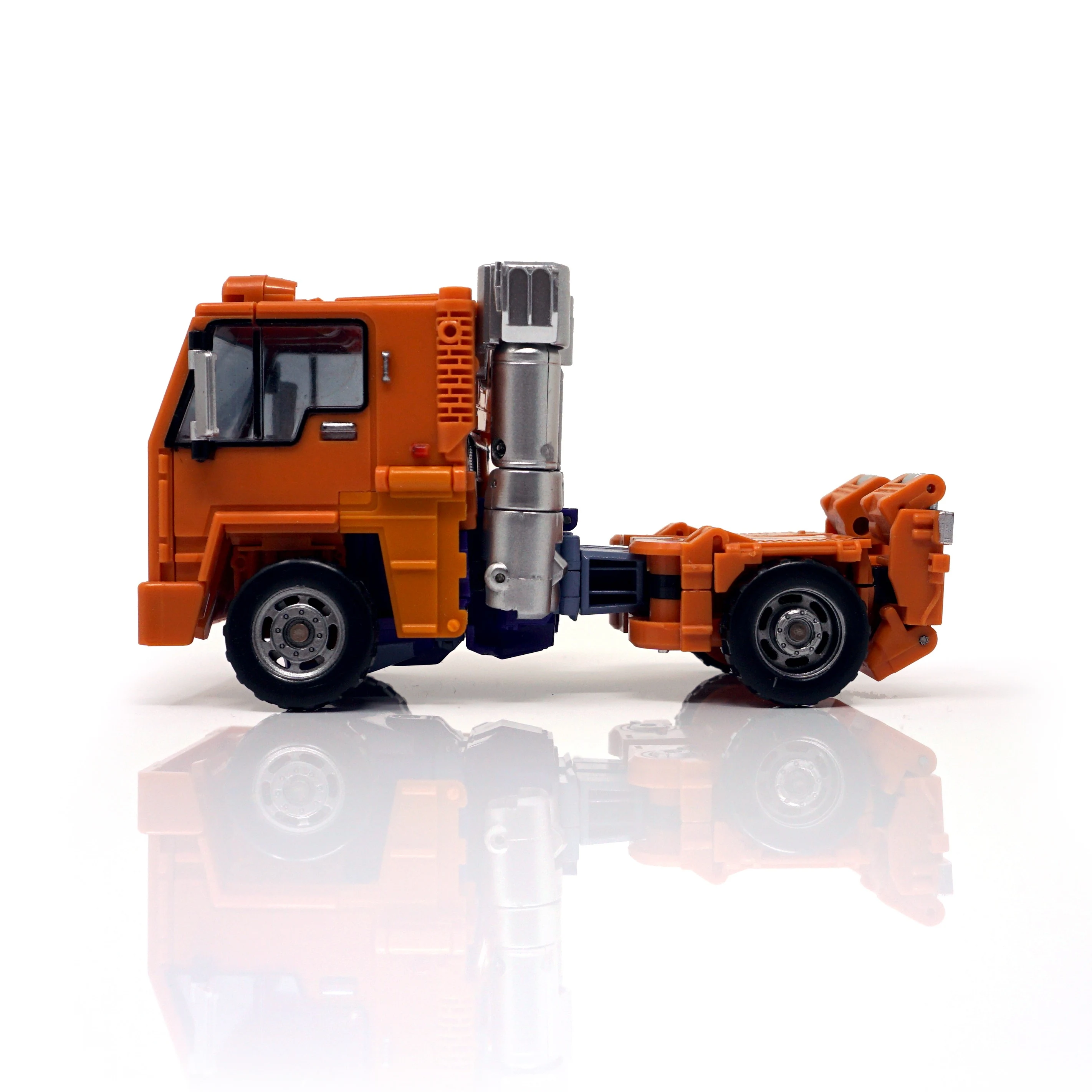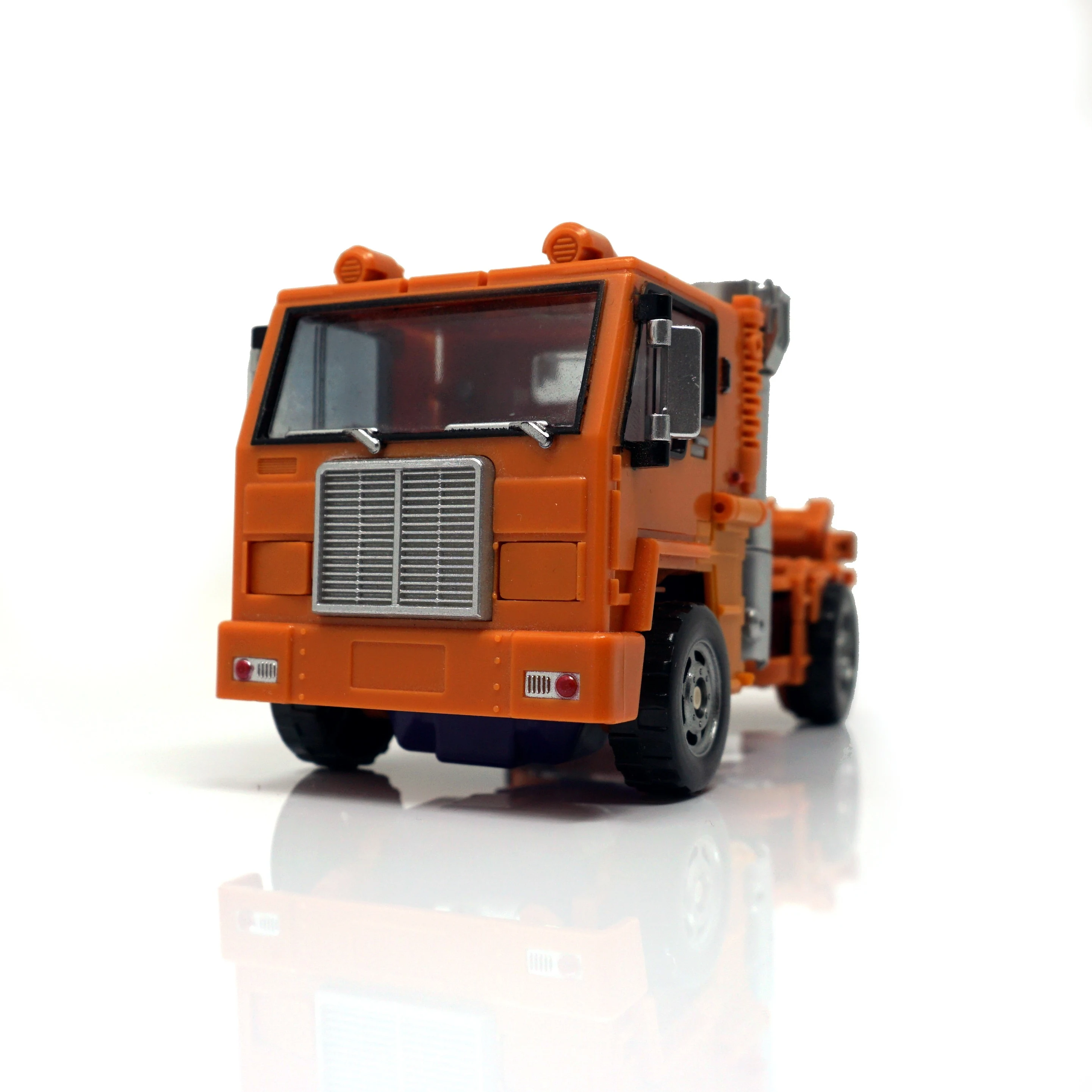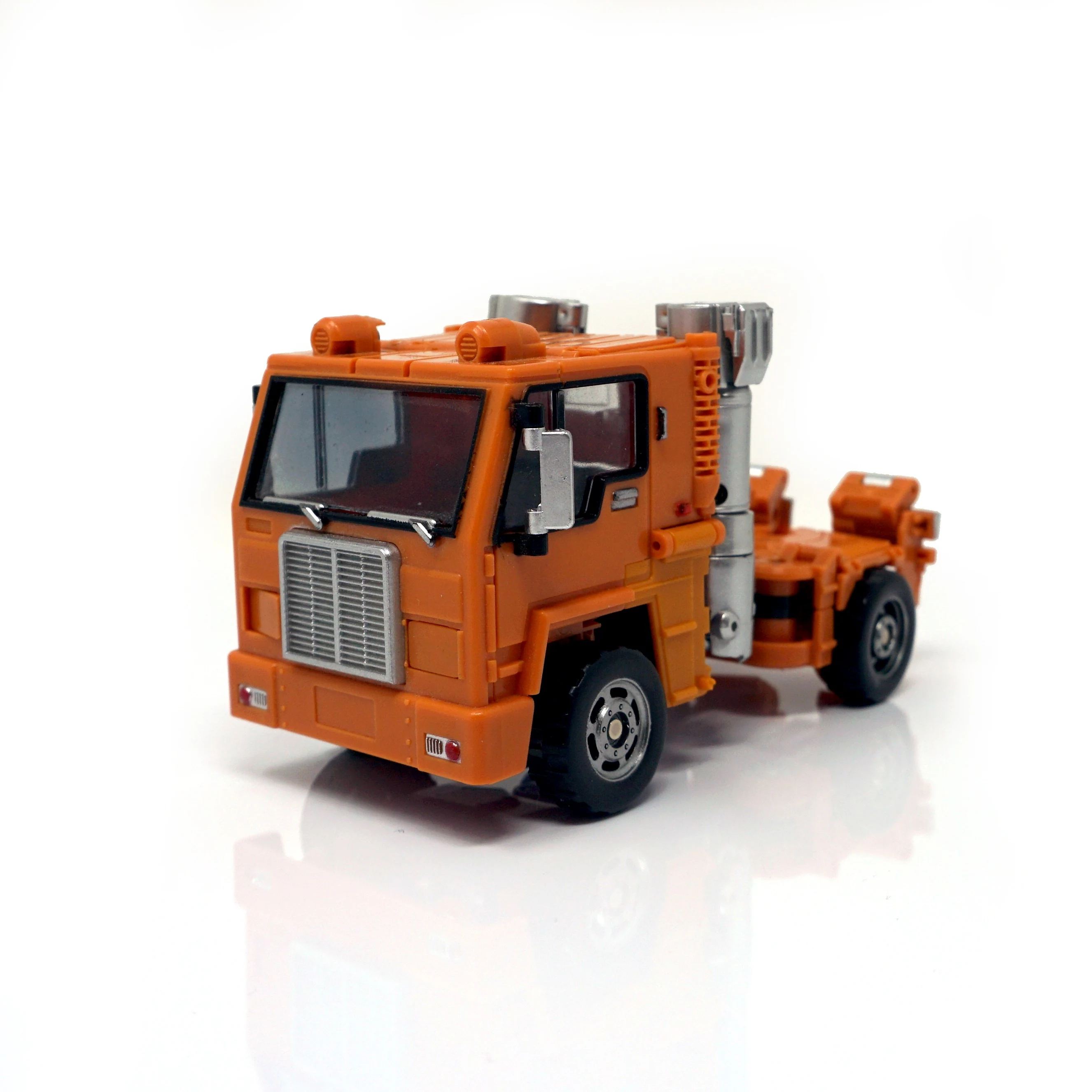 OTS-01 Huff is MP scale and sized! Figure stands 15CM/6" in tall in robot mode and transforms intoa truck. Features die-cast parts, ratchet joints, thick and durable plastic, rubber coating on the tires and accessories!