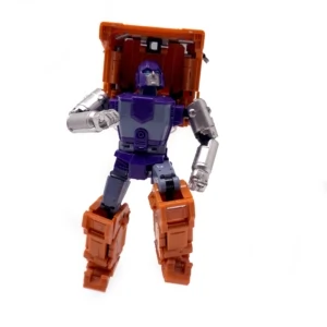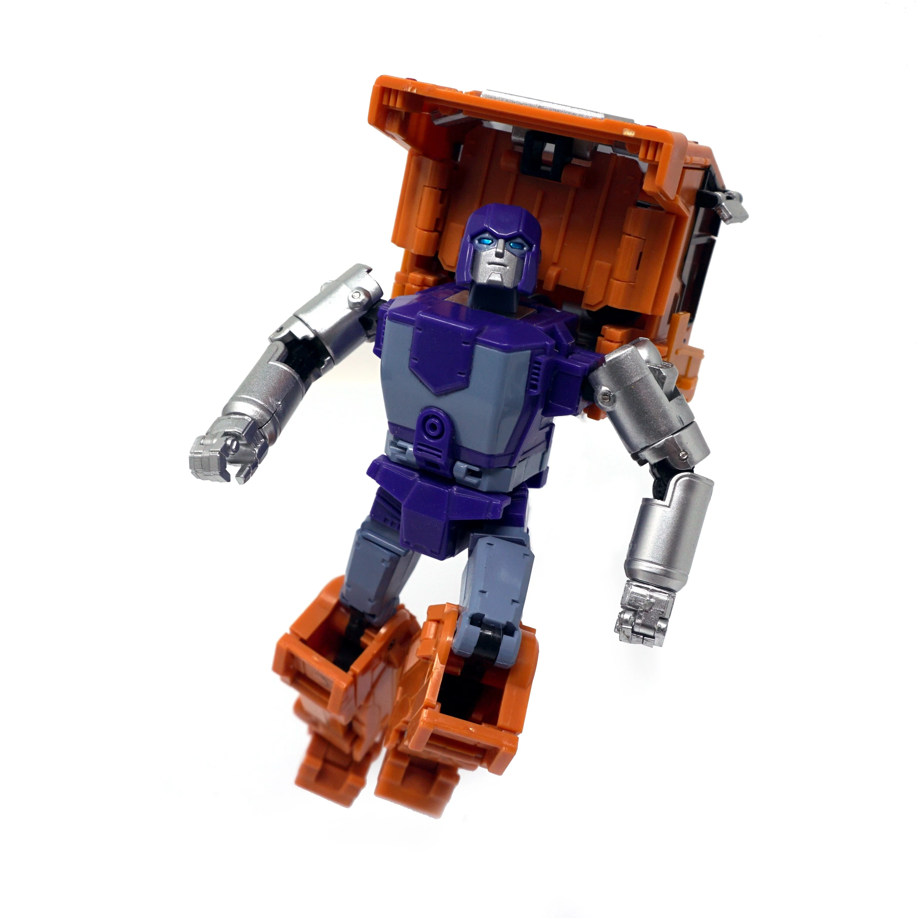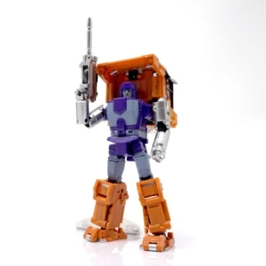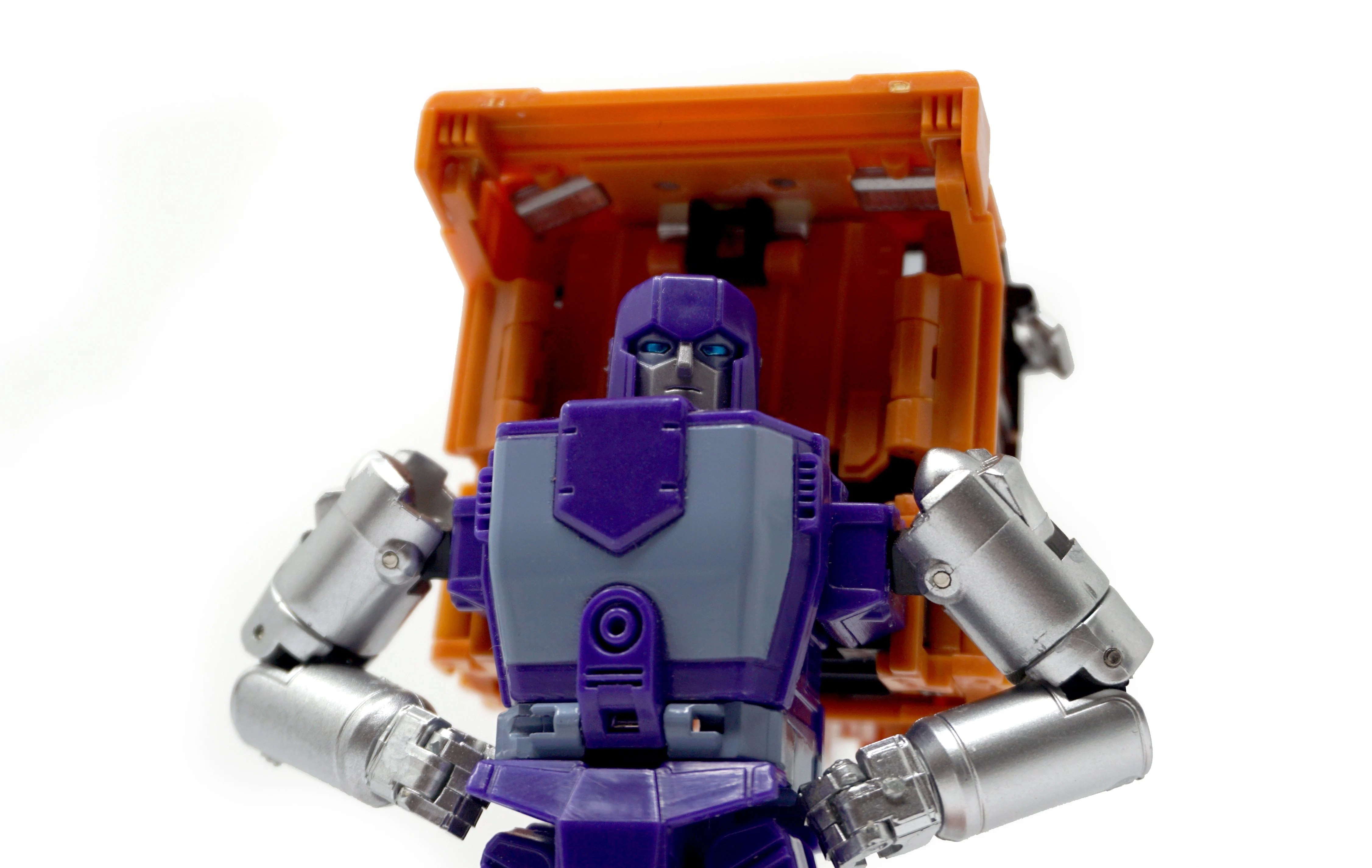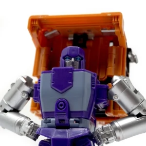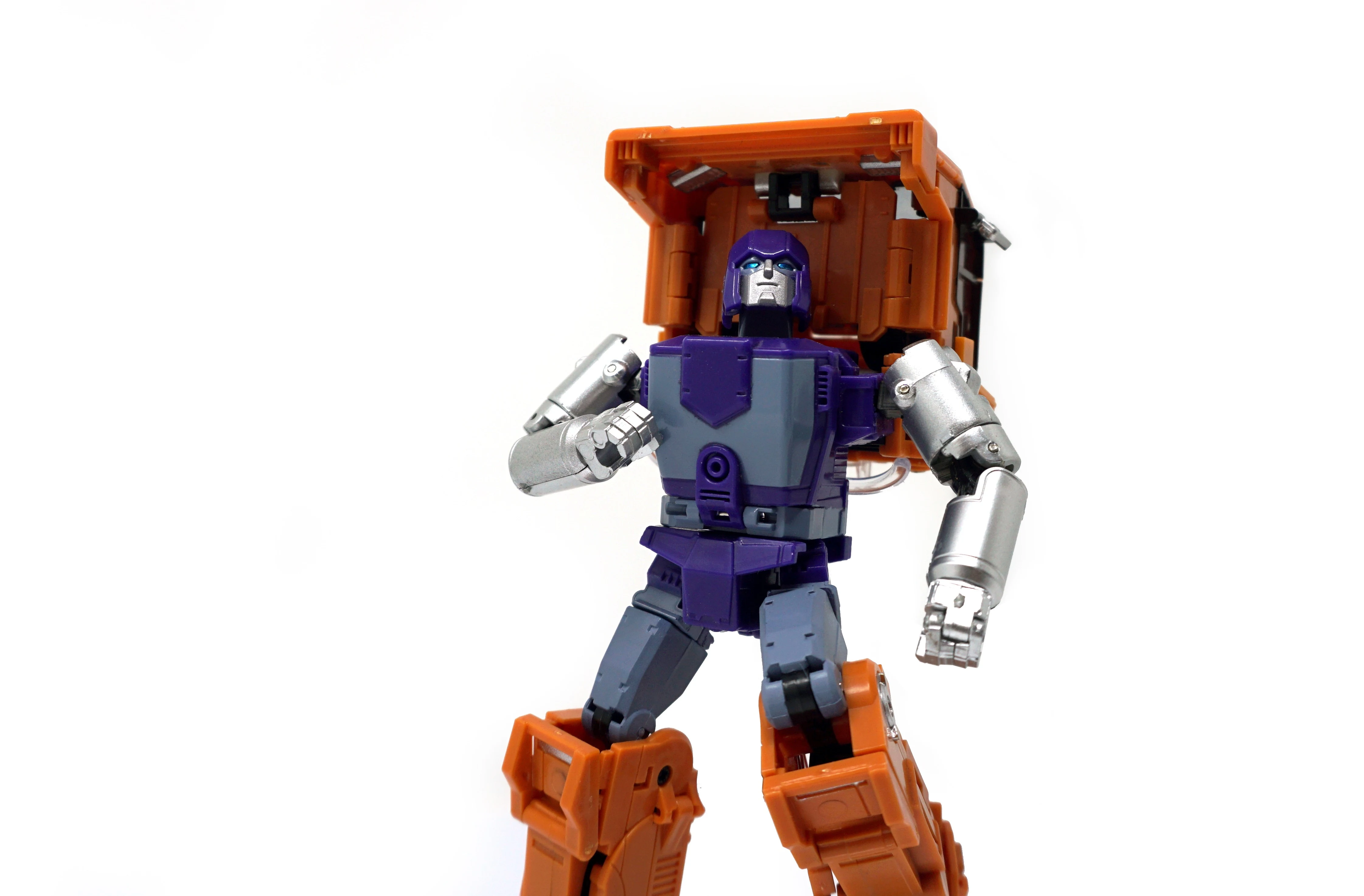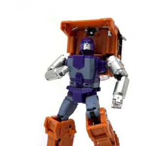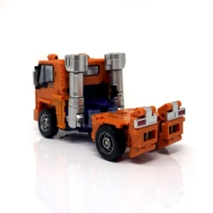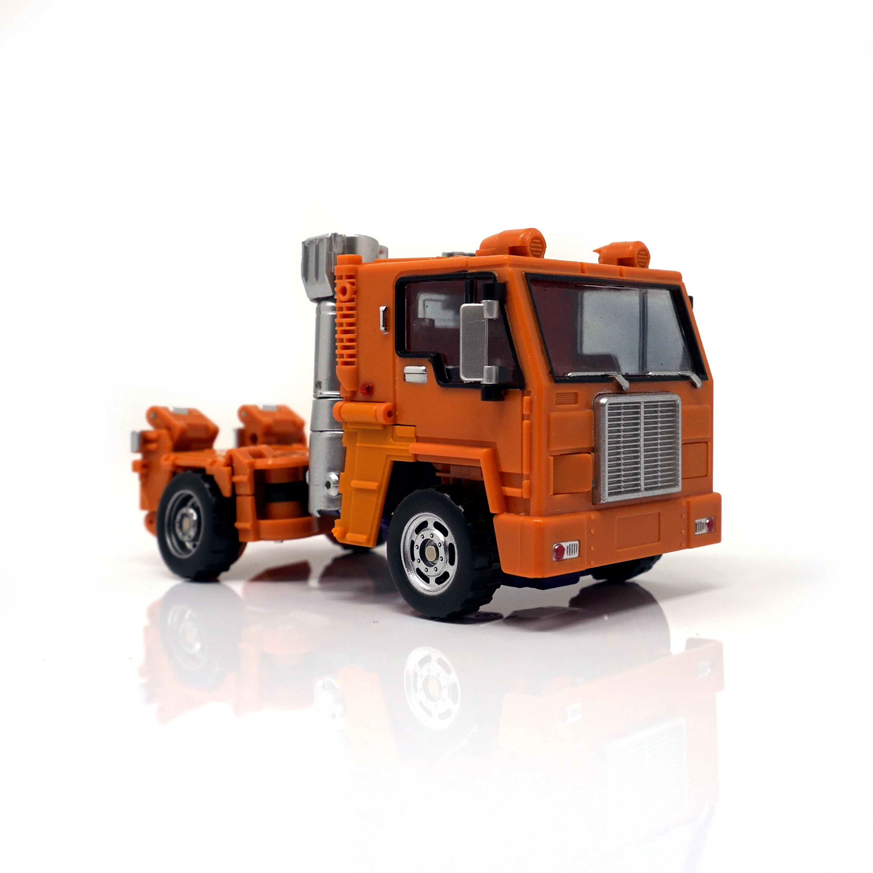 OTS-01 Huff is MP scale and sized! Figure stands 15CM/6" in tall in robot mode and transforms intoa truck. Features die-cast parts, ratchet joints, thick and durable plastic, rubber coating on the tires and accessories!