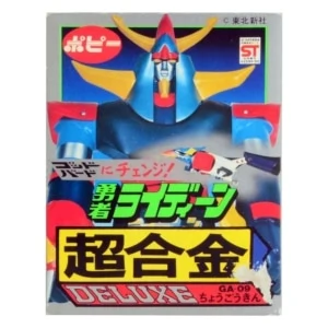Although it stands at roughly the same height as other "standard-sized" chogokin, Raideen is actually the very first of Popy's Deluxe pieces. One of the first handful of diecast robot toys, the transformation mechanism was seen as totally visionary at the time. As with many of Popy's early chogokin relases, the box-art confusingly featured a picture of the Jumbo Machinder Raideen rather than the actual diecast toy. Raideen is also notable for kicking off the (now somewhat overused) concept of the limited edition all-black version. Featuring a matte finish with metallic gold sticker highlights, the black version of the DX Raideen toy looked nothing like the robot that appeared the actual television show. It is unknown how popular these black version toys were among children of the day, but they have become highly sought after collectibles today.