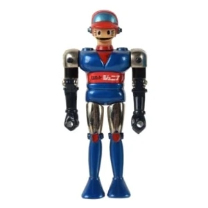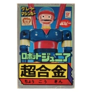 Robot Junior was a secondary character from later episodes of Great Mazinger, and the chogokin portrayal has become quite difficult to find. (Near-universal loathing for the design seems to have kept the production run to a minimum.) The bats can be removed from the back, and a missile can be fired from the elbow of each arm. Popy originally planned to produce a "popinika" of the baseball-cap-shaped spacecraft that forms the cockpit of the robot, but it never saw actual production.