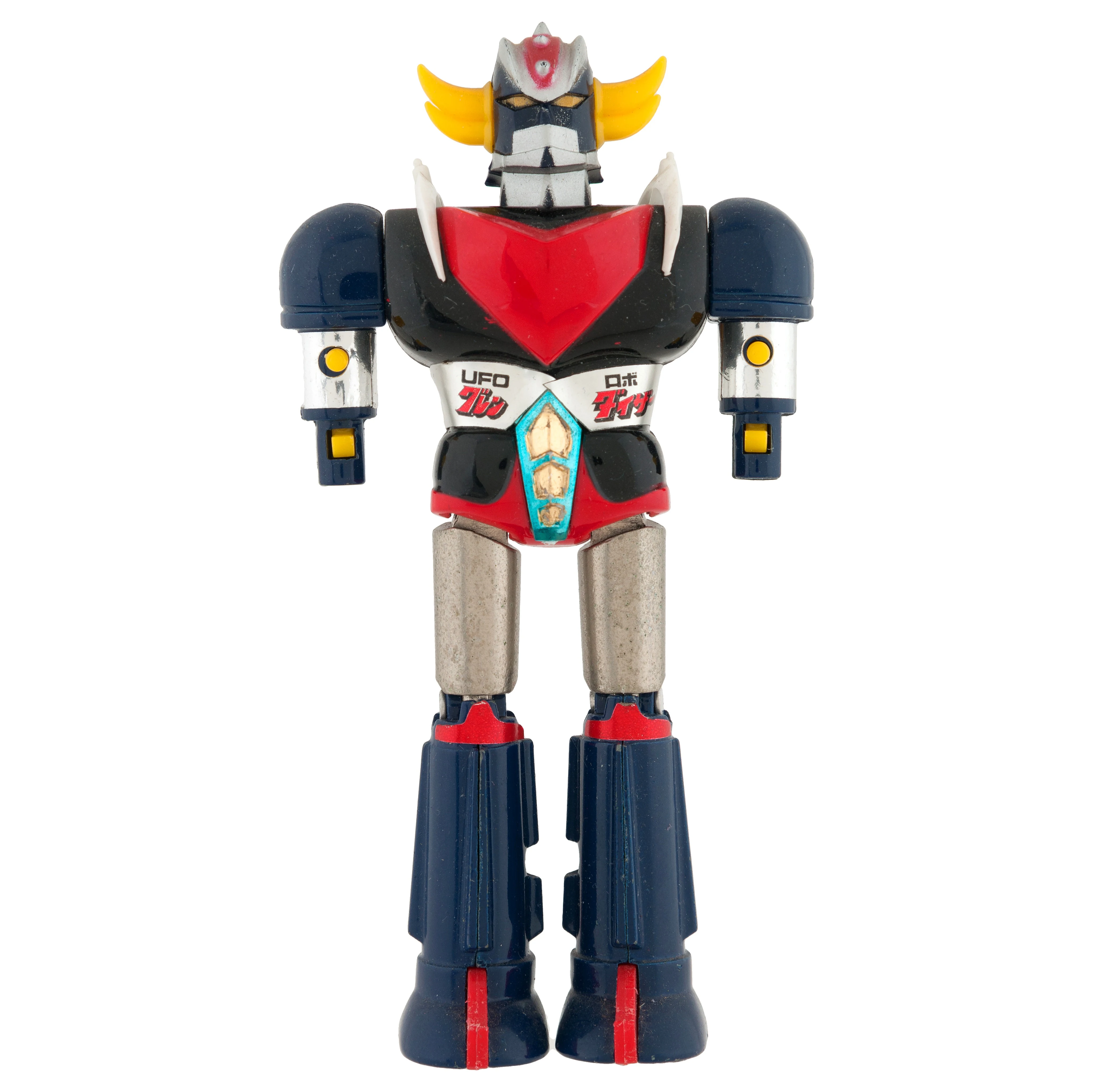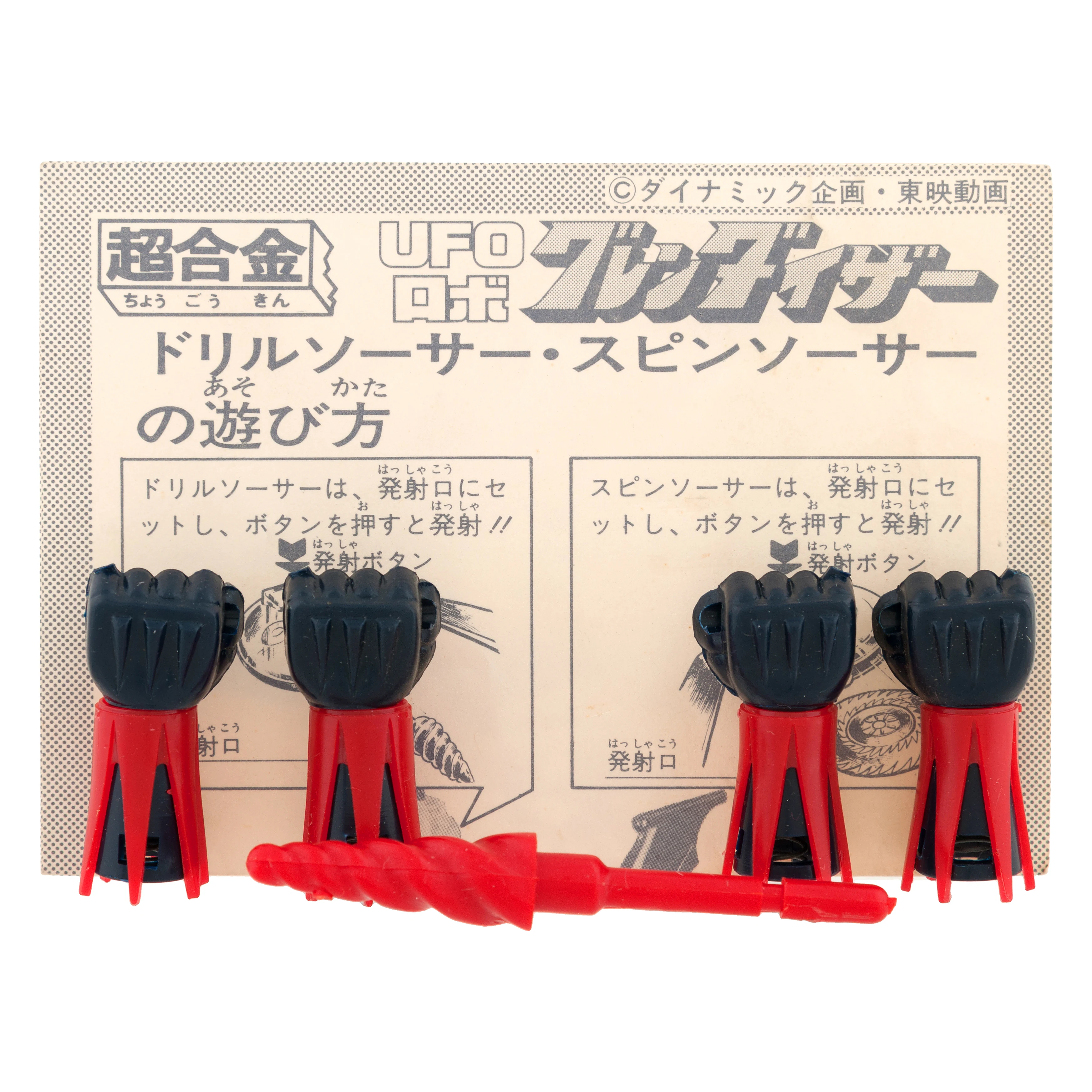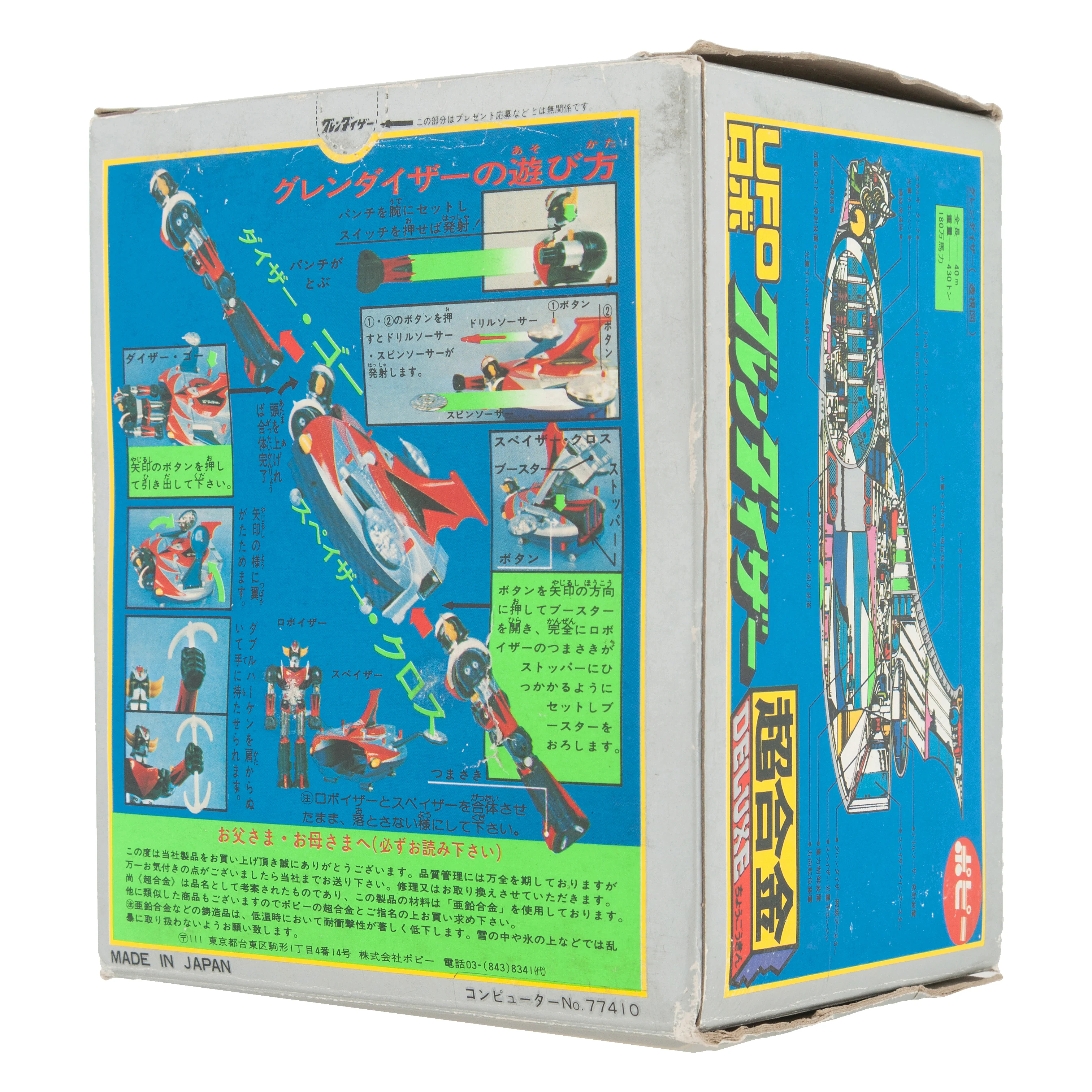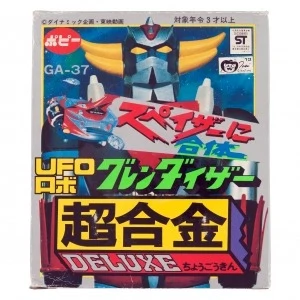Another smash-hit robot design by Go Nagai, who also created Mazinger Z and Great Mazinger as well. Sold both individually and in deluxe sets, Grandizer and his Spacer spacecraft rank among the most popular and beautiful chogokin ever created. The standalone Grandizer diecast was packaged with a large double-barreled weapon called the "Antigravity Dizer Cannon." The deluxe set containing both the Grandizer and Spacer was produced in at least three seperate versions.