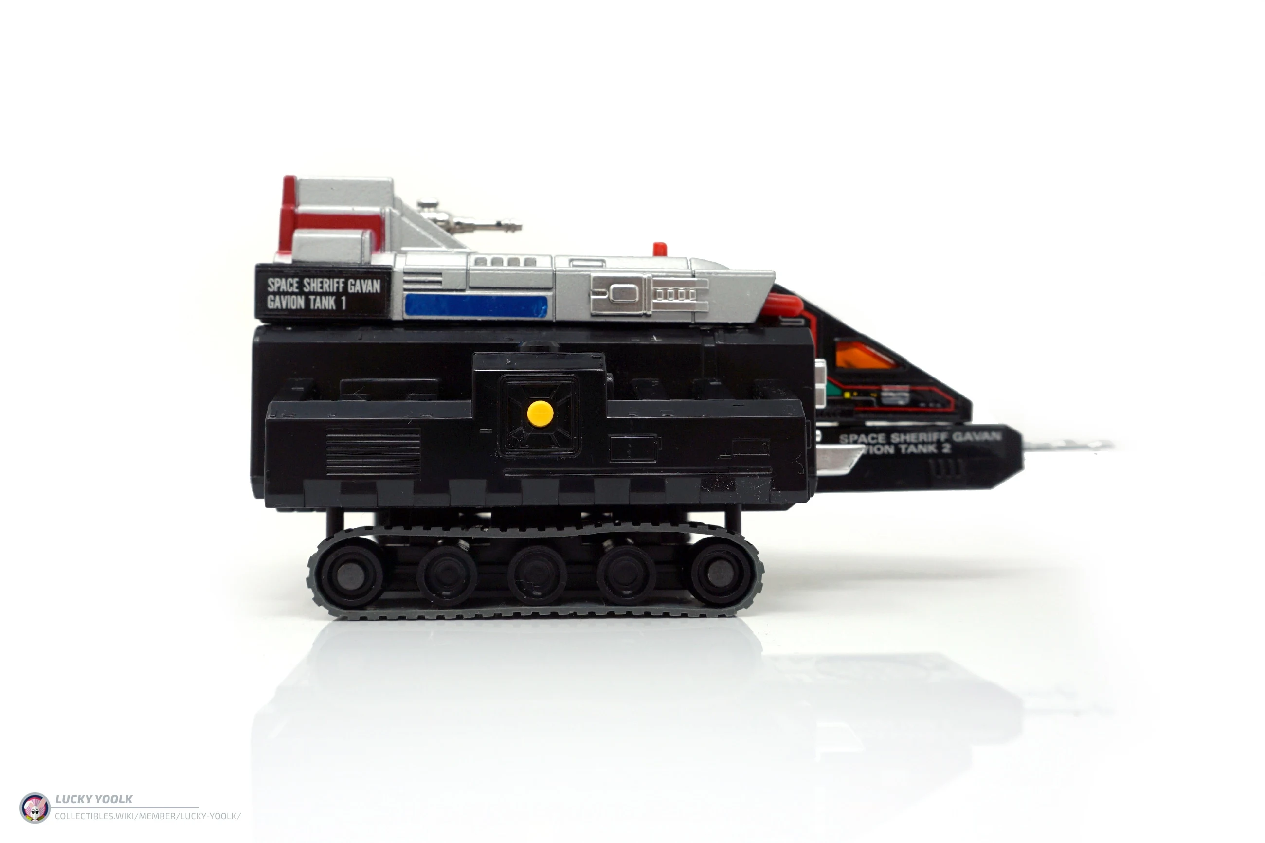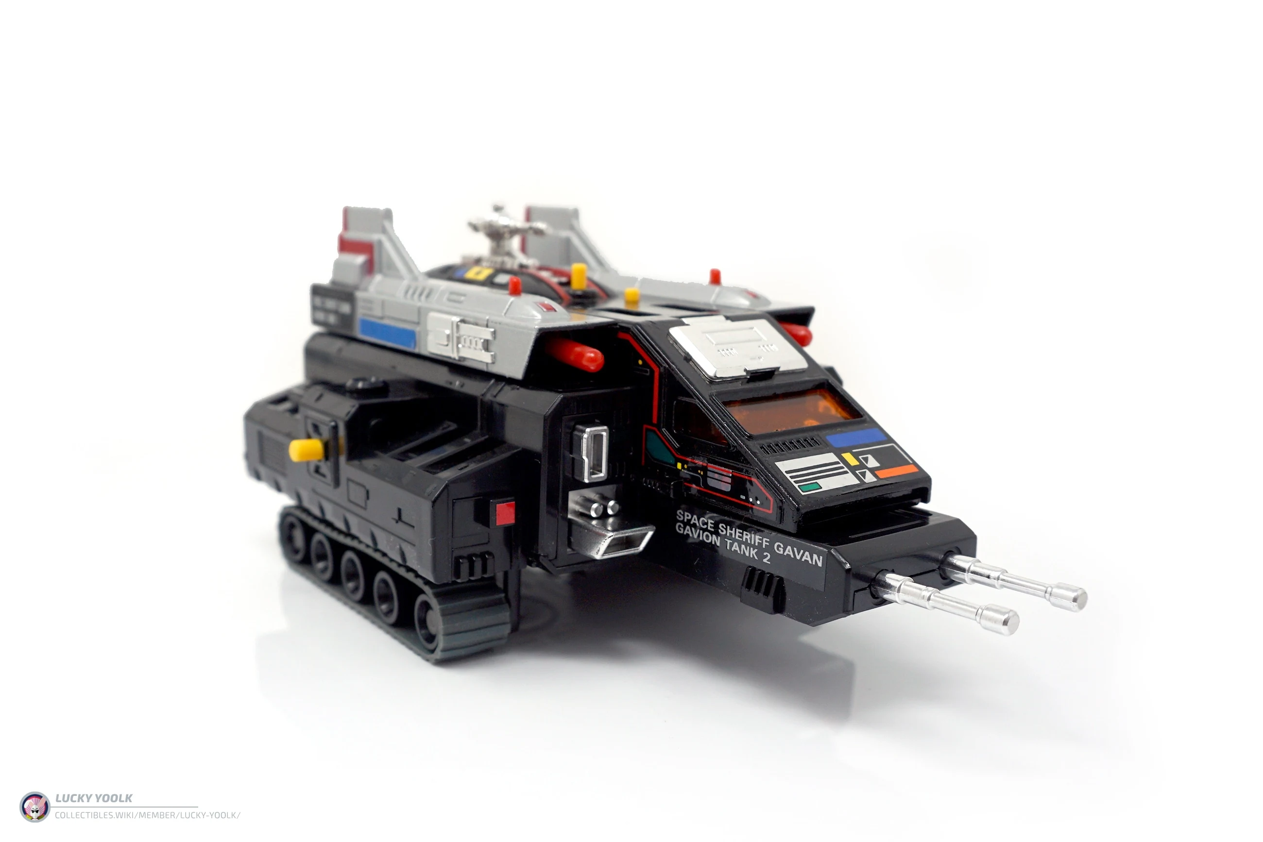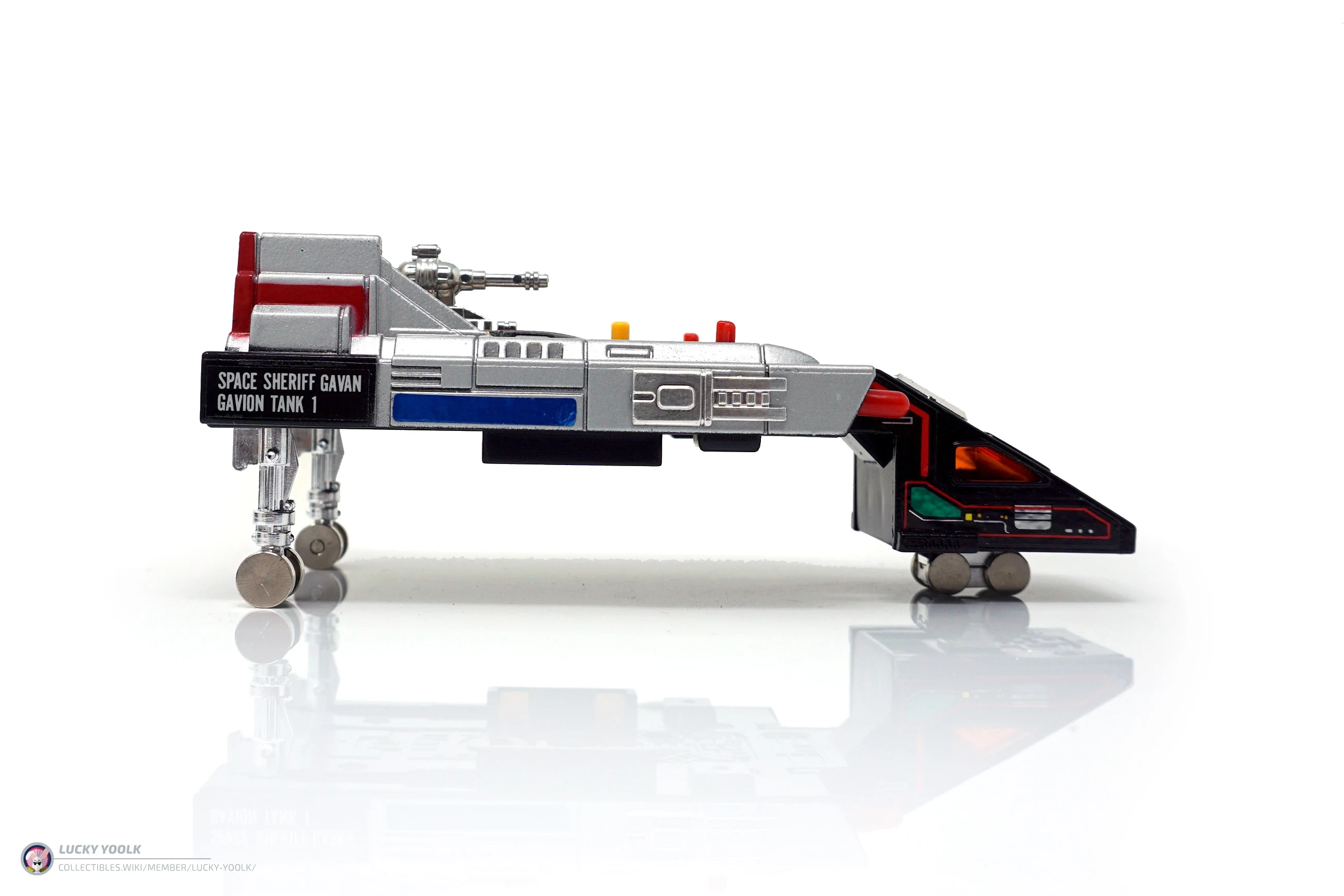 Popy PC-28 Gavion is a spaceship/tank from Space Sheriff Gavan's Tokusatsu. It's mostly die-cast metal, the double drill engine fits inside, spacheship can launch missiles and you can find a Mini Gavan sitting inside the cockpit, a push button release the spaceship and another one release the caterpillars. It comes with notice, 6 missiles and a Gavan mini figure.
