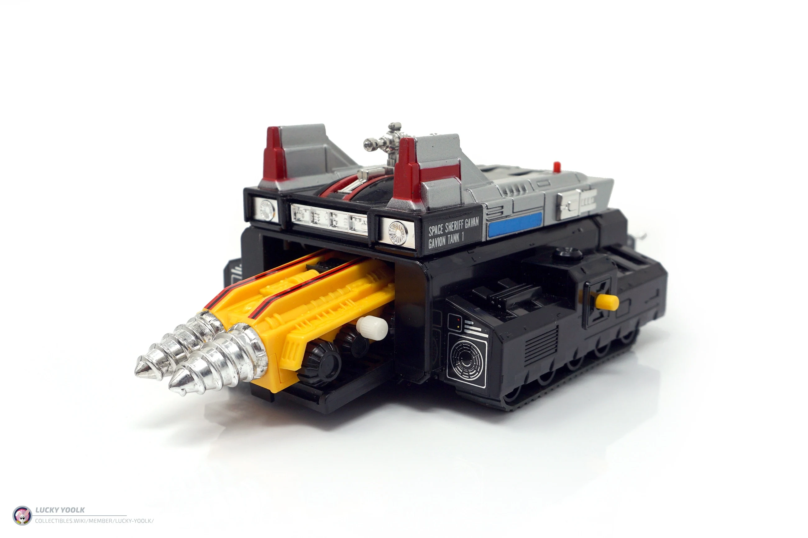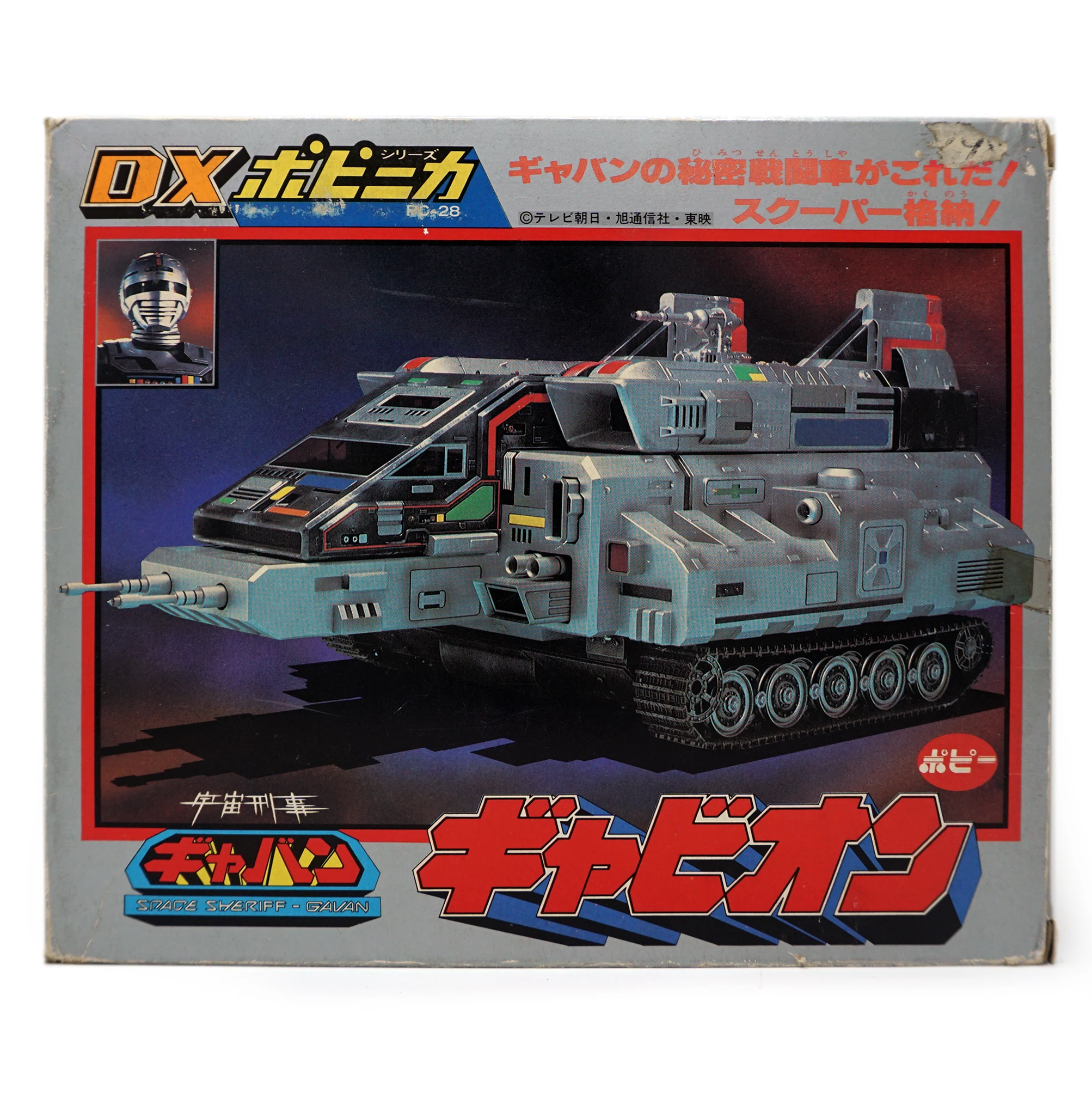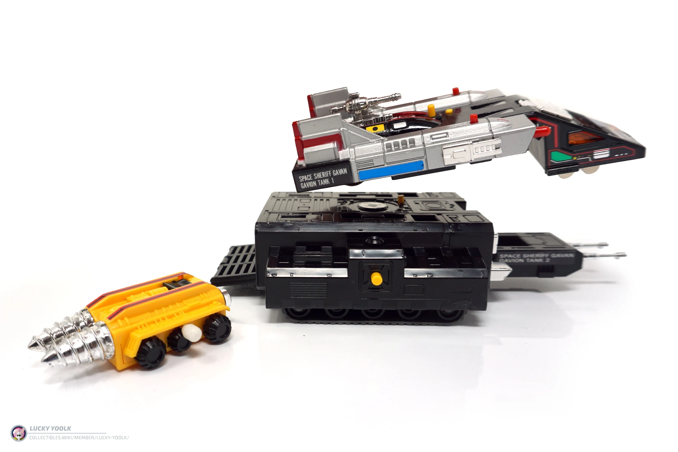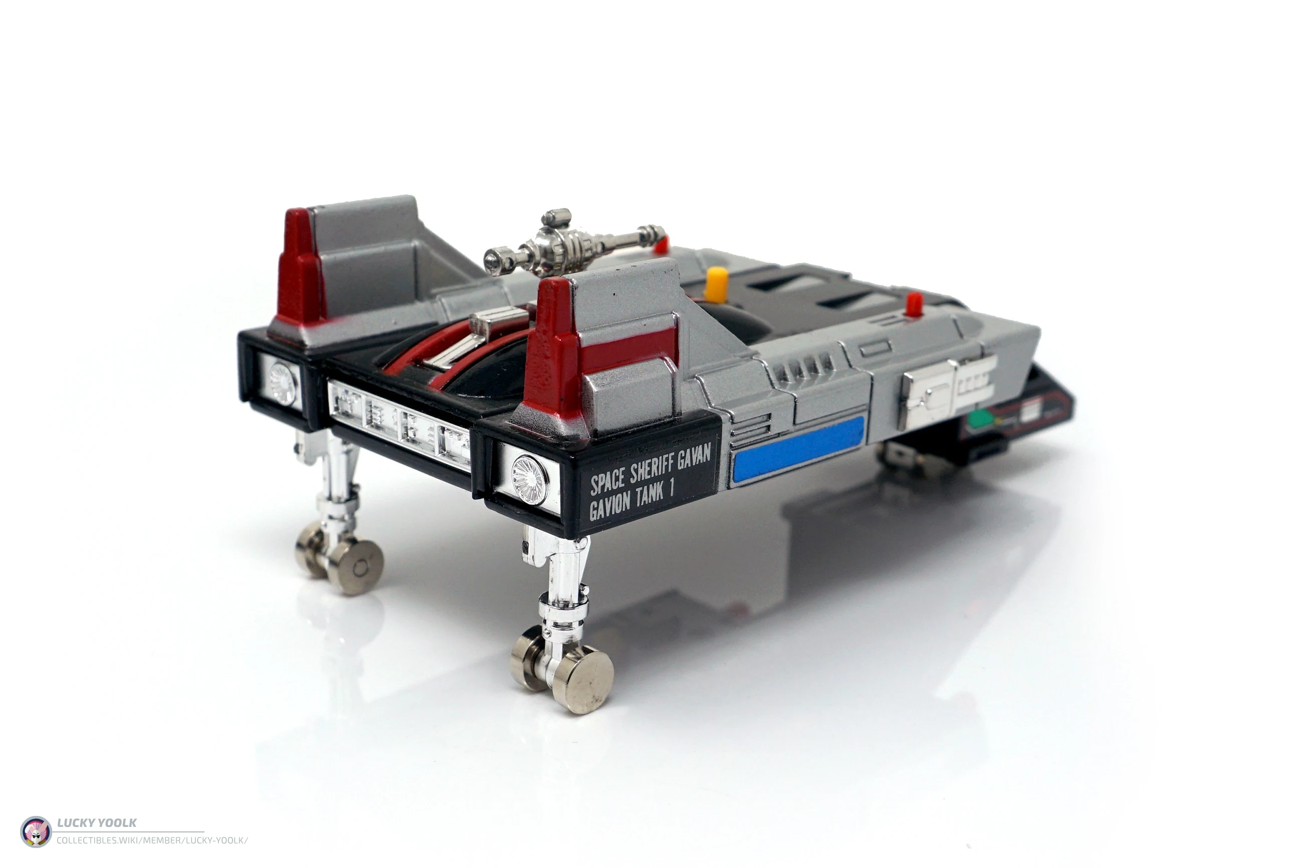 Popy PC-28 Gavion is a spaceship/tank from Space Sheriff Gavan's Tokusatsu. It's mostly die-cast metal, the double drill engine fits inside, spacheship can launch missiles and you can find a Mini Gavan sitting inside the cockpit, a push button release the spaceship and another one release the caterpillars. It comes with notice, 6 missiles and a Gavan mini figure.