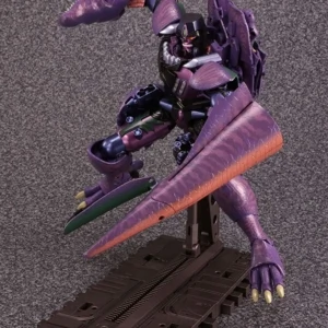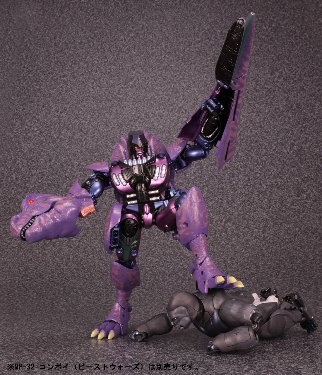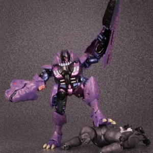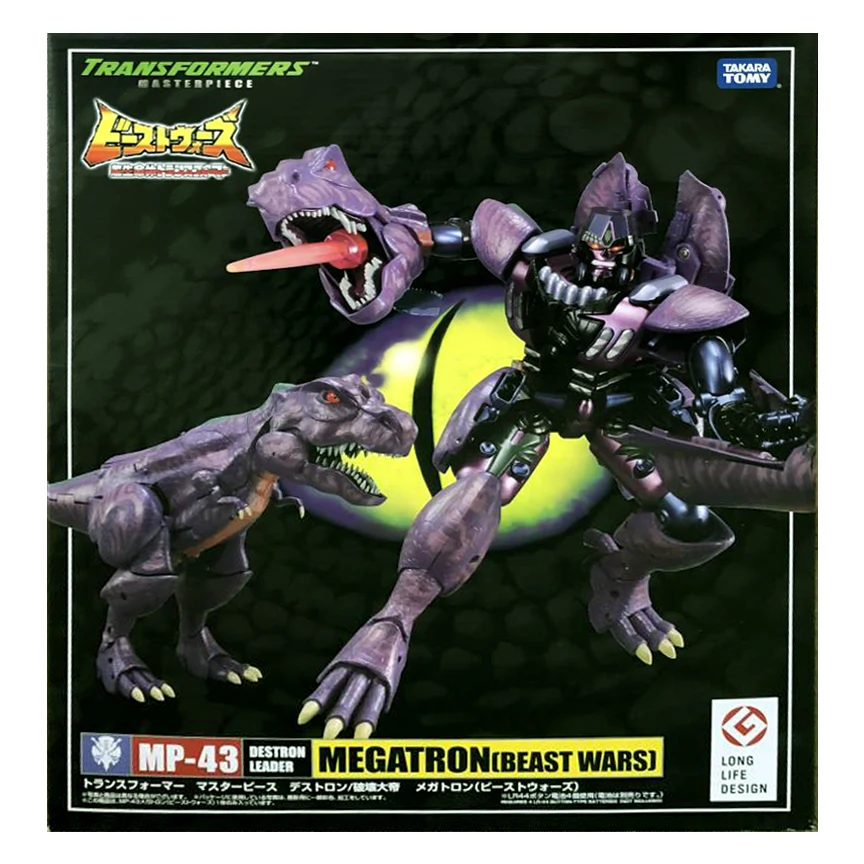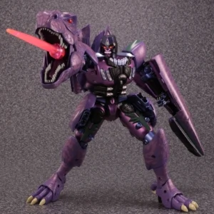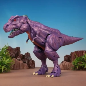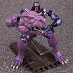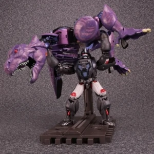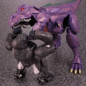 Masterpiece Megatron transforms from a show accurate robot to a show accurate Tyrannosaurus rex. He comes with extra faceplates: alongside his regular, serious face, he can also have a tooth-clenched grimacing face or a smiling face. His T. rex head, similar to Dinobot's raptor head, has two pairs of interchangeable articulated eyes, one being full red and the other featuring show-accurate yellow irises and pupils. He also comes with a laser effect part that plugs into the T. rex mouth, a hunting rifle (as seen in "Call of the Wild"), and a toothbrush to recreate the scene in "Before the Storm" where he is seen brushing his T. rex head/right hand's teeth. To further recreate the scene, all his dinosaur mode kibble can be stripped off to complete Megatron's not-fighting look. Finally, he comes with a stand to assist with multiple action poses: it can be configured for Megatron's robot and dinosaur modes, and can also recreate the scene in "Call of the Wild" where Optimus Primal lifts him overhead each using a unique adapter. With a MSRP of 35,000 yen (approximately 315 USD), this figure had the highest initial price of any mass retail Hasbro or Takara Transformers toy (as opposed to convention exclusives, contest prizes, statues, etc.).