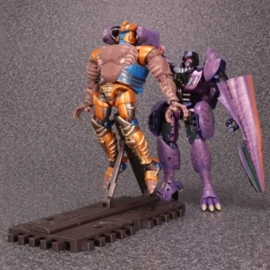 Accessories : Laser effect part, smiling face, grimacing face, rifle, toothbrush, dinosaur tail/weapon, 2 dinosaur thighs/hip armor pieces, 2 shoulderpads, dinosaur belly/backplate, base A, base B, base arm, base adapter (beast mode) base adapter (robot mode), base adapter (robot back)