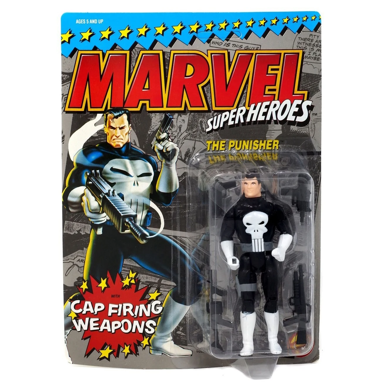 Back card : The Punisher has an explosive arsenal designed to bring any criminal to justice! To "load" his weapon, first rub off the glue on the back of the first cap, then thread the caps carefully through the bottom of the Punisher's backpack with the cap heads facing out. Advance them into position by raising and lowering the trigger on his back. Next, select from his arsenal, his Bazooka, Uzi, Pistol or Sniper Rifle, put it in his hand, aim and release the trigger.