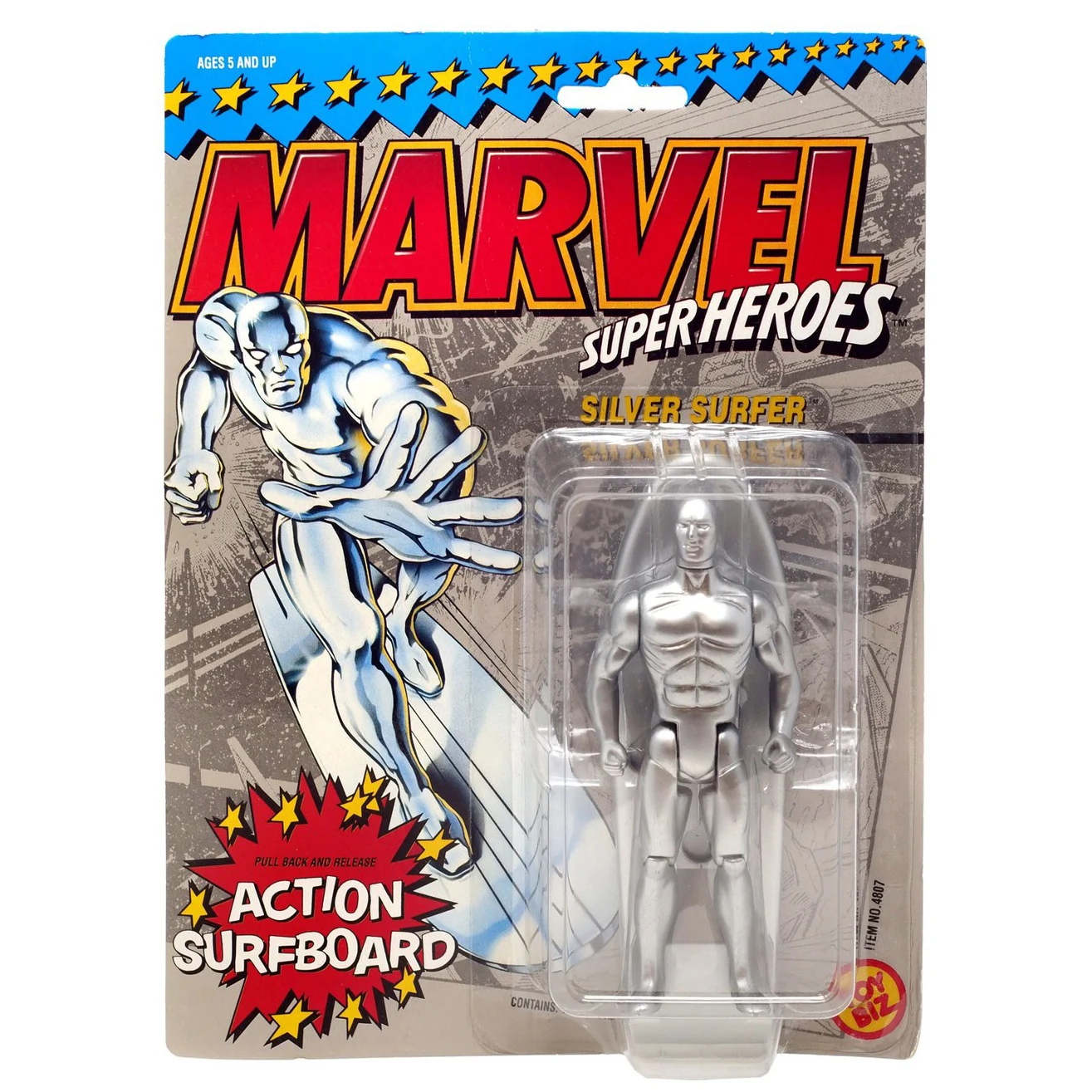 Back card : The Silver Surfer is the mysterious defender of mankind against criminal tyranny! Insert the Silver Surfer's feet into the 2 foot indents in his friction-powered surfboard, pull the surfboard back, release and watch as Silver Surfer zooms straight into the battle against injustice!