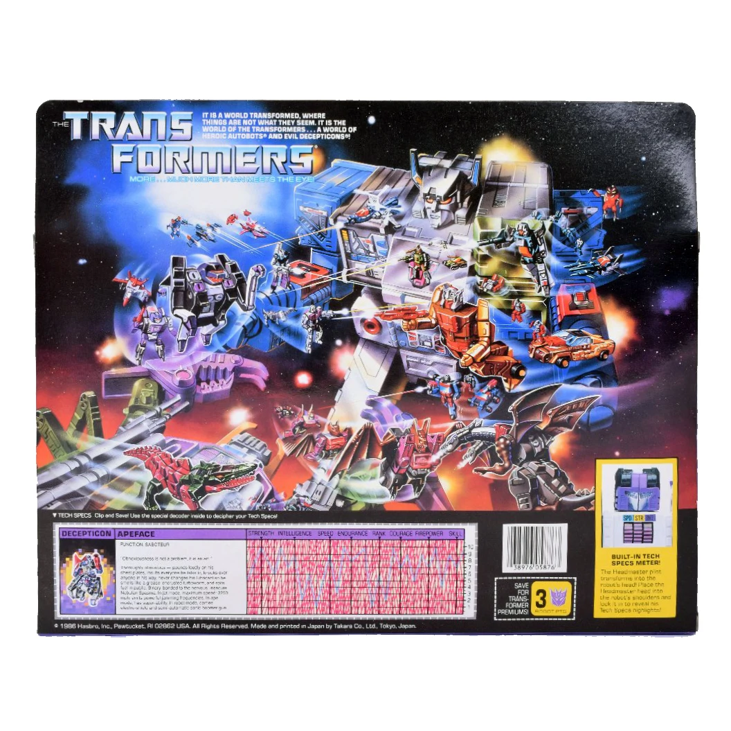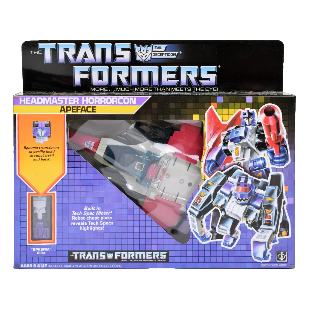 Apeface turns into both a cybertronic jet and a robotic gorilla. Unlike Snapdragon, Apeface's fighter jet mode only looks vaguely like an Earth jet, with his robot limbs hanging off the back of the vehicle in an obvious fashion. His Headmaster partner, Spasma, can ride inside the jet's cockpit. He can mount guns on either side of his vehicle mode, but for some reason only comes with one gun while Snapdragon came with two. As Apeface is a triple changer, Spasma similarly has triple functions, forming both the robot mode face and the gorilla mode face. This beast mode has a relatively wide range of articulation for a Generation 1 beast, but has some minor problems with balance, which limits poses. Apeface's gorilla mode can be placed on all fours, but that results in his head staring at the ground. In robot mode, like all Headmaster toys, Apeface has a flip-down panel on his chest which covers a spring-loaded mini-Tech-Spec-meter which gives readouts for Speed, Strength, and Intelligence. The tumblers are activated when Spasma (or any other Headmaster unit) is plugged into his neck socket. Apeface is very back-heavy due to most of the fighter jet mode ending up on his back. The jet's vertical stabilisers detach to form a shield that can be held in Apeface's hands or attached to his shoulder.