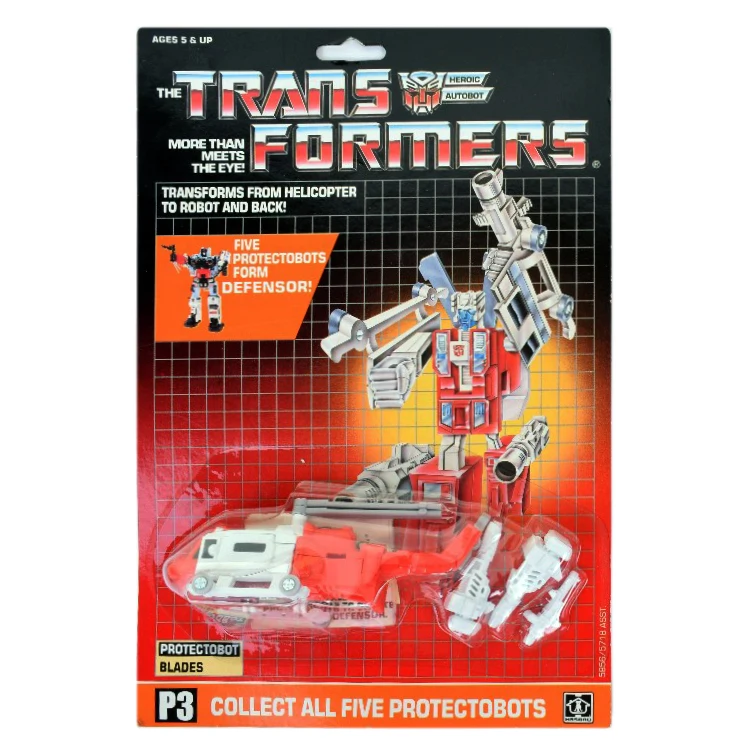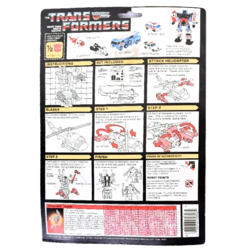 Generation 1 Blades transforms to a rescue helicopter resembling a Bell UH-1V Iroquois, also known as a "Huey." He comes with a pair of side-mounted (non-firing) cannons and a small pistol. He is a Scramble City-style combiner limb, who can form the arm or leg of any such combiner—though he normally forms Defensor's right arm. His fists are unusual in that their post holes are on the side rather than the top, an oddity he shares with Groove and First Aid. A hook-shaped handle on his gun allows him to hold it normally... but only in his right hand. Subsequent releases of him in the "Classics" line omitted the rubsign. Blades and the other Protectobots were re-released in 1991 as part of the European-market Classics line. This mold was also redecoed into Operation Combination Fly-Up.