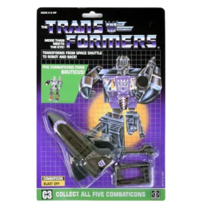Blast Off transforms into yet another International NASA Space Shuttle. In this mode, he is armed with two laser cannons mounted to his engines. In robot mode Blast Off is armed with a small laser pistol and his two laser cannons, which are now mounted on his legs. Along with fellow Combaticon Vortex, Blast Off is the first Transformer figure to use ball joints, located in his shoulders. He usually forms Bruticus' right arm, but as a Scramble City-style toy, he can be connected with any limb slot on Bruticus. Blast Off and the other Combaticons were re-released in 1991 as part of the European-market Classics line. This mold was also used to make Operation Combination Shuttle Gunner, as well as 2001 Robots in Disguise and Universe Movor.
