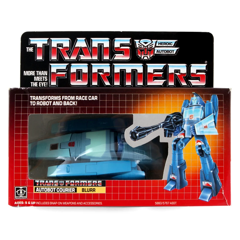 Blurr transforms into a blue Cybertronic hovercar. As his type of vehicle didn't have traditional rubber-tired wheels, he instead had small plastic wheels on his robot legs, which were tucked underneath the length of the hovercar mode. The nose portion of the vehicle detaches to serve as a shield in robot mode. The initial releases of this toy have decals on the side of his vehicle mode pontoons that are cut in a "V" shape. Later releases made the decals a simpler four-sided shape with a darker blue in the former empty part of the "V", matching the plastic color beneath. There is also a variation to his rifle; the main body of the rifle has three small holes in the rectangular indent just over the hand-peg, but only on one side. Samples with the holes on either side of the rifle have been found. The large circular indent at the back of the rifle body, a detail that appears on both sides of the gun, is also deeper on the side that the three holes appear on.