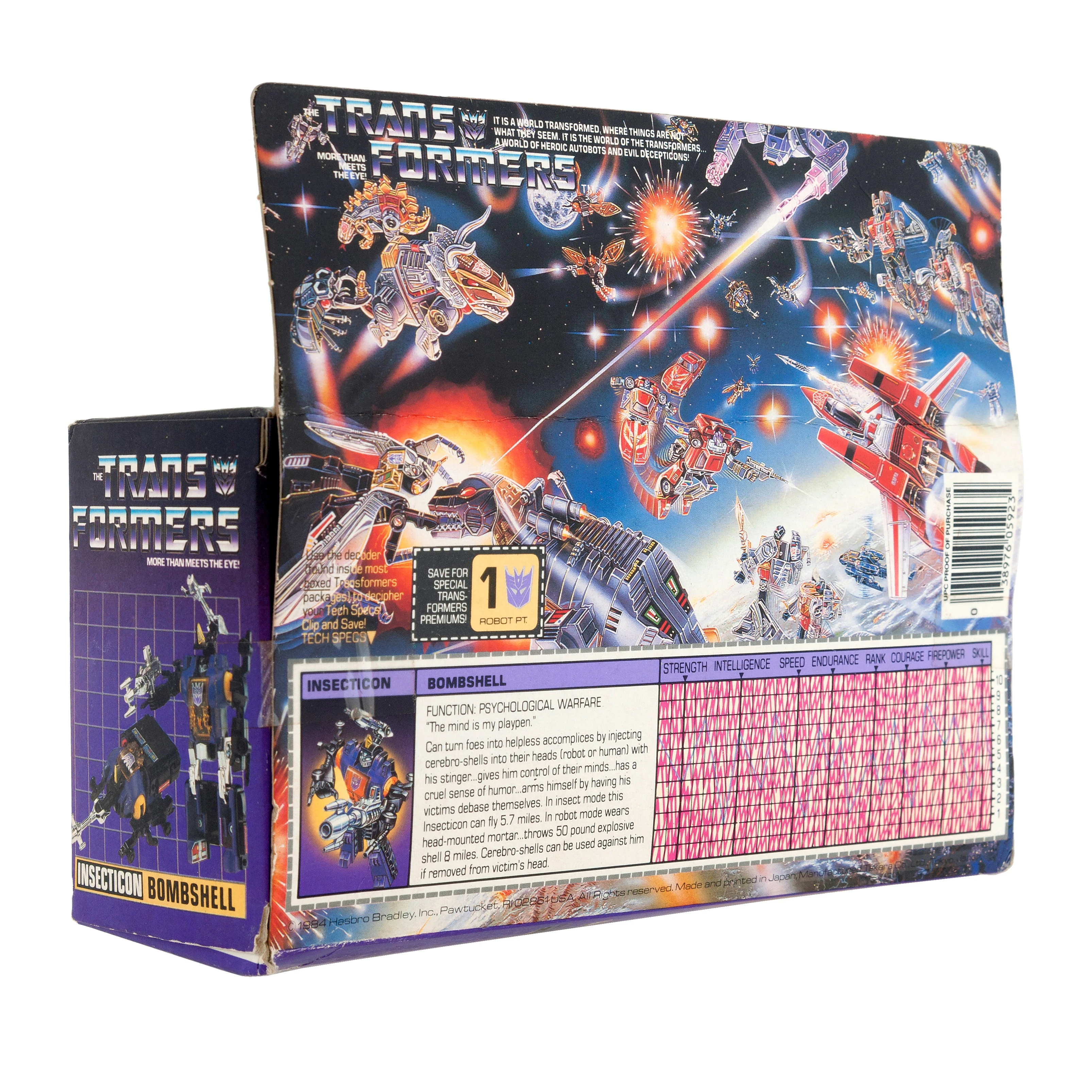Bombshell is a redeco of the Diaclone Waruder Insecter Robo "Kabutron" toy. Bombshell transforms into a robotic rhinoceros beetle and doesn't do a whole lot more than that. There is a variation on the mold's insect mode horn; some versions have a rounded indent on the "top" part near the base-joint, allowing it to fold down further in robot mode. As a legacy of his past as a mold from the Diaclone toyline, he has an opening canopy which can seat a Diaclone driver figure. In Japan, Bombshell and the other Insecticons were "re-released" as mail-order items from 1987 through 1988. They each cost 880 yen (their normal retail price) and two robot points. This mold was used to make the Salvo drones.