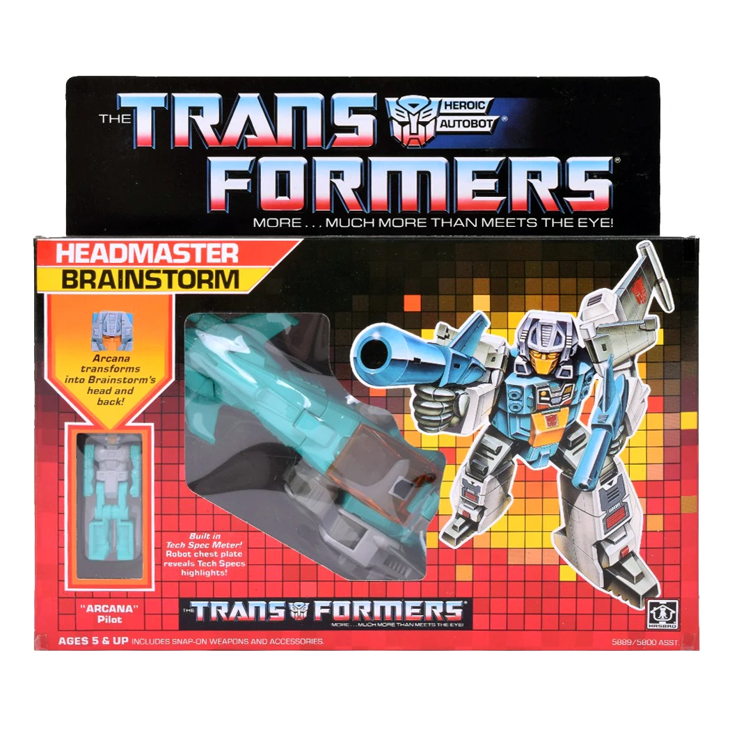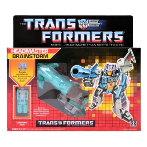 Brainstorm transforms into a turquoise Cybertronic fighter craft. Both of Brainstorm's twin pistols attach to the front of his alt-mode's nosecone to extend it and augment it with two canard wings. As with all larger Headmaster toys, Brainstorm features both a cockpit suitable for his partner, Arcana, to sit in and an abbreviated Tech Specs bar graph inside his chest hidden under a hinged panel. When a compatible Headmaster head is plugged into the socket on Brainstorm's robot mode, the bars will show three of that head unit's Tech Specs.