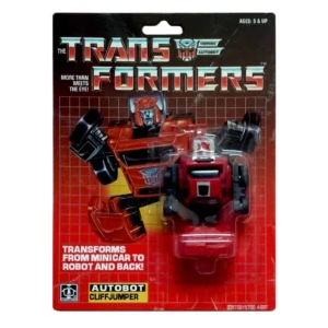 Part of the original 1984 range of Autobot Mini Vehicles, Cliffjumper began life as a Microchange "MC-04 #01 Porsche 924 Turbo", a super deformed "Penny Racer"-style representation of the real car. Though broadly similar in construction to Bumblebee and commonly called a redeco/retool of him by fans, Cliffjumper is actually an entirely different mold that just uses the same transformation scheme. This confusion was not helped by the fact that both Cliffjumper and Bumblebee were released in both red and yellow during the first two years of the Generation 1 toyline; a move designed to "make the line look bigger" according to former Hasbro R&D Vice President George Dunsay.[1] In 1984, Cliffjumper and the other Mini Vehicles came packaged in vehicle mode; in 1985, they were switched to come in robot mode, a change preceded by the addition of a picture of their vehicle modes to the front of their cards. The same year, the Autobot insignia on Cliffjumper's roof/chest was replaced with a heat-activated rubsign. Later in 1985, Cliffjumper and the Mini-Vehicles came packaged with Mini-spies. This mold was also used to make Carrera (see below), and was retooled to make Hubcap. A yellow version of the Microchange "MC-04 Mini CAR Robo 02 Familia 1500XG" mold was also available packaged on Cliffjumper cards. As an entirely different mold, this toy was not regarded as a variant of Cliffjumper, but rather as a separate character that the fandom christened "Bumper".