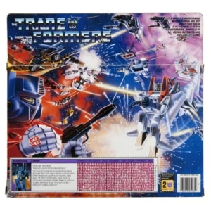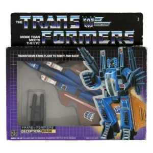 A retool of the Starscream mold, Dirge transforms into a modified F-15 fighter jet with a delta wing and front canard. The spring-loaded missile launchers were replaced with simplified non-firing... rifle barrels? In robot mode his official instructions have the user pulling down his nose cone to complete his head transformation, like Starscream. However, Dirge's character model depicts him as having his head untransformed, leaving a distinctive "conehead" shape to his appearance. This trait is shared by Thrust and Ramjet, leading many owners to do the same thing to differentiate the three later Decepticon jets from the three earlier ones. Dirge's robot mode stickers are the same design as Thundercracker's, but in different colors. In Japan, Dirge was only available as a mail-away in 1986 (for 1980 yen and 4 Robot Points). This sculpt was also used to make Ramjet, Skywarp, Sunstorm, Thrust, and Thundercracker.