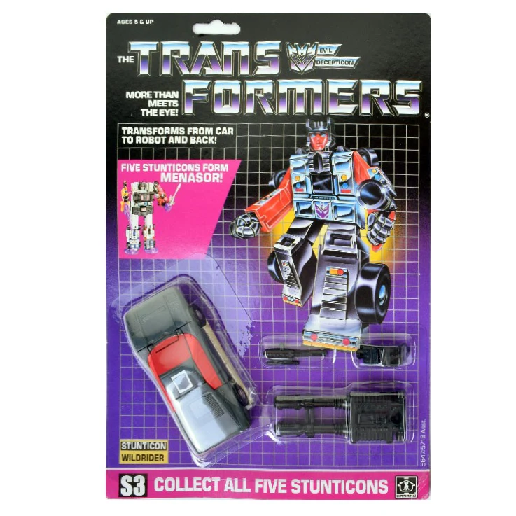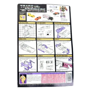 Drag Strip transforms into a Tyrrell P34 Six-Wheeler race car. He comes with a purple double-barreled plasma energy cannon that attaches to the back of his vehicle mode. In robot mode he is armed with a small purple "Gravito-gun". His fists do not have peg holes, allowing them to be less obvious in vehicle mode. Because of this, his weapon plugs into the top of his wrist. Since he was designed with the Scramble City-style combination, he can form the arm or leg to any similarly-constructed robot combination, though his nominal placement is as the right arm to Menasor. Due to the difference in his frame construction, Drag Strip is the only Stunticon whose car body faces forwards rather than backwards when used as a combiner leg. The picture on the left shows his vehicle mistransformed as the silver-chromed piece is supposed to be flipped back to form the engine block part and cover the Decepticon sigil (see picture here http://toys.tfw2005.com/wp-content/uploads/sites/12/2007/10/transformers-g1-0308_1191473381.jpg). Drag Strip was available as a European Classics toy in 1990. At around this time he was offered as a mail away by the Weetabix Breakfast Cereal in the UK. Aerialbot Fireflight was available in the same offer.