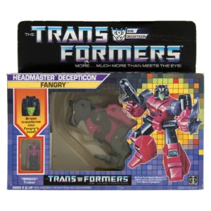 Like the other 1988 Decepticon Headmasters, Fangry's alternate mode is a mix of different animals—in his case, he is a bat-winged wolf with a reptilian tail. (Some might say he more resembles a rat—these people don't voice their opinion within Fangry's earshot, though...) Fangry's robot mode has a panel on his chest which shows a spring-loaded mini-Tech-Spec-meter which gives readings for Speed, Strength and Intelligence. Unlike the larger Headmasters this meter doesn't have a cover, and all three readings are on a single tumbler. The tumbler is activated when Brisko (or any other Headmaster unit) is plugged into his neck socket. Brisko has Fangry's face plainly visible on his back because, as a smaller Headmaster toy, he lacks the flip-down panel that covers the face featured on larger Headmasters. In beast mode, Brisko can fit inside a compartment in Fangry's stomach. In robot mode, Fangry can hold the wings accessory as a shield. Due to his design, Fangry permanently leans a little bit, his robot mode legs unable to hold a perfectly upright pose. You can solve this by unscrewing the wolf arms and removing the springs from underneath. This toy was sold in Japan without changes as Wilder.