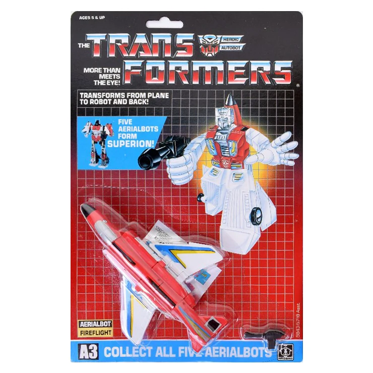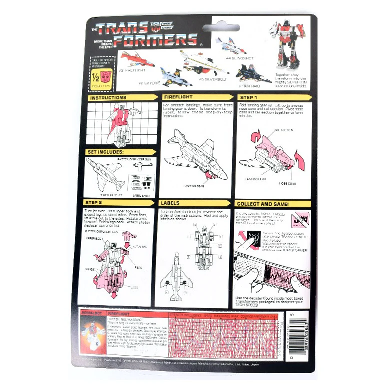 Fireflight transformed into a red F-4 Phantom II with white wings. He could combine with his fellow Aerialbots to form Superion. As a Scramble City-style combiner, he could form the arm or leg of Superion, or any other compatible combiner, though his nominal location was as Superion's right arm. Fireflight was available as a European Classics toy in 1990. At around this time he was offered as a mail away by the Weetabix Breakfast Cereal in the UK. Stunticon Drag Strip was available in the same offer. In Japan, the Aerialbots were also later all made available again as mail-away items during Return of Convoy. The smaller toys cost 1000 yen (120 more than their original retail price!) and 2 robot points.