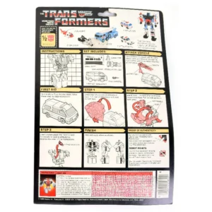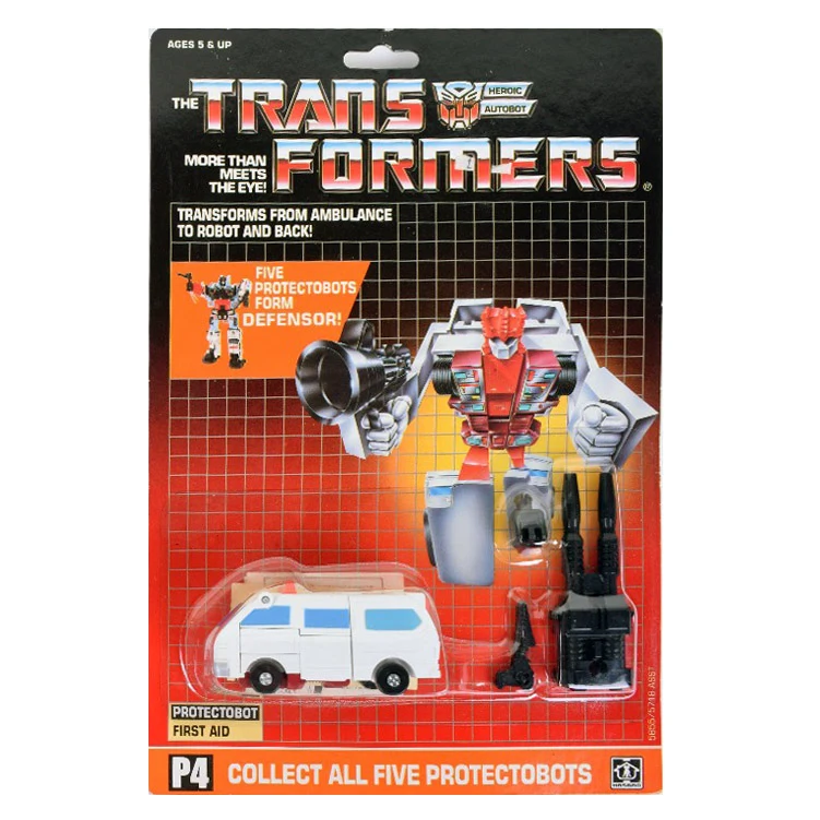 First Aid transforms into a Datsun Vanette C120 ambulance (distinguishable from the Nissan version by its twin headlamps), model year 1980 or later. As a small, simple toy, there are some significant compromises in the appearance of the vehicle to facilitate transformation, such as the rather visible hinge joints for the front end and the big gap in the back of the ambulance to facilitate his knee joint. In vehicle mode, First Aid can be equipped with his large decrystallizer cannon via a connector piece that plugs into the 5mm peg hole on his rear, while in robot mode, he is armed with a small photon pistol. First Aid combines with his fellow Protectobots to form Defensor, taking the nominal position of left arm. As a Scramble City-style robot, however, he can form any limb for the robot, and can interact with all other combiner teams built with the same design. The initial release of First Aid had a die-cast metal chest, but like several other 1986 toys, later releases replaced this with red plastic. In 1987, he came packaged with a random Autobot Decoy. First Aid and the other Protectobots were re-released in 1991 as part of the European-market Classics line. This mold was redecoed as Safety from the Guard City giftset in the Operation Combination toyline.