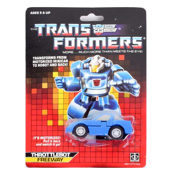 Freeway transforms into a Chevrolet Corvette. Like all Throttlebots, Freeway's primary gimmick is a pull-back motor that sends him zipping forward in either car or robot modes. In 1991, Freeway and the other Throttlebots were re-released in the European market as part of the "Classics" line. For this release, all of the Throttlebots but Wideload were retooled to have their rubsign indents removed, the decals replaced with normal factory-applied paper faction sigil decals.