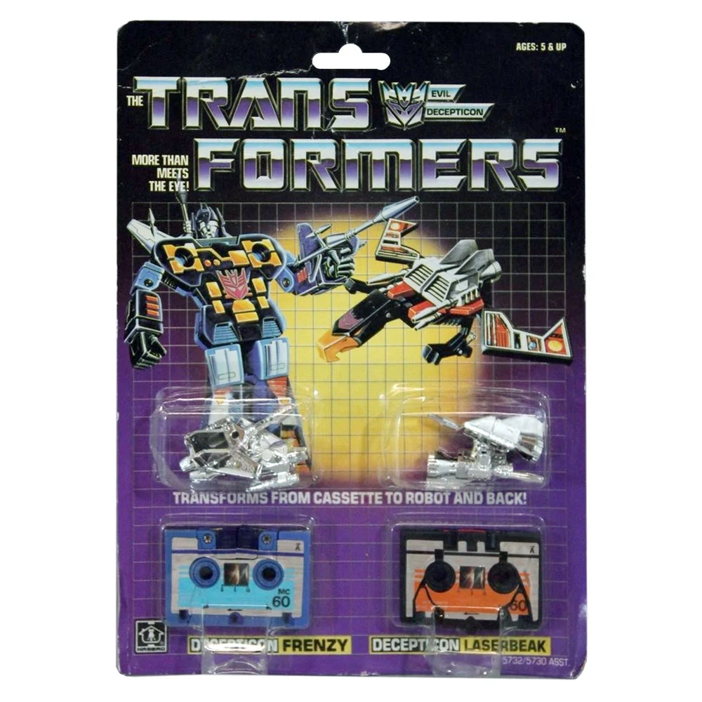 Frenzy was part of the first wave of Transformers toys released in 1984. He transforms into a blue microcassette that can fit into the tape doors of the Soundwave and Blaster toys, and is armed with two silver chromed "Thruster Guns" that can either plug into the cassette spool holes on his back or slot onto his arms. Sold in a two-pack with Laserbeak, Frenzy was originally released with a Decepticon insignia sticker on his stomach, which was removed in 1985 in favor of a heat-sensitive rubsign on his cassette mode front. This mold was redecoed to create the simultaneously-available Rumble, as well as Enemy. It can also be repurposed as G1 cartoon Rumble (which obviously also applies to many of the following toys, so we won't repeat ourselves). Laserbeak transforms into a microcassette that can fit into the tape door of the Soundwave and Blaster toys. He was released in a two-pack with Frenzy in Hasbro markets across 1984 and 1985; in the latter year, a heat-sensitive rubsign was added to the figure. His chromed thruster-blaster add-ons have some very minor mold variations to them, like several other early Transformers toys... which we're frankly not going to try and catalog which later reissues have which versions because argh. This mold was also used to make Buzzsaw, Garboil, and Sundor.