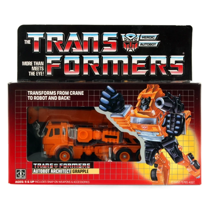 Grapple transforms into an orange crane based upon the same Diaclone truck design that Inferno uses, the Mitsubishi Fuso. Each of his forearms contains a spring-loaded missile launcher, so he can fire his own fists or silver missiles (though the mechanism was severely neutered in the original US releases). He is also armed with a small black Arc-Welder rifle. This version of this mold was also used to make e-HOBBY RoadHauler. The fire engine version of the mold was released as Inferno and Headmasters Artfire.