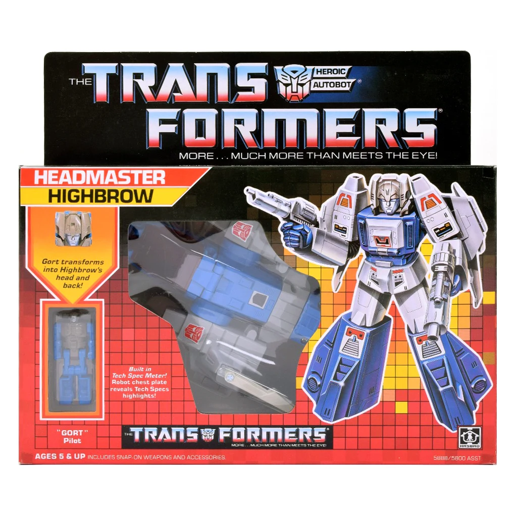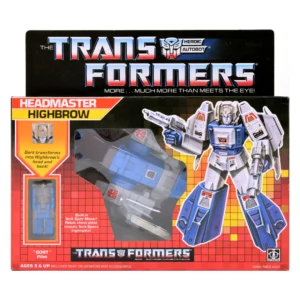 Highbrow transforms into a cybertronic twin-rotor helicopter. His two "Corrosive Acid Rainmaker Rifles" can attach to the underside of his wings or under the helicopter's nose to create Highbrow's "attack helicopter" mode. His Headmaster partner Gort can sit inside his cockpit in either vehicle mode. In robot mode, like all Headmaster toys, Highbrow has a flip-down panel on his chest which covers a spring-loaded mini-Tech-Spec-meter which gives readouts for Speed, Strength and Intelligence. The tumblers are activated when Gort (or any other Headmaster unit) is plugged into his neck socket. With Gort plugged in, Highbrow's tech spec tumblers display 7 for Speed, 7 for Strength, and 7 for Intelligence.
