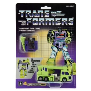 Hook was originally from Takara's Pre-Transformers Diaclone toyline, as Construction Vehicle Robot No. 3 Truck Crane. He transforms from a bright green robot to a bright green Nissan Diesel Unic truck crane. Hook can also form an Attack Crane mode by attaching Devastator's head and head gun behind the vehicle mode cab. He can combine with his fellow Constructicons to form Devastator, functioning as the upper torso. On the European continent, Hook was initially released individually alongside the other Constructicons by Hasbro's subsidiary Milton Bradley (MB) in 1985. In 1986, Hook and the other Constructicons were re-released in Europe, albeit this time in "Hasbro"-branded packaging (but manufactured by Joustra). The main difference with all other releases thus far was that the Constructicons' main color was now yellow instead of green. These are not to be confused with the later, non-combining yellow European Constructicons, nor with the yellow Generation 2 Constructicons (see below for both).