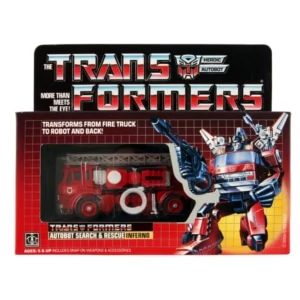 Inferno transforms into a Japanese Mitsubishi Fuso F-Series FT fire ladder truck. His ladder has three sections to it, allowing it to extend to a really impressive length. Each of his forearms contains a spring-loaded missile launcher, so he can fire his own fists or silver missiles, though the Hasbro versions have these launchers severely weakened for safety reasons. He is usually depicted in media as having a missile/laser/nozzle in place of a hand on his right arm. He is also armed with a small black Extinguisher rifle. Inferno's toy has been reissued as part of the Classic Heroes line in 1990, the Generation 2 line in 1993, and The Transformers Collection and the Commemorative Series in 2003. See below for individual entries on these releases. This sculpt was redecoed and partially retooled to make Grapple, the e-HOBBY exclusive Collector's Edition RoadHauler and The Headmasters Artfire.