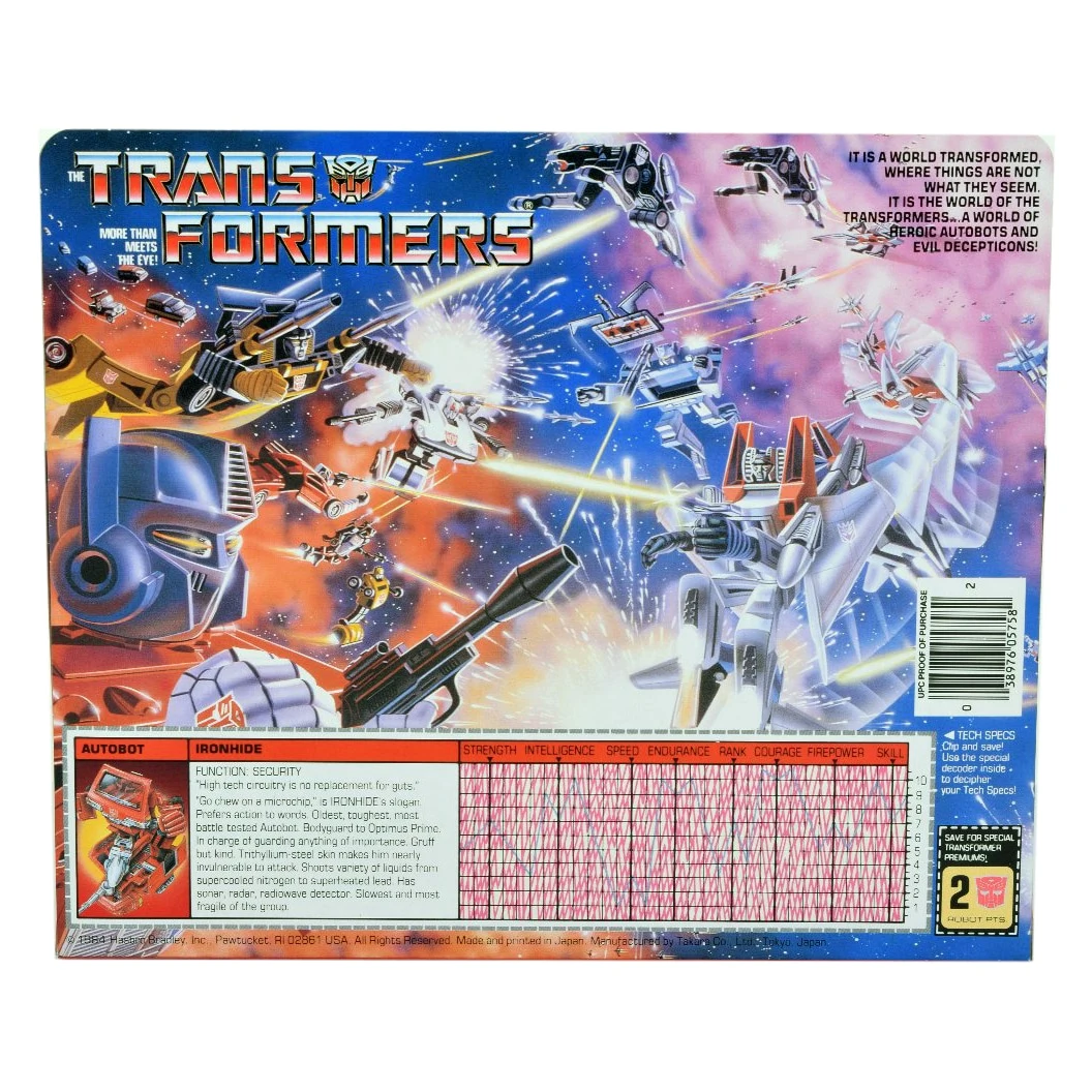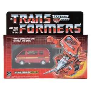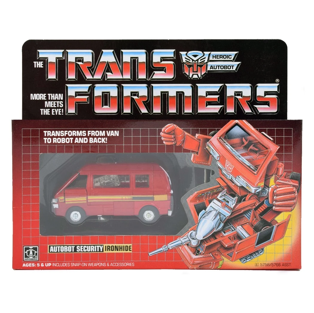 Ironhide was part of the original assortment of Autobot cars released in 1984, transforming into a red Nissan Sunny-Vanette Coach SGL and sharing his mold with the contemporaneously released Ratchet. Ironhide splits when he transforms, with most of the rear section of his van mode transforming into a battle platform, and the remainder becoming his rather misshapen, headless robot form. The robot can mount onto the battle platform, which is armed with a raising missile launcher and front-mounted "Static Laser Gun". Unusually for toys of this period, the Static Laser Gun can actually store when Ironhide is in vehicle mode, plugging into his undercarriage (although the missiles for his launcher and the peg required to attach the laser don't go anywhere). As with all his fellow Autobot Cars from that year, Ironhide's mold derived from Takara's Diaclone line, a series which was not about sentient robots, but rather human-controlled machines. The Ironhide and Ratchet molds are the ones that most clearly show evidence of this: in place of a head, these toy robots had chairs behind windscreens where the human rider would control the robot. The figures did include stickers to go over these seats that depicted a sort of robot face, but when Ironhide and Ratchet's character models were created for Transformers media, they did away with all traces of the human-controlled design to give the robots proper faces and heads, ultimately creating the two designs which were the most far-removed from the toys on which they were ostensibly based. The stripe on the side of his vehicle mode (a sticker on the toy) is actually based on a special edition of the Nissan Cherry Vanette. On the real vehicle, the rear section (which is black on the toy's sticker) is actually the sliding rear door rail. For unknown reasons, Ironhide was the only Autobot Car not released by Takara as part of their original retail line in any form (while Ratchet was not available at retail, he was available as a S.T.A.R.S. mail away item). Ironhide was reissued several times; this article lists each reissue separately where appropriate.