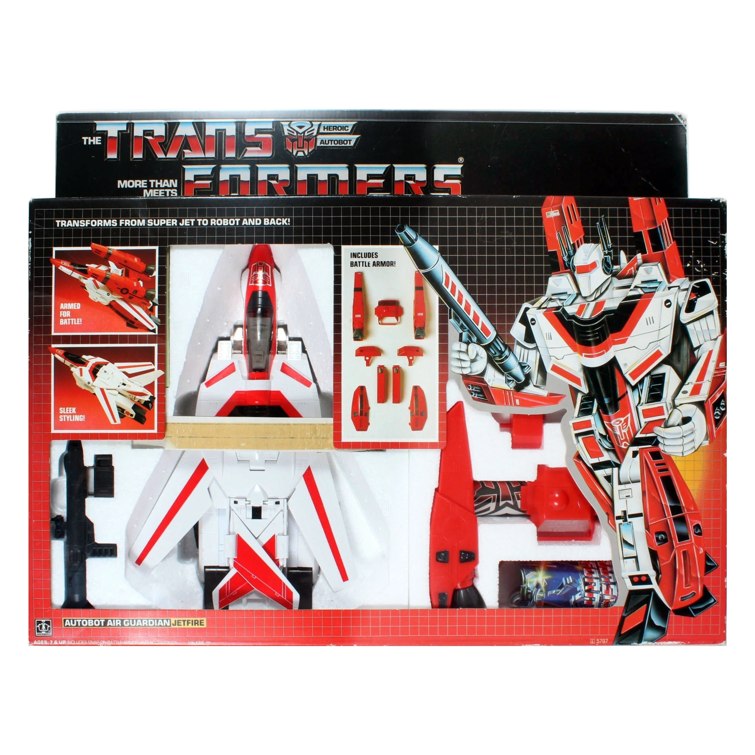 A redeco of the Takatoku Toys Macross VF-1S Super Valkyrie, Jetfire features three modes: robot, jet, and an "alternate transformation" (called the "Gerwalk" form in Macross, and the "Guardian" form in Robotech) that deploys his arms and legs in jet mode. Additionally, Jetfire comes with several red pieces of armor and rocket booster backpack that can snap onto his arms, legs, and back in any mode. He has noticeably more articulation than the other Transformers in the line at the time. The VF-1S toy is based on a design by mecha designer Shōji Kawamori. The shoulder assembly where the jet mode folds in half for robot mode is one of the more commonly broken parts in the early Transformers toy line. The more rigid plastic used on the armor pieces also means that it's not uncommon for their attachment clips to have snapped off. And finally, the small black clip-piece that attaches Jetfire's rifle to his jet mode is possibly one of the most commonly missing accessories on secondhand Jetfires, if not secondhand Transformers all around. The fact that the instructions don't tell you what to do with it doesn't help. The piece is used to hold Jetfire's rifle via the clip attached to the arm, as well as under the jetmode as a belly gun. There were two main variations of the toy: one featuring the Macross UN Spacy logo on the wings, and one without the logo. The Macross logo was either painted on or came as a sticker. The logo-less variant has a continuous red strip along the length of the wing, whilst both logo versions have a slight gap in the paint apps surrounding the logo.