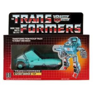 Kup transforms into a Cybertronic pickup truck (though how he is able to carry goods safely with no tailgate is a mystery). The entire front of the vehicle (including the windshield) is made out of die-cast metal. In robot mode, Kup has full shoulder rotation, though the way his elbows are set up means he cannot make full use of their joints. He (somewhat) makes up for it with swivel wrists. His legs feature no articulation whatsoever. Maybe Hot Rod left a piece out. He is armed with a blue laser rifle. Early releases of Kup had metal rear wheels, while later releases replaced them with black plastic. Amusingly, one of the details on the figure's chest sticker depicts a pair of 5 1/4-inch floppy disk drives. Whether that is supposed to indicate that he can store up to two extra Transformers' brains is up to anyone's guess.