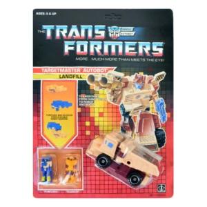 Landfill transforms into a beige and brown off-road earth-moving dump truck, with a non-functional dumping tray (can't even put anything in it) due to his unusual arm transformation sequence. His Targetmaster partners Flintlock and Silencer (or any other accessories with 5mm posts) can be stored in the two peg holes on either side of the dumping tray. In robot mode it is revealed that the reason his tray is non-functional is because the arms are stored within two flip-over panels. As was the standard of smaller Generation 1 toys of this era, Landfill has very limited articulation, all located in his ratcheting shoulder joints (and one has to hold the arm panels in place while rotating the arms themselves). Flintlock and Silencer can become two separate handguns, or either can attach to the rear of the other gun to form a single rifle. No version of this character or mold was released in Japan.