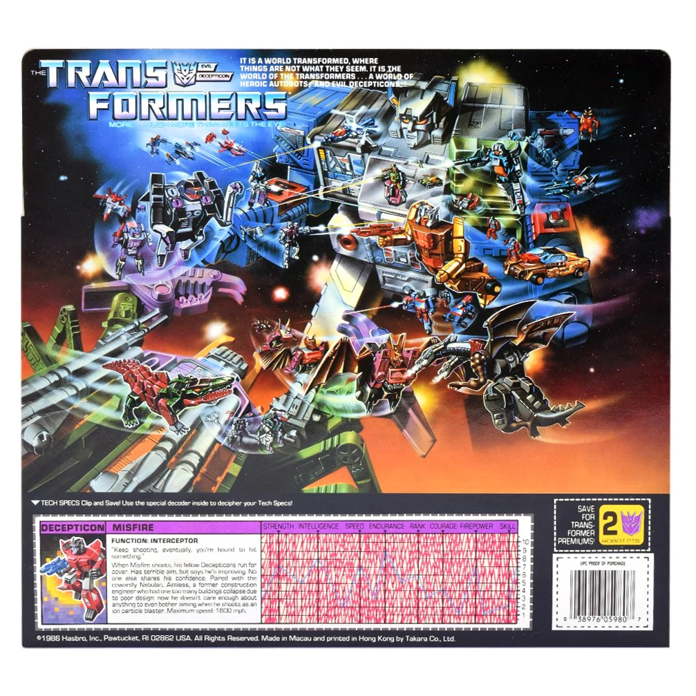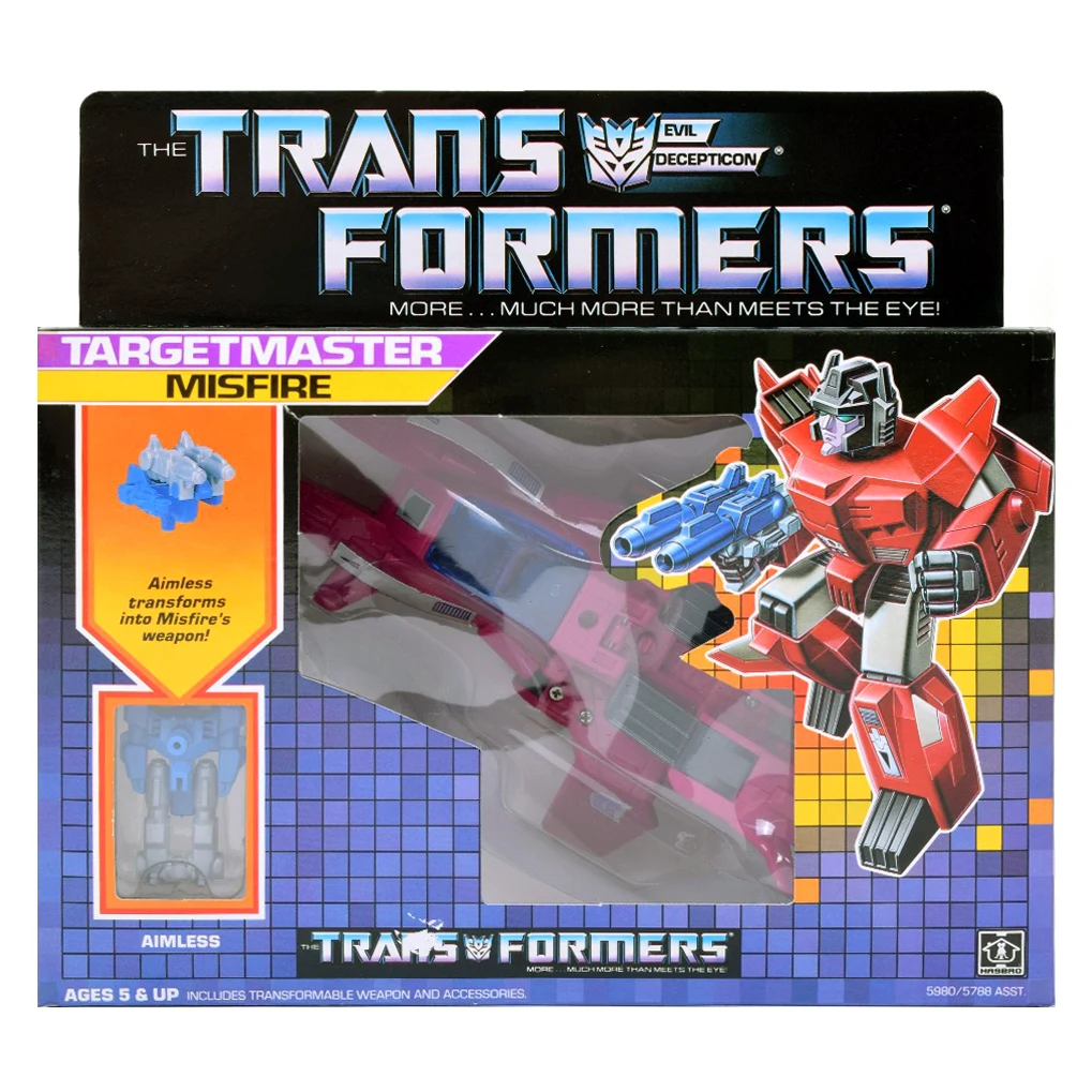 Misfire transforms into a pink Cybertronian car-jet thing that goes real fast. Hopefully he can steer better than he can aim. Funnily enough, unlike Triggerhappy and Slugslinger, Misfire is totally unarmed in vehicle mode unless Aimless is attached to him. Just as well, really. In robot mode, Misfire is one of the best articulated Targetmasters due to his clearly defined legs with hip and (however awkward) knee articulation coupled with good arm articulation, making him one of the small number of Generation 1 toys of this era that isn't a brick. Like the other Targetmasters, his Japanese release lacks a rubsign.