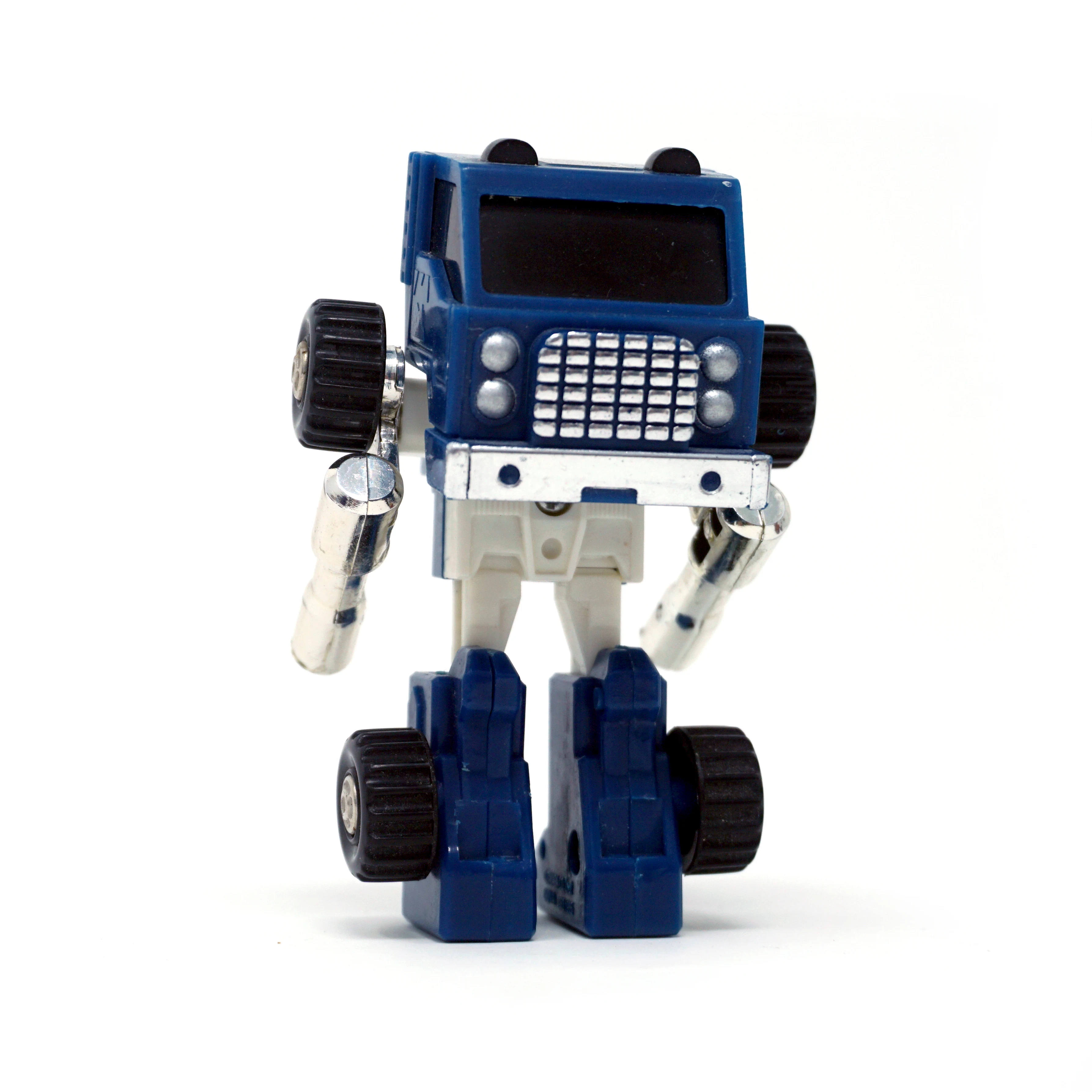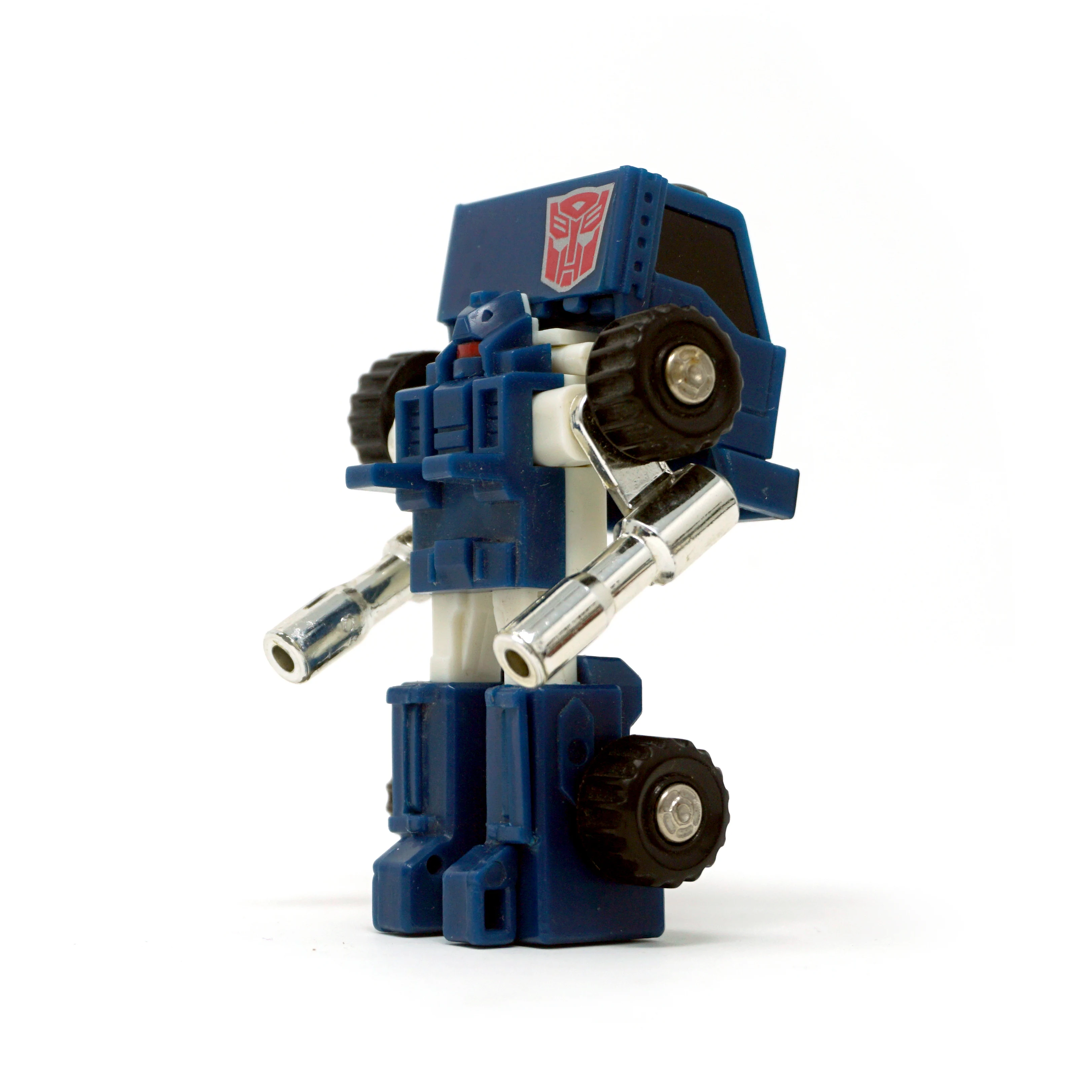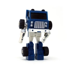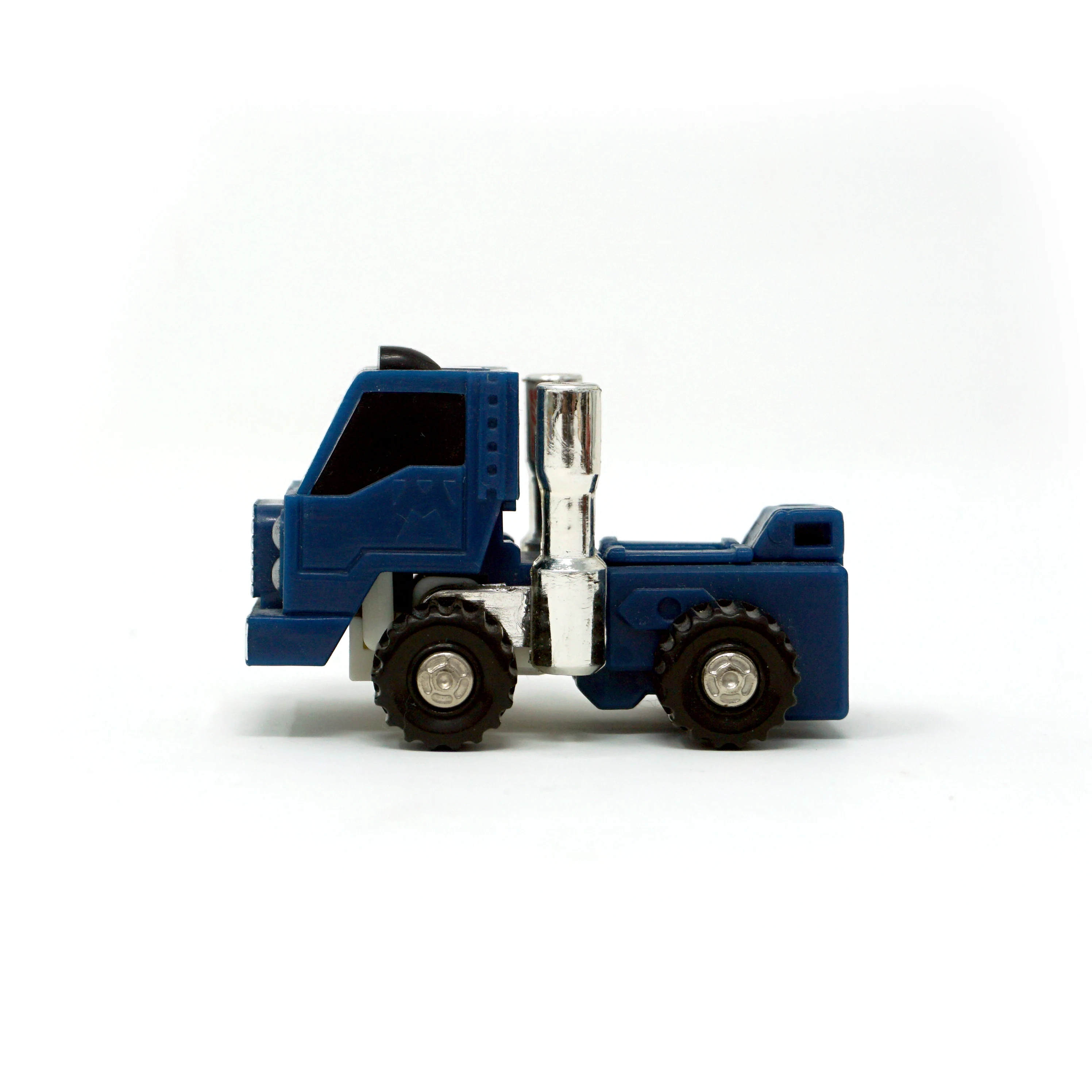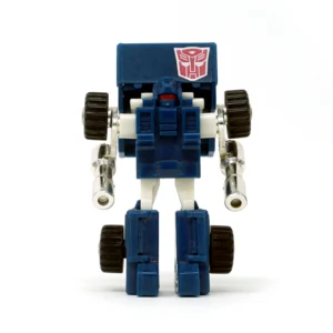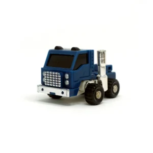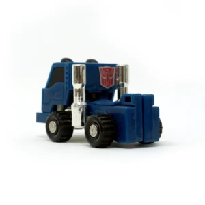 Pipes is a blue extensive retool of the 1984 Autobot Mini Vehicle Huffer. Like Huffer, Pipes transforms into an "American truck," which is supposed to be either a terminal tractor (also called a "yard truck," a "mule" and several other things) or a single-axle semi truck of indeterminate, probably made-up model. He is changed quite a lot; his front is Huffer's back and vice-versa, and his cab transforms differently. Whereas Huffer simply moves the truck cab up to reveal his head and then flips over the smokestacks for arms, Pipes flips the cab over, repositioning it behind his head instead of shelling it like a hood, and his arms just pull out from their truck position. Amusingly, the tabs that hold the truck cab in place, sticking out of his robot mode chest, are detailed to look like seats. The grille, headlamp and bumper detailing on the front of his cab has also changed, and the tips of his smokestacks are cylindrical rather than flattened-out like Huffer's claw-hand-things. In some European markets and Mexico, the toy released for Pipes was not a remolded Huffer toy, but rather a straight redeco (with an unaltered transformation) affectionately known amongst fans as "Puffer". This version of Pipes was later repurposed as Shattered Glass Pipes.