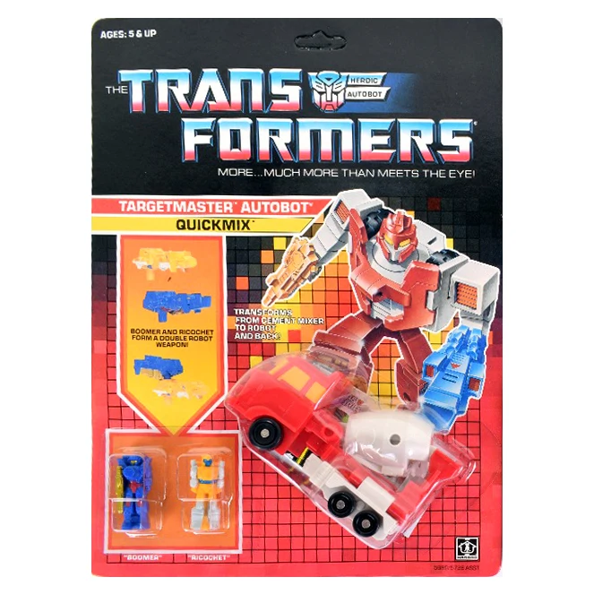 Quickmix transforms into a red and off-white cement mixer truck, a rarity in Transformers and very rare amongst the Autobots in Generation 1. While Landfill received painted chrome on his wheel rims, Quickmix gets this paint on his headlights. The mixing drum does not spin due to his unusual robot mode design. Boomer and Ricochet (or any other accessories with handle pegs of the correct size) can be mounted on either side of his (immobile) mixing drum. The most remarkable aspect of Quickmix's robot mode is the fact the mixing drum forms the majority of his upper torso. Boomer and Ricochet can become two separate handguns, or either can attach to the rear of the other gun to form a single rifle. No version of this character or mold was released in Japan.