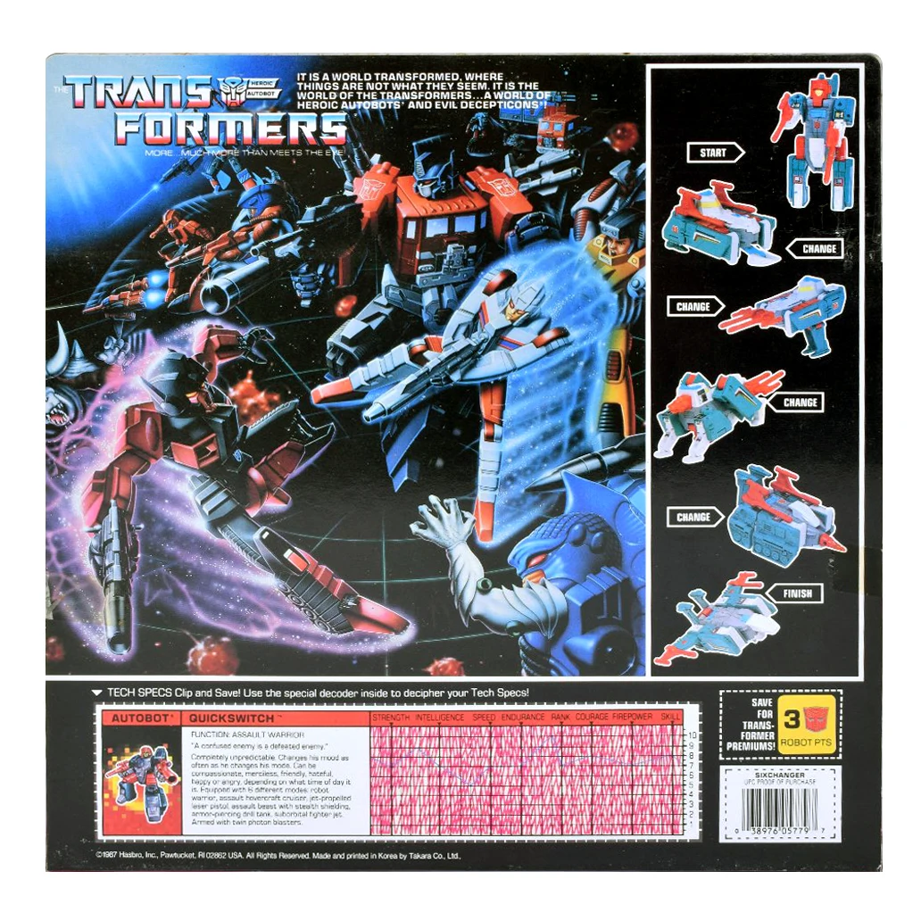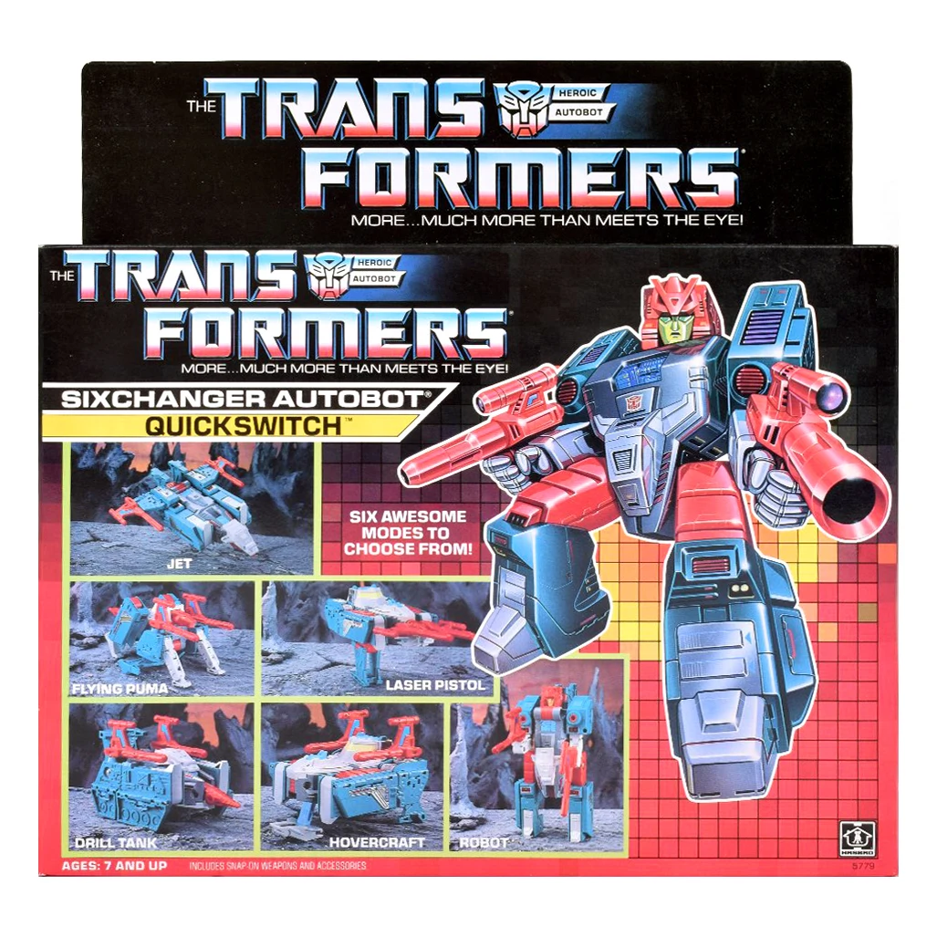 Quickswitch is the second "Six Changer" in the series. Besides his basic form as a humanoid robot, he turns into a Cybertronic jet, drill tank, laser pistol, hovercraft and a flying puma. His armament of choice is a pair of (non-firing) photon blasters, which he uses in many of his modes. Despite being relatively well articulated due to his various transformations, all of his modes are kinda blocky. His robot mode suffers from odd proportions, making him look like he's wearing a full diaper. The same mold was used in Japan to make Sixknight.