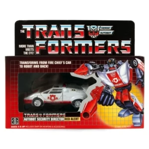 Red Alert is a redeco of the Diaclone "New Countach LP500S Police Car", which was itself a retool of the original Diaclone "New Countach LP500S" that added roof lights to the figure's Lamborghini alternate mode. Rather than a police car like the original figure, Red Alert's new paint job recasts him as a fire chief's car—a rather dubious disguise, all told, Lamborghinis not exactly being affordable vehicles for fire departments to use. He comes with a hand-held particle beam rifle, and a rocket launcher that clips onto his shoulder. The Hasbro release disabled the launcher's spring-loaded missile-firing mechanism, but it was reinstated for Takara's release of the he toy. Red Alert's toy has been reissued several times; each reissue is listed separately below. Red Alert was also redecoed to make Clamp Down, who was an homage to the mold's original police deco, while the original version of the mold was used to make Sideswipe, Deep Cover, Tigertrack, and Generation 2 Sideswipe.