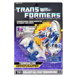 Rippersnapper transforms into a weird upright bipedal shark creature. His finned twin missile launcher weapon mounts on his back in this mode. He can form the leg or arm of any Scramble City-type combiner, though he is nominally Abominus' left arm. He can also attach to Metroplex's robot mode. There is a variant of Rippersnapper which does not have the rubsign indent.